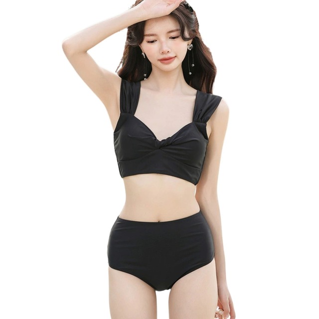 「気になるお腹をカバー!」もう体型を気にせず、思いきり夏を楽しみたい。そんな方におすすめの、ハイウエストビキニボトム。ぽっこりお腹や腰回りを優しく包み込み、締め付けすぎずにスッキリ見せ。視線を上に引き上げることで自然と脚が長く見え、全身バランスが整います。美シルエットを演出するこの設計は、初めての水着にもぴったりな“安心の1着”です。 「ズレにくいタンクトップ型トップス!」水辺ではしゃぎたいけど、露出やズレが気になる…。そんな声に応えるのが、しっかりホールド感のあるタンクトップ風トップス。肩から胸元までフィットし、ジャンプやスイミングでもズレにくく安心。ビーチバレー、マリンスポーツ、サーフィンなど、動きの多いアクティビティでも快適&おしゃれに着こなせます。アクティブ女子の頼れるパートナーに。 「飽きのこないシンプル美!」ファッションの定番「ブラック」だからこそ、上質さと安心感を兼ね備えたデザイン。無地ならではのシックな印象が、大人の魅力を引き出します。どんな色の羽織、ビーチバッグ、アクセサリーとも相性が良く、リゾートでも温泉でも場所を選ばず大活躍。1着持っておくと何年も着回せる、タイムレスでコスパの高い水着! 「完璧なフィット感!」ボトム両側には可愛さと実用性を兼ねたリボン付き。ギャザーを調整することで丈感の変化を楽しめ、自分の体型や気分に合わせたスタイリングが可能に。太ももが気になる時は長めに、足を見せたい時は短めに調整して、自信の持てるシルエットを演出。人とかぶらない、ちょっとした“遊び心”が大人女子に大人気です。 「夏のすべての場面にマッチ!」海水浴やプールはもちろん、温泉旅行、南国リゾート、女子旅など幅広いシーンで活躍。シンプルだからこそ、カーディガンやリゾートワンピを羽織れば街中でも自然なスタイルに。「写真映え」も、「機能性」も、「着心地」も妥協したくないあなたに選ばれている、夏の万能アイテムです。