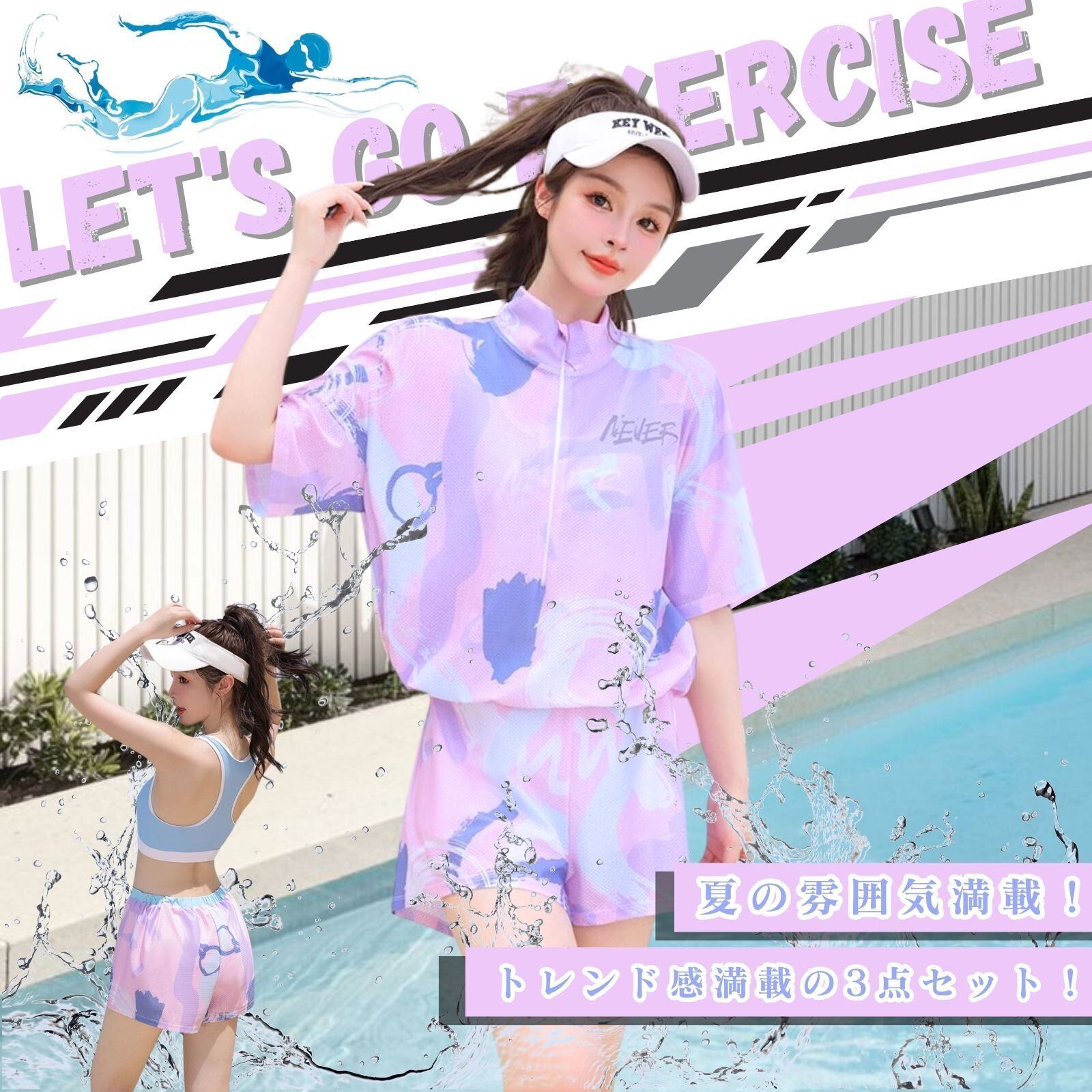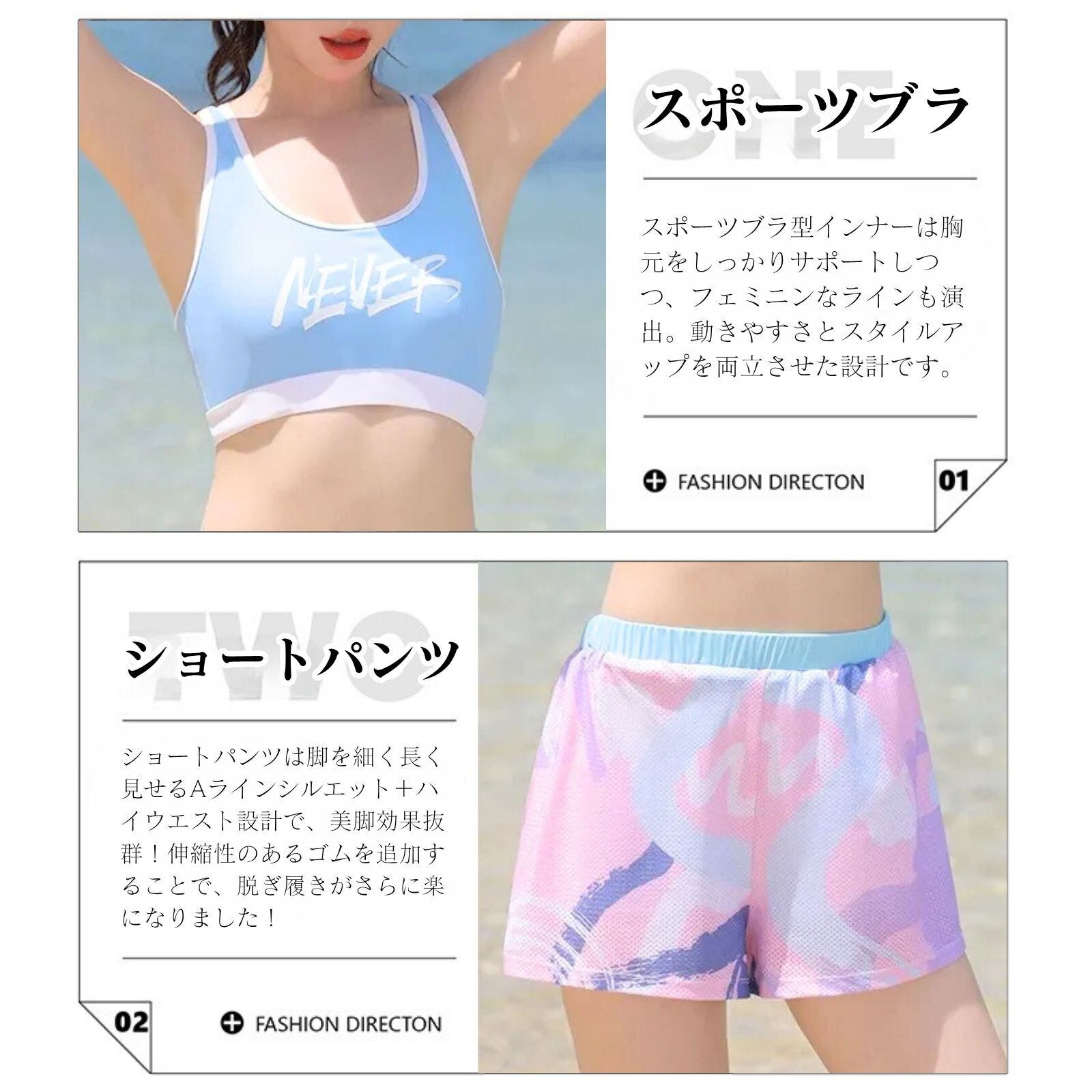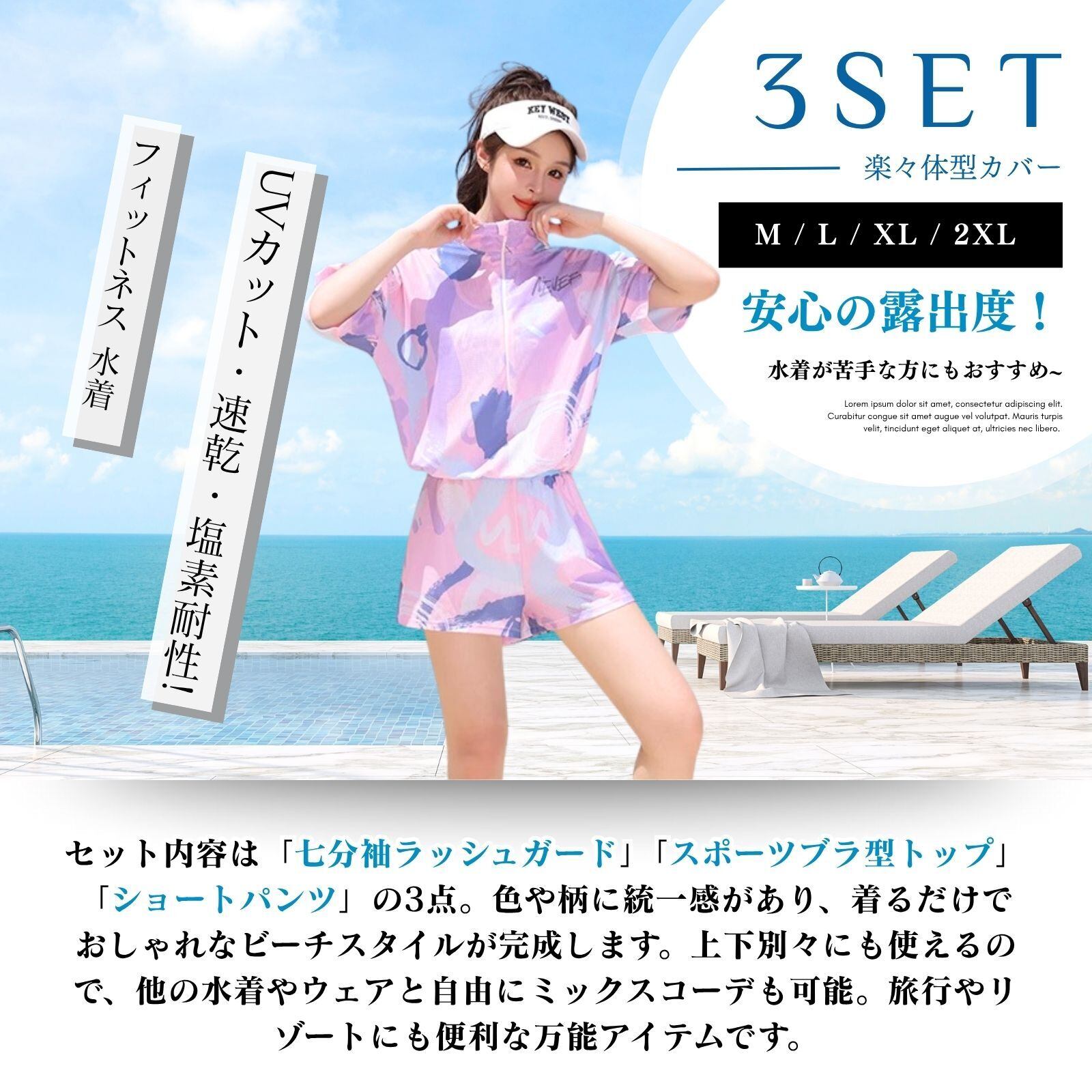 「トレンド感満載の3点セット!」セット内容は「七分袖ラッシュガード」「スポーツブラ型トップ」「ショートパンツ」の3点。色や柄に統一感があり、着るだけでおしゃれなビーチスタイルが完成します。上下別々にも使えるので、他の水着やウェアと自由にミックスコーデも可能。旅行やリゾートにも便利な万能アイテムです。