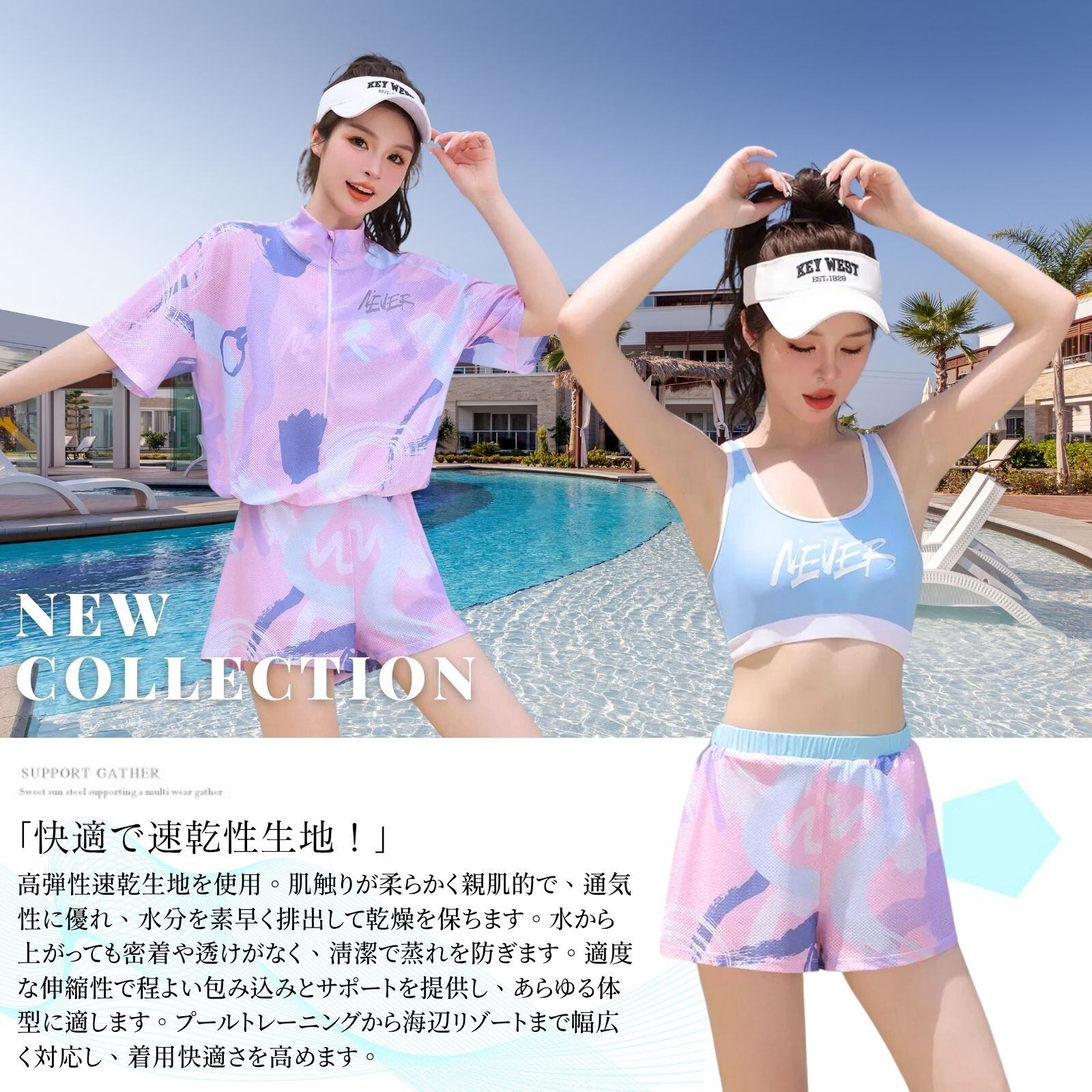 「シーンを選ばない水陸両用デザイン!」水着としてだけでなく、ジム・ヨガ・ジョギングなど、陸上でのスポーツやアウトドアにも活躍。短パンは通気性がよく、ルームウェアとしても使える快適さ。1セットでビーチからタウン、アクティビティまで幅広く対応するため、旅行用・プレゼント・家族でのリンクコーデにもおすすめです。