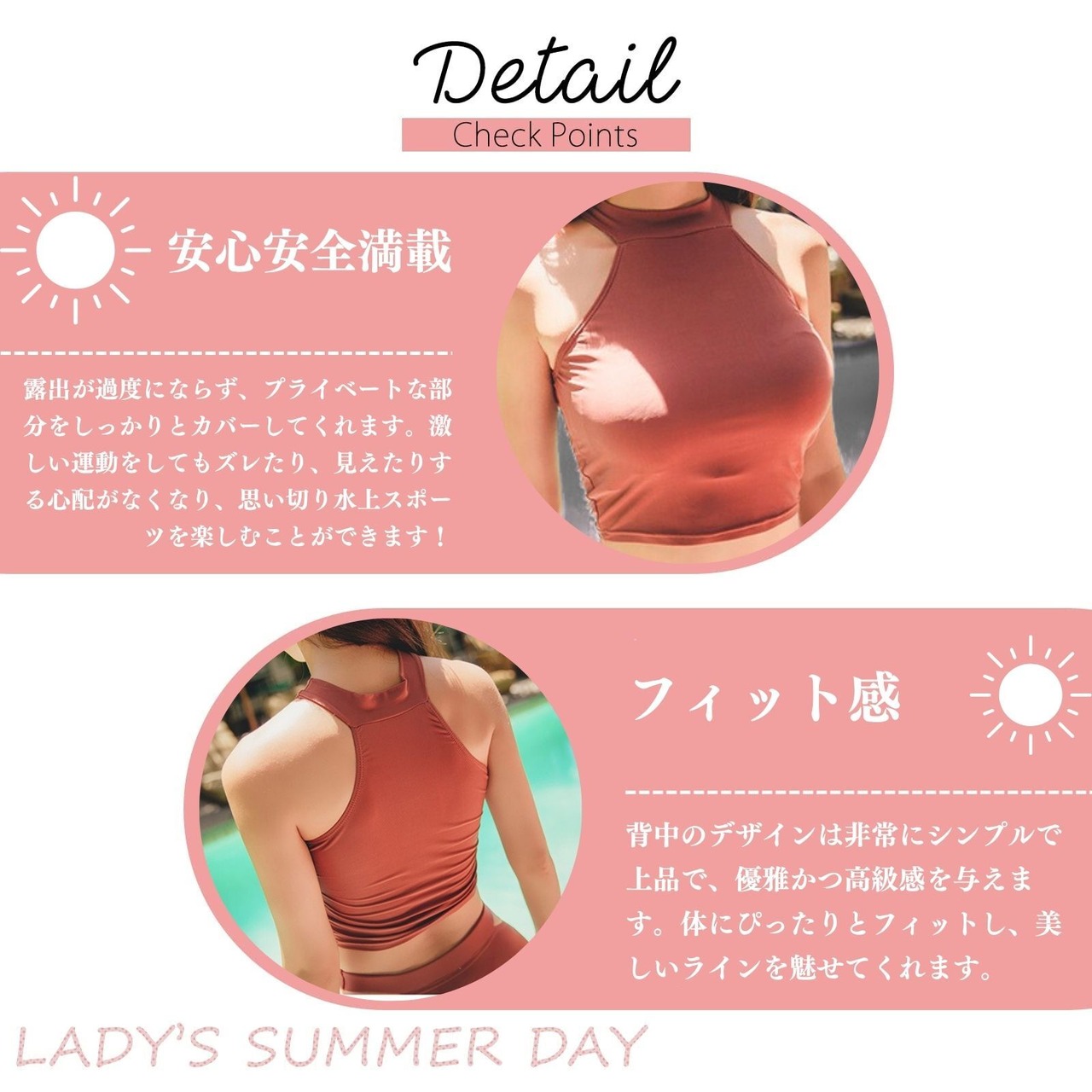 「動きやすさとフィット感!」トップスはスポーツ風のタンクトップデザインで、胸元や肩まわりをしっかりホールド。ビーチやプールだけでなく、ビーチバレーやリゾート地のアクティビティなど、体を動かすシーンでもズレを気にせず安心して楽しめます。ノンワイヤー設計で締め付け感がなく、着心地も軽やか。裏地付きなので、透け感の心配もありません。
