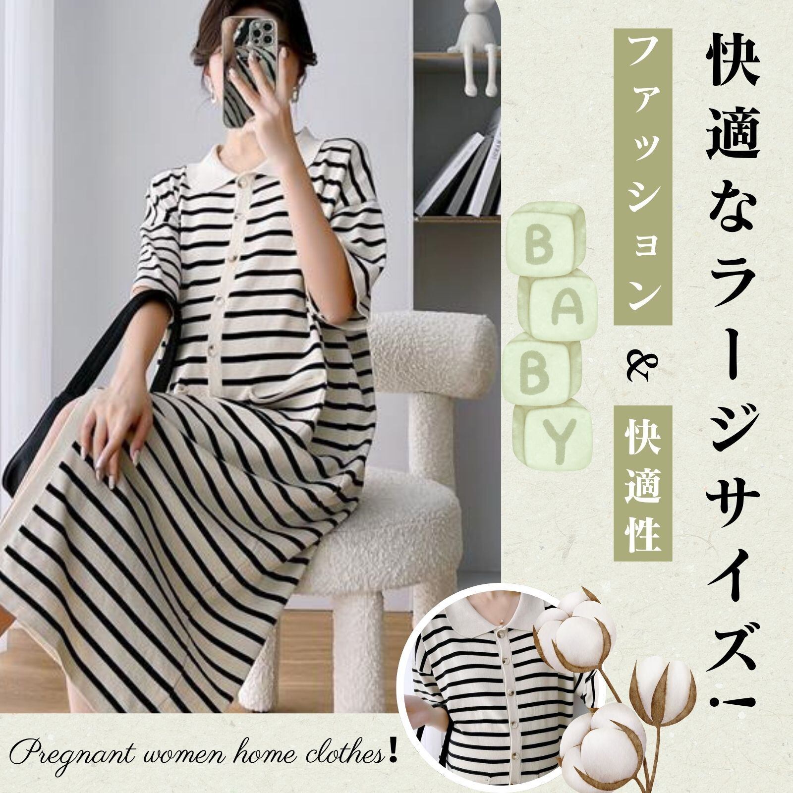 「快適で肌に優しい生地!」優質な肌にやさしい生地を厳選しており、例えば柔らかい綿混紡素材は、繊細な触感でまるで第二の肌のようにやさしく肌に密着します。優れた通気性と吸湿性を備えており、汗を素早く吸収して常にさらさらと快適な状態を保ち、妊娠中の敏感肌を大切に守ります。長時間着用しても肌に負担を与えず、お母さまとお赤ちゃまのために優しいケアを提供します。