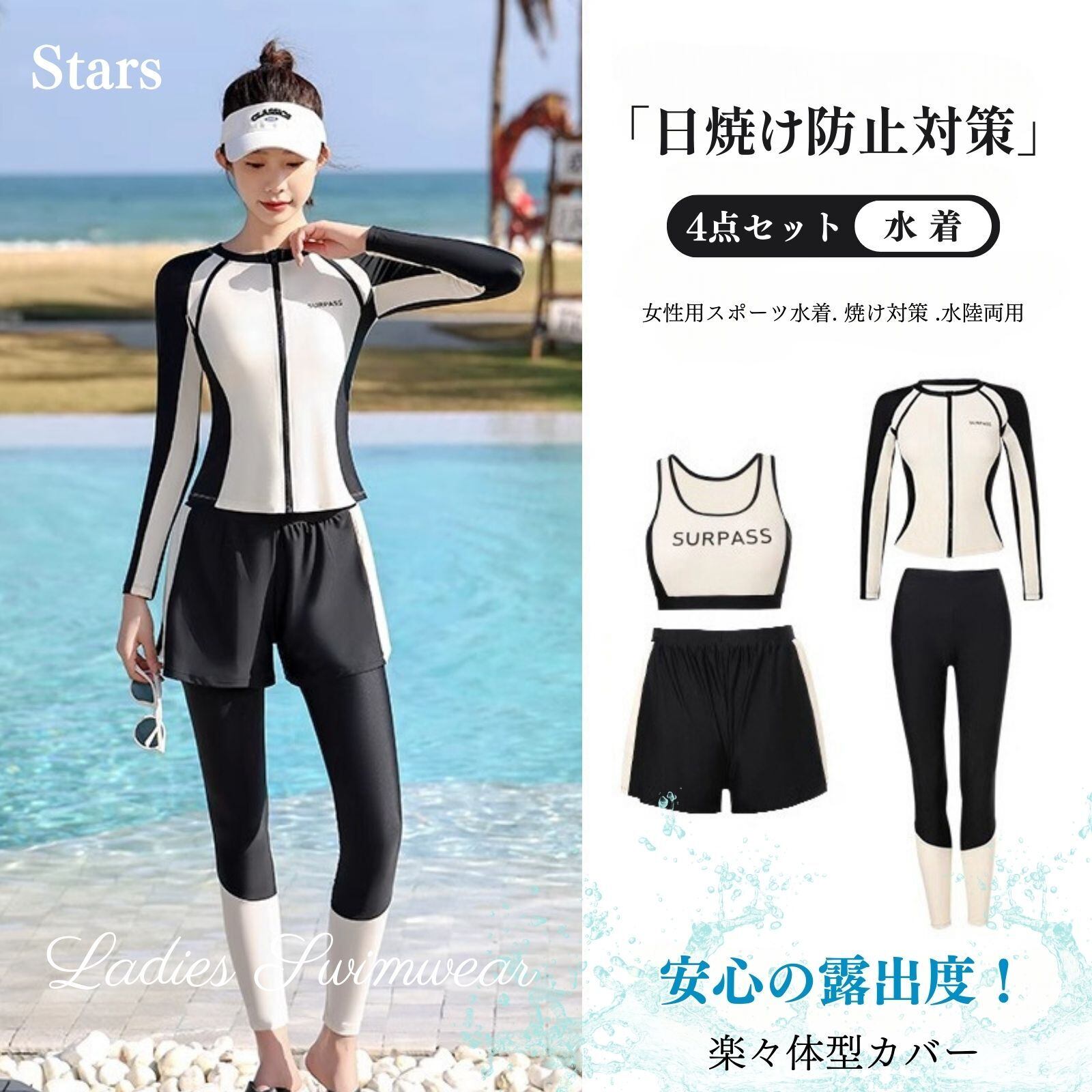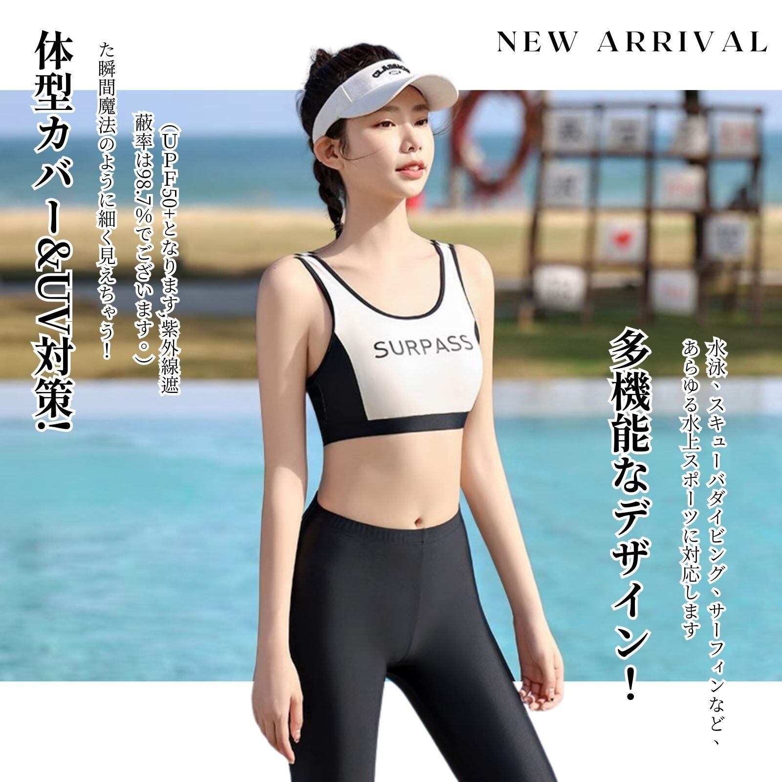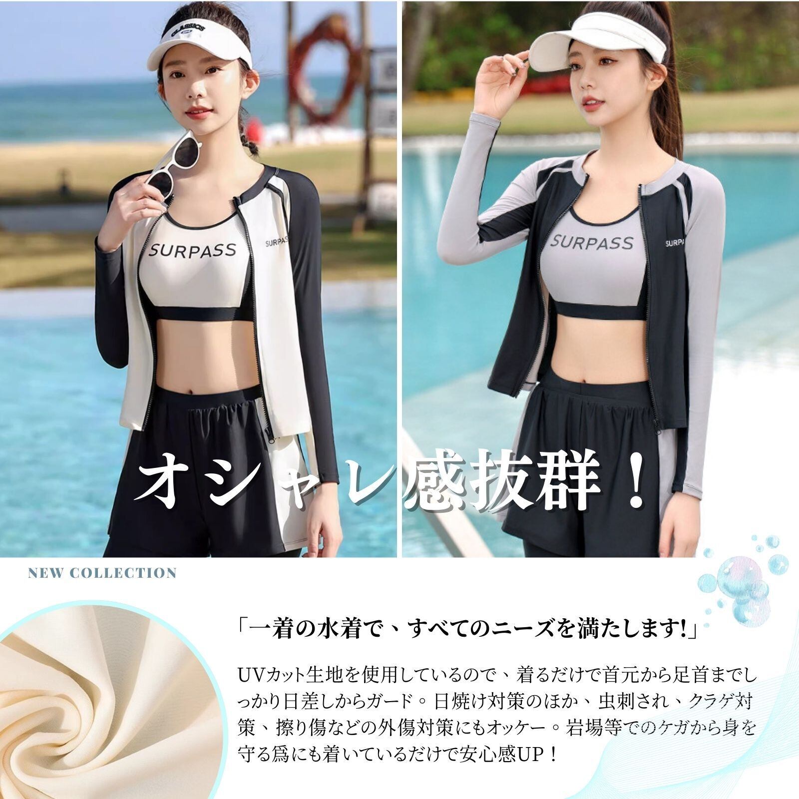 「一着の水着で、すべてのニーズを満たします!」4点セット内容:長袖ラッシュガード+スポーツブラ+サーフィンパンツ+レギンス。UVカット生地を使用しているので、着るだけで首元から足首までしっかり日差しからガード。日焼け対策のほか、虫刺され、クラゲ対策、擦り傷などの外傷対策にもオッケー。岩場等でのケガから身を守る為にも着いているだけで安心感UP!