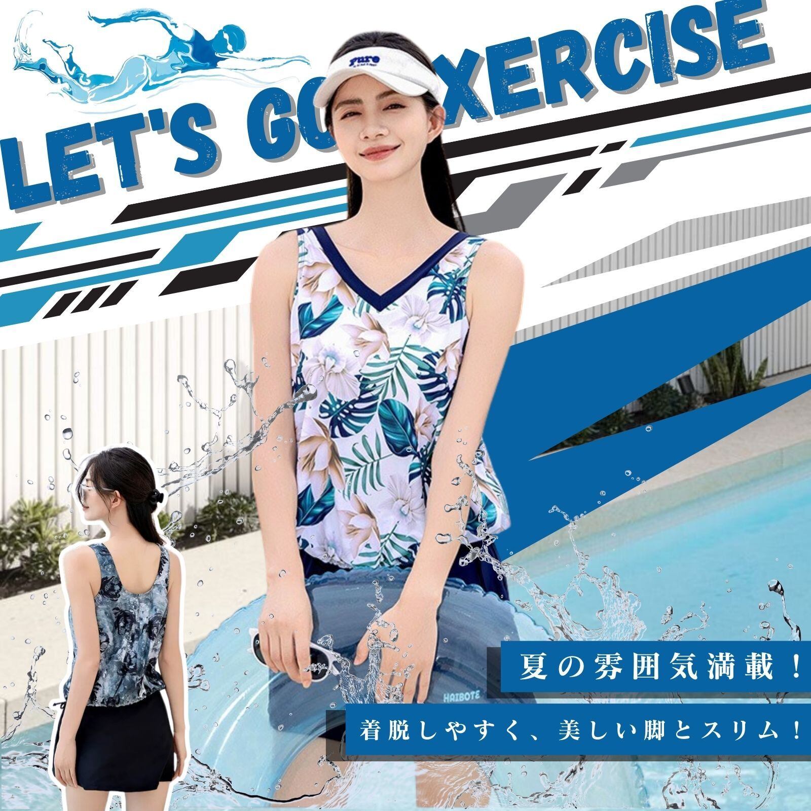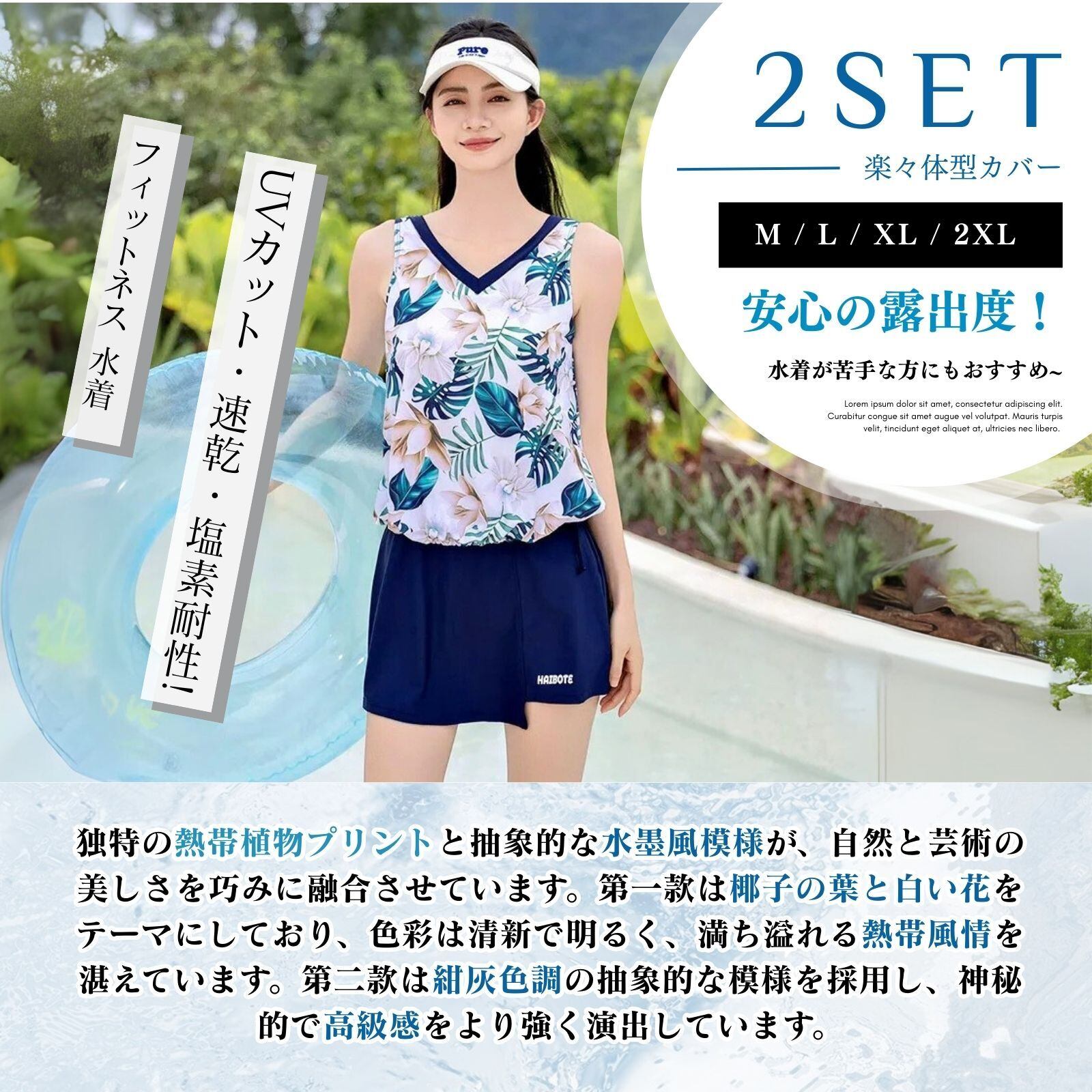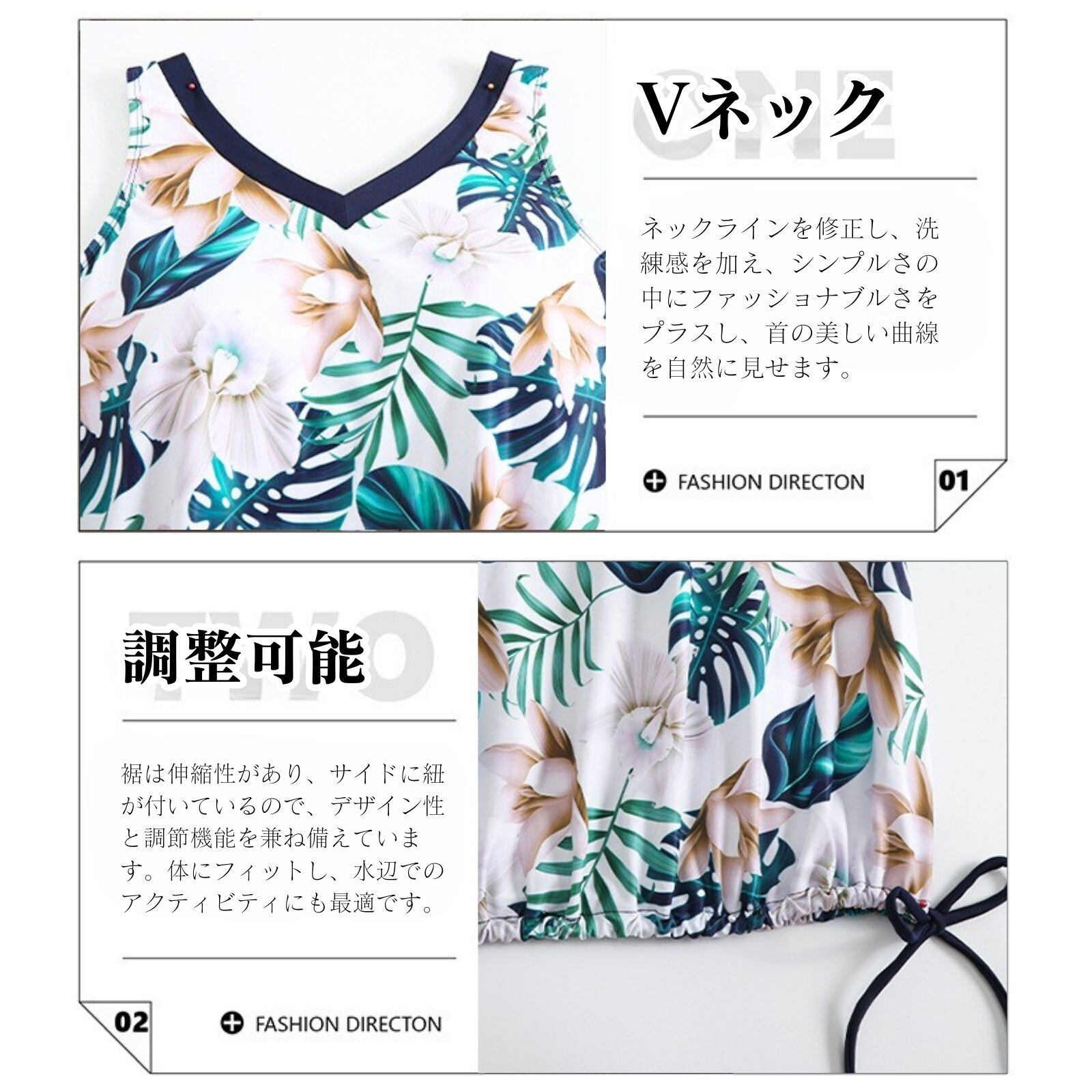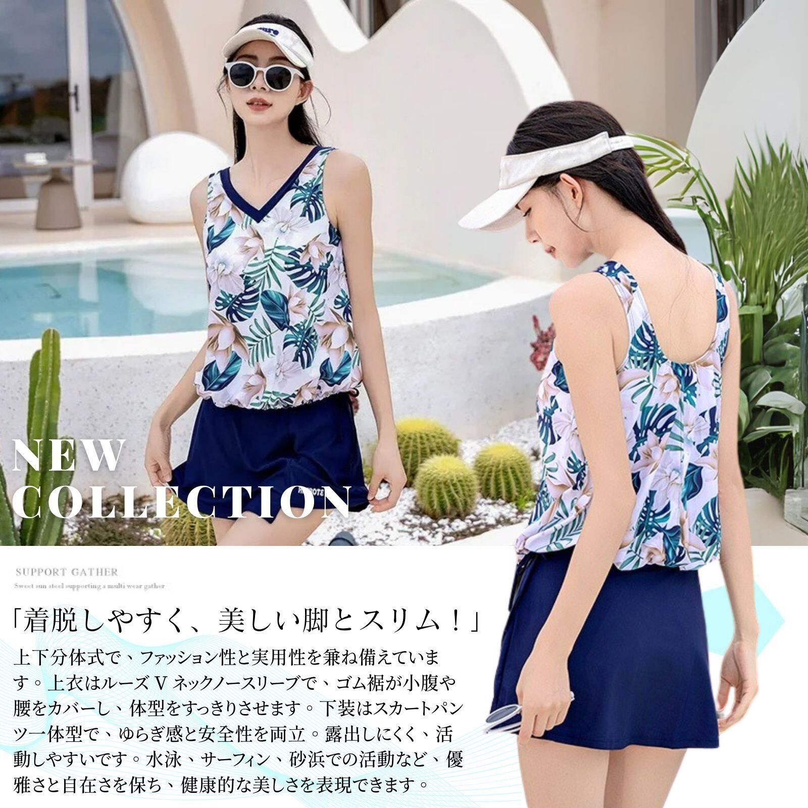 「着脱しやすく、美しい脚とスリム!」上下分体式で、ファッション性と実用性を兼ね備えています。上衣はルーズ V ネックノースリーブで、ゴム裾が小腹や腰をカバーし、体型をすっきりさせます。下装はスカートパンツ一体型で、ゆらぎ感と安全性を両立。露出しにくく、活動しやすいです。水泳、サーフィン、砂浜での活動など、優雅さと自在さを保ち、健康的な美しさを表現できます。