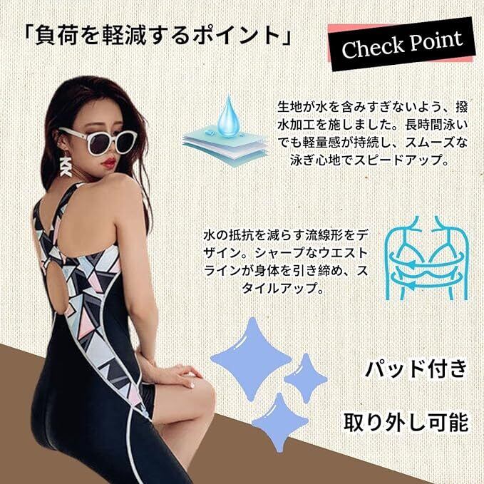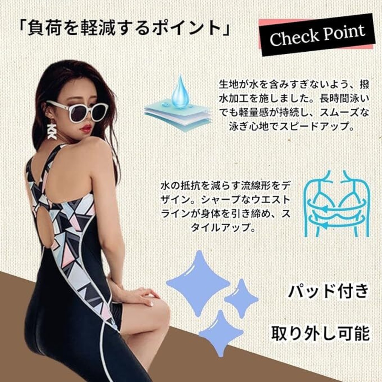 【水中での負荷を軽減するポイント2つ】 ①生地が水を含みすぎないよう、撥水加工を施しました。長時間泳いでも軽量感が持続し、スムーズな泳ぎ心地でスピードアップ。 ②水の抵抗を減らす流線形をデザイン。シャープなウエストラインが身体を引き締め、スタイルアップ。