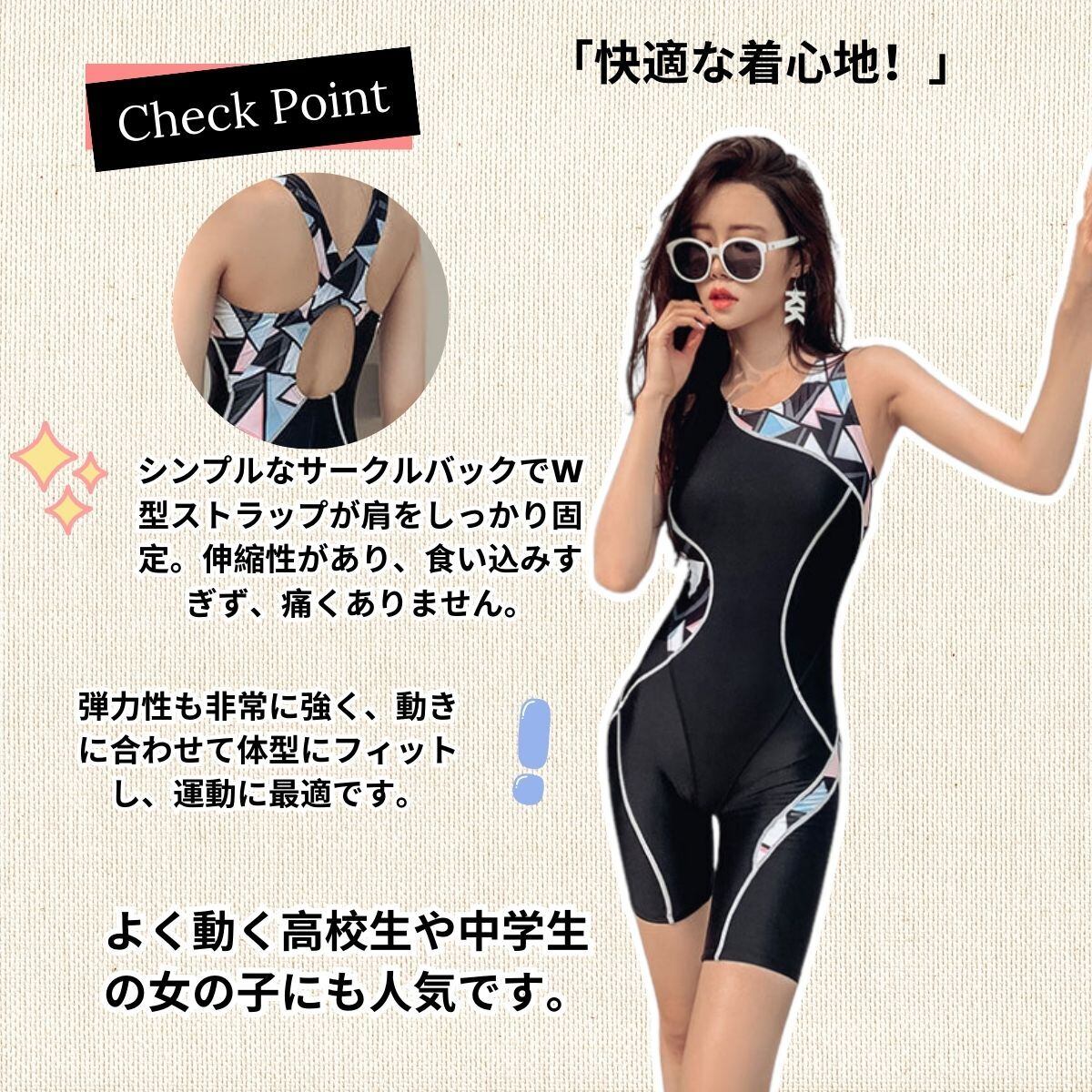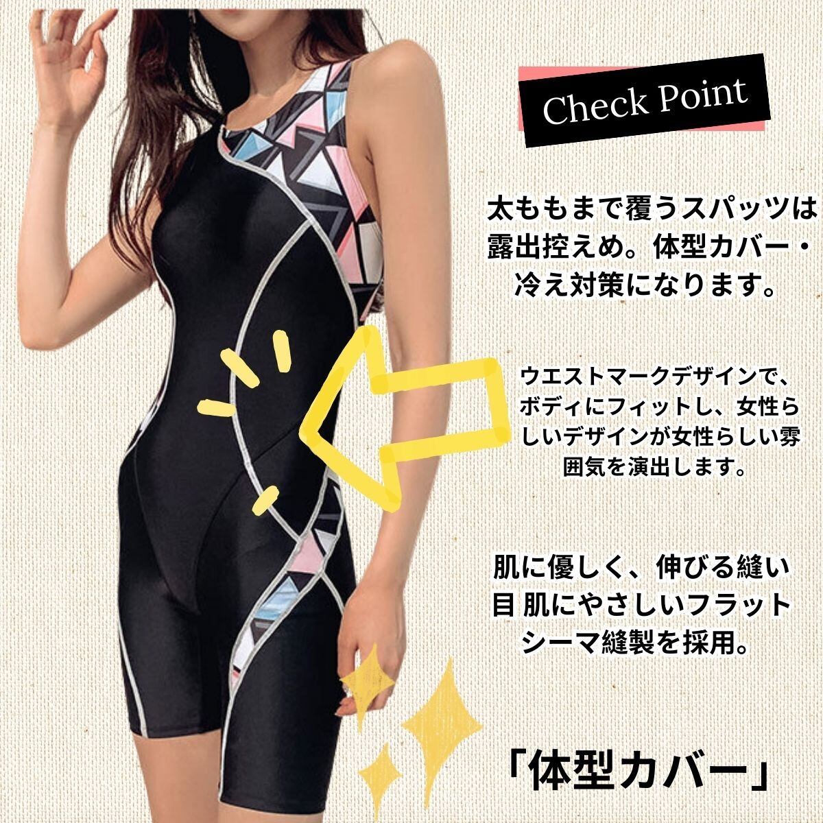【女性に嬉しい4つの特徴】 ①厚みのある、しっかりした生地で透ける心配がありません。 ②太ももまで覆うスパッツは露出控えめ。体型カバー・冷え対策になります。 ③取り外しできるパッド付き。バストに合わせて調節できます。 ④ズレにくいW型ストラップで動き邪魔せず、肩をしっかり固定。