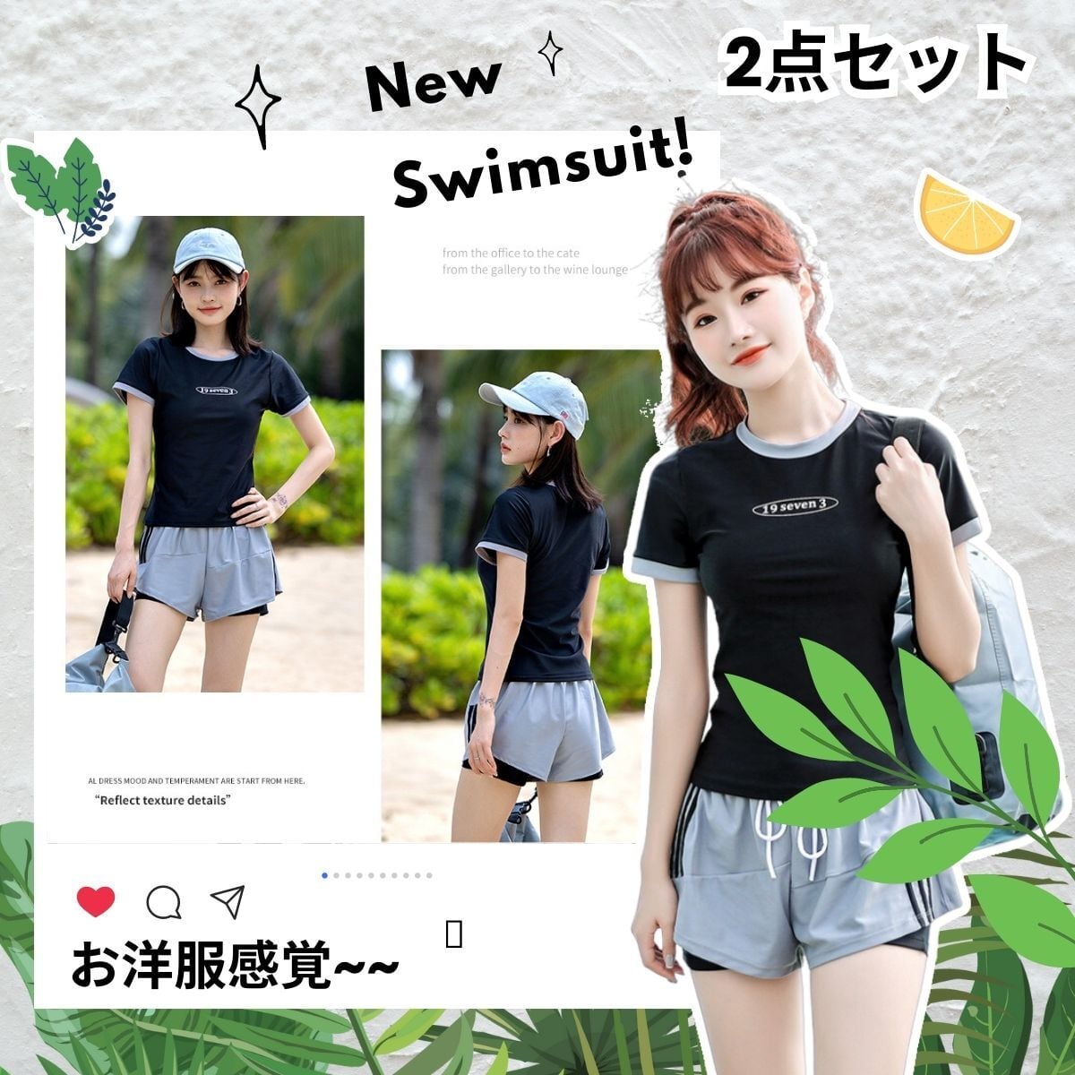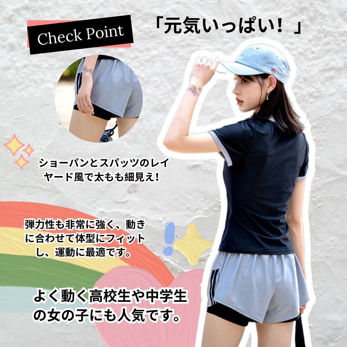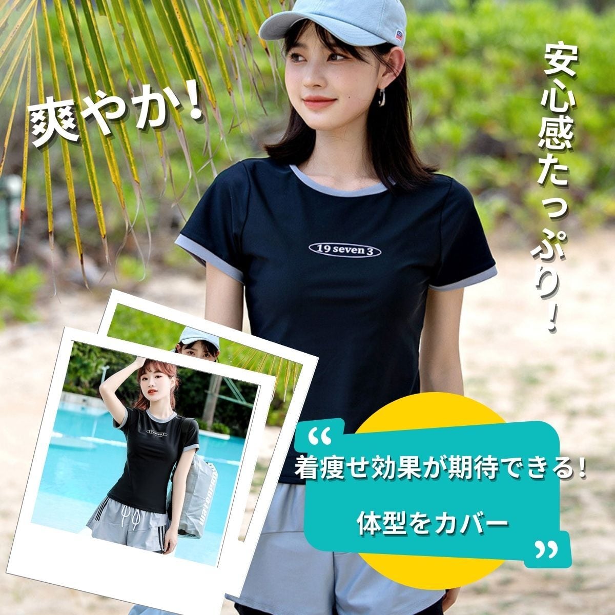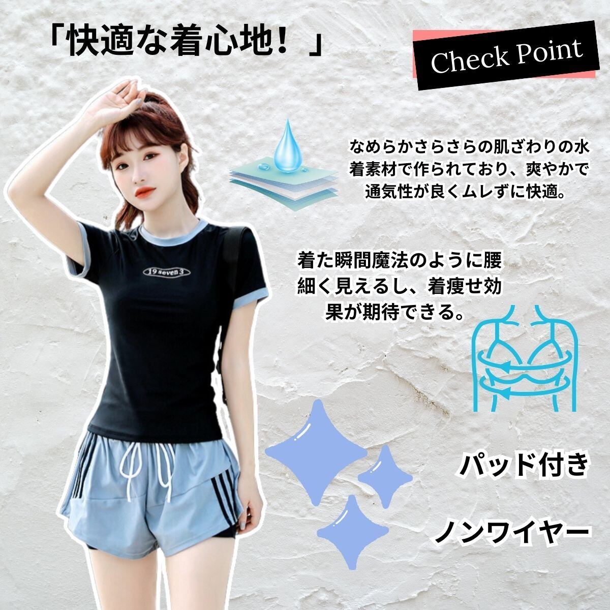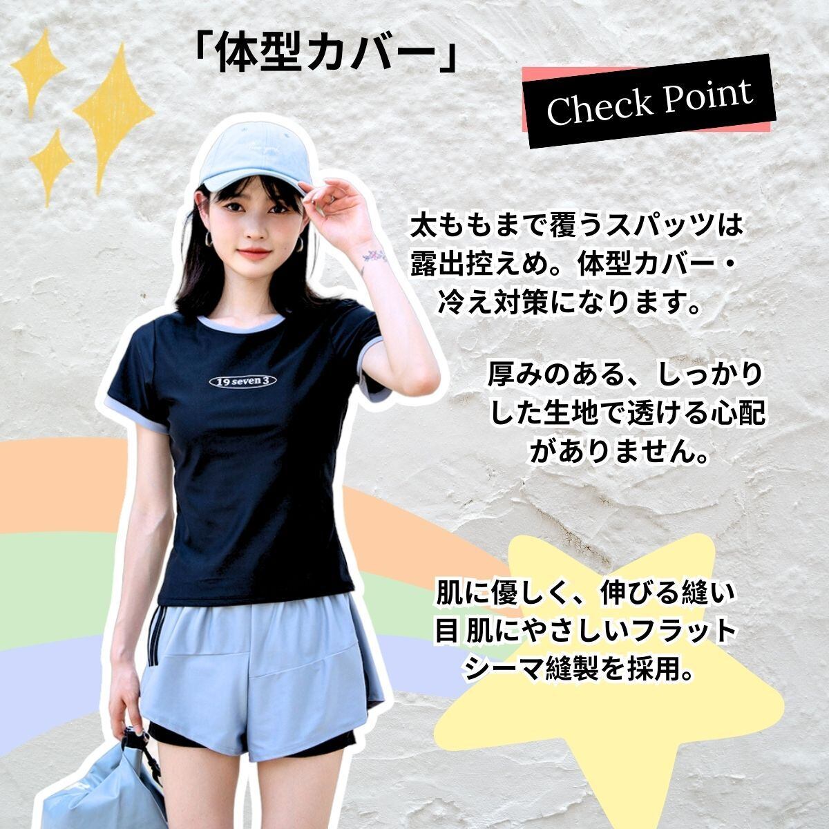 【水着が苦手方々にオススメ!】水着のイメージはあまり強くなく、スウェットスーツのような感じなので、水着が苦手な人にオススメです。露出しすぎず、シャイな女の子なら自信を持って着られます!tシャツのデザインが、自然な体型をカバーし、気になるお腹や太ももをしっかりカバーしてくれます。