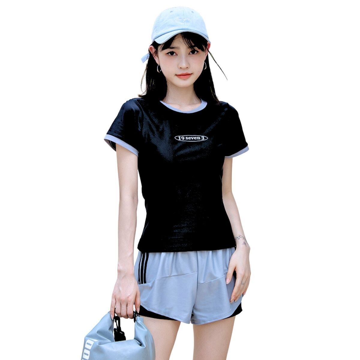 水着 レディース 体型カバー 2点セット タンキニ セパレート スポーティー水着 フィットネス 水着 半袖ラッシュガード ショートパンツ 上下セット 水陸両用 スポーツ風 学生 20代 速乾性 練習用 | swimstar
