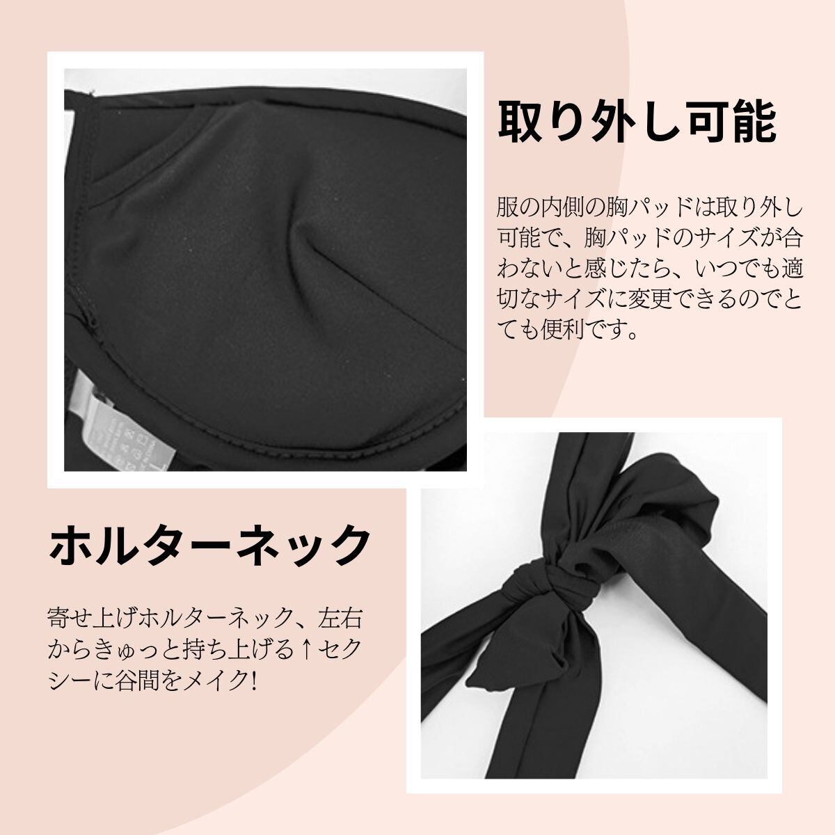 【内部構造】服の内側の胸パッドは取り外し可能で、胸パッドのサイズが合わないと感じたら、いつでも適切なサイズに変更できるのでとても便利です。肌に優しく、伸びる縫い目 肌にやさしいフラットシーマ縫製を採用。甘すぎないデザインなのでシンプル派や大人にもおすすめです。