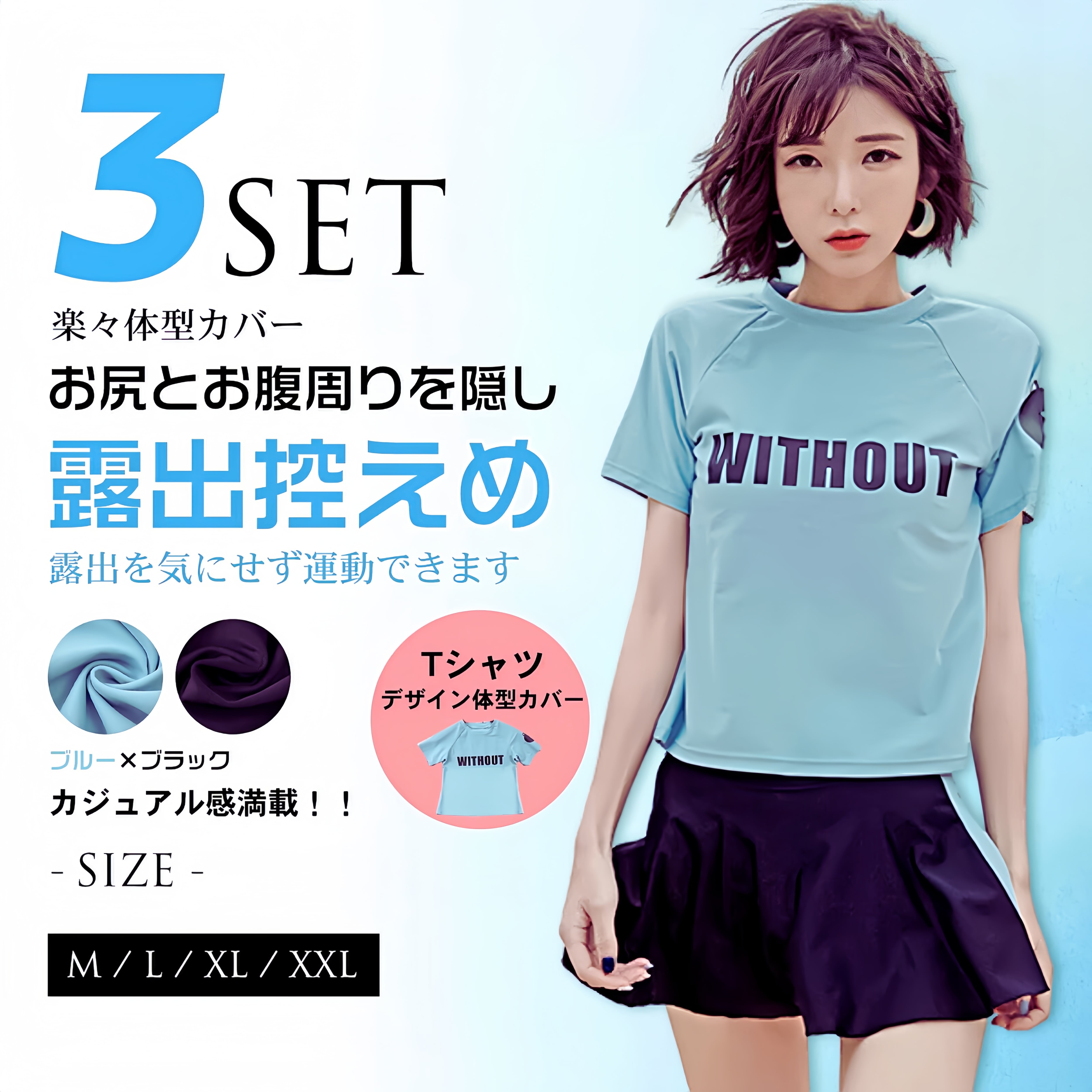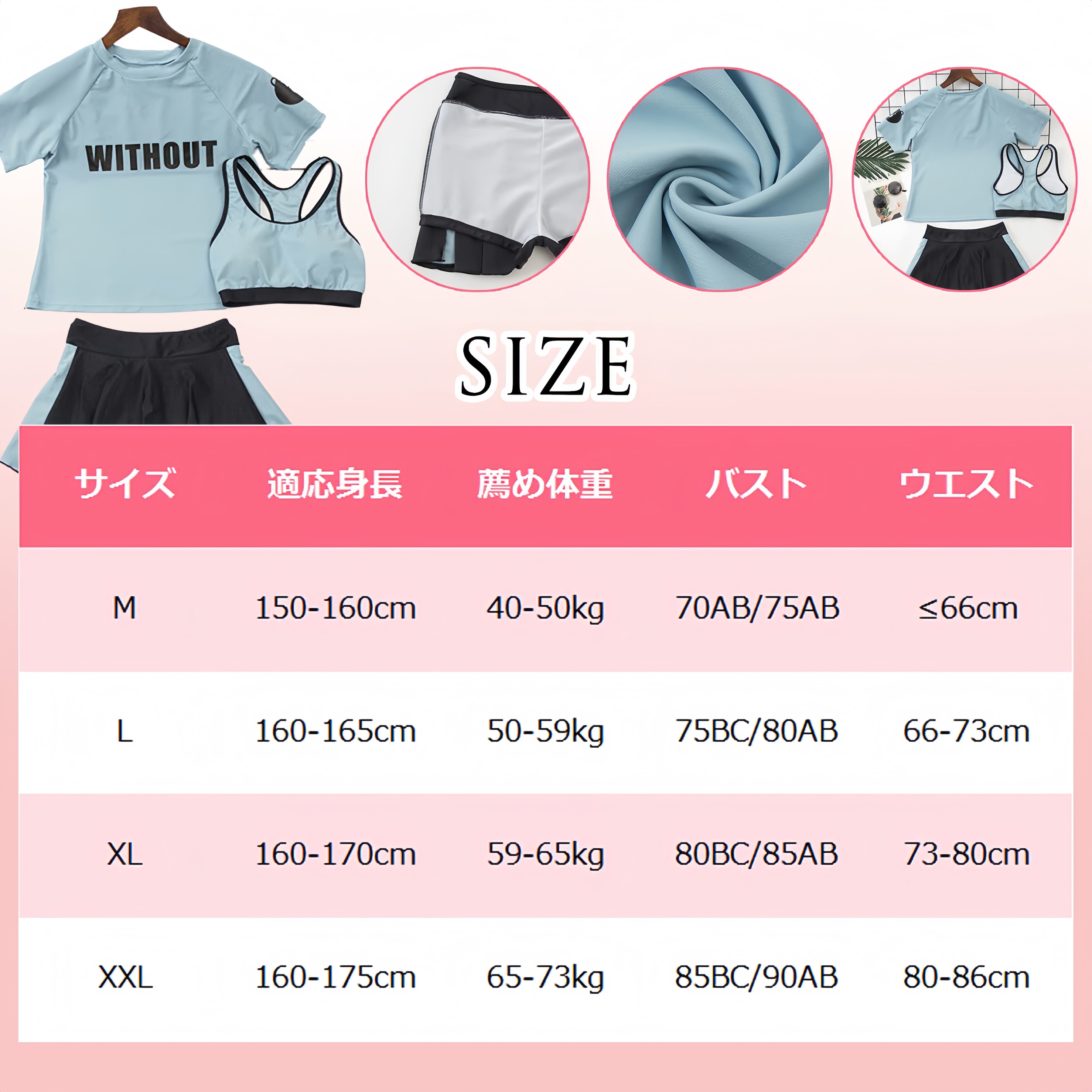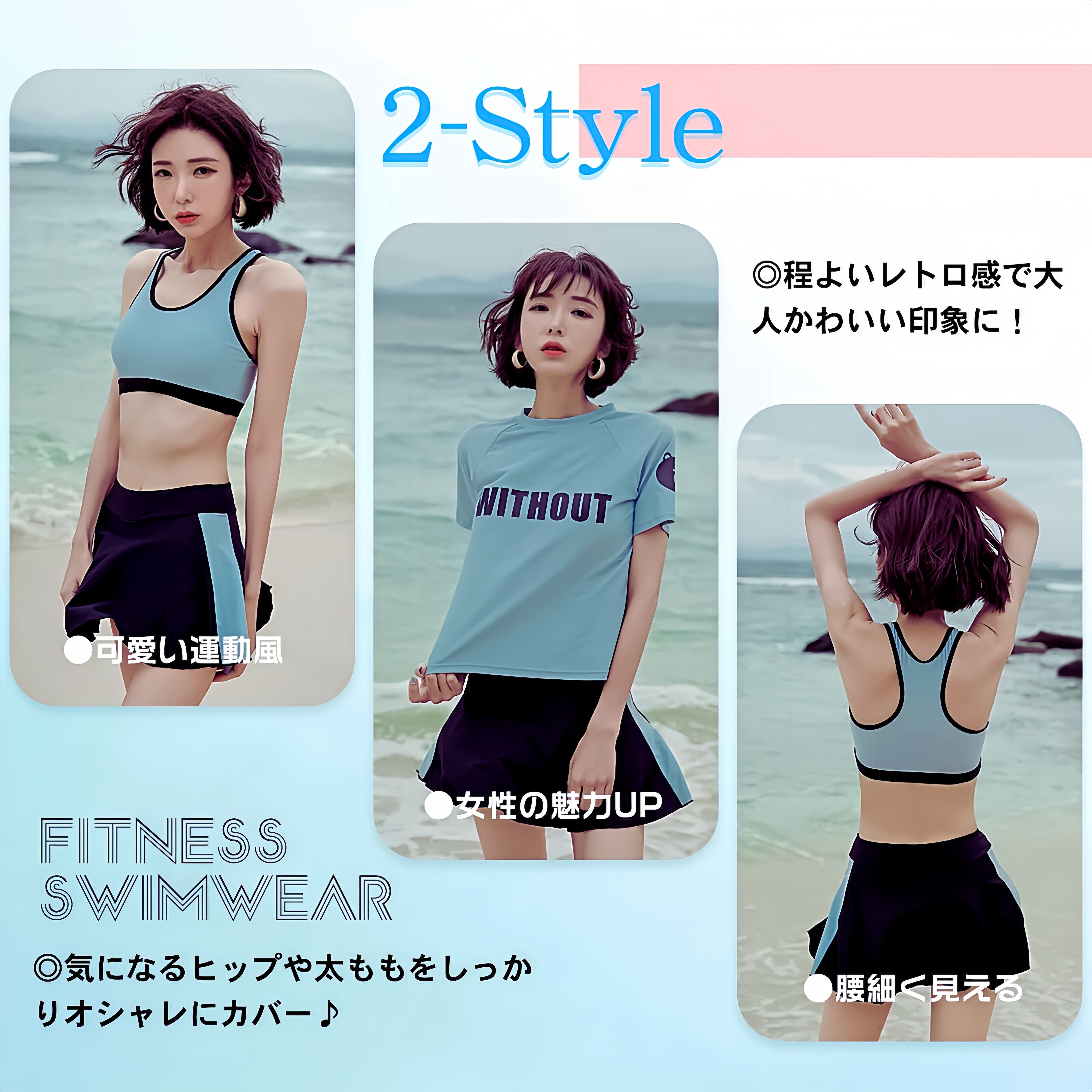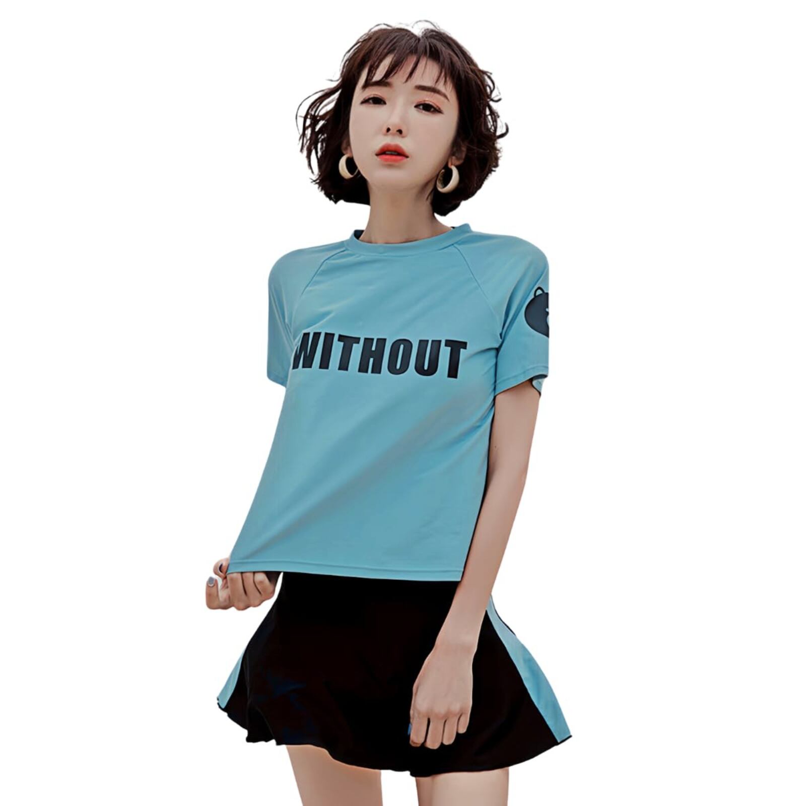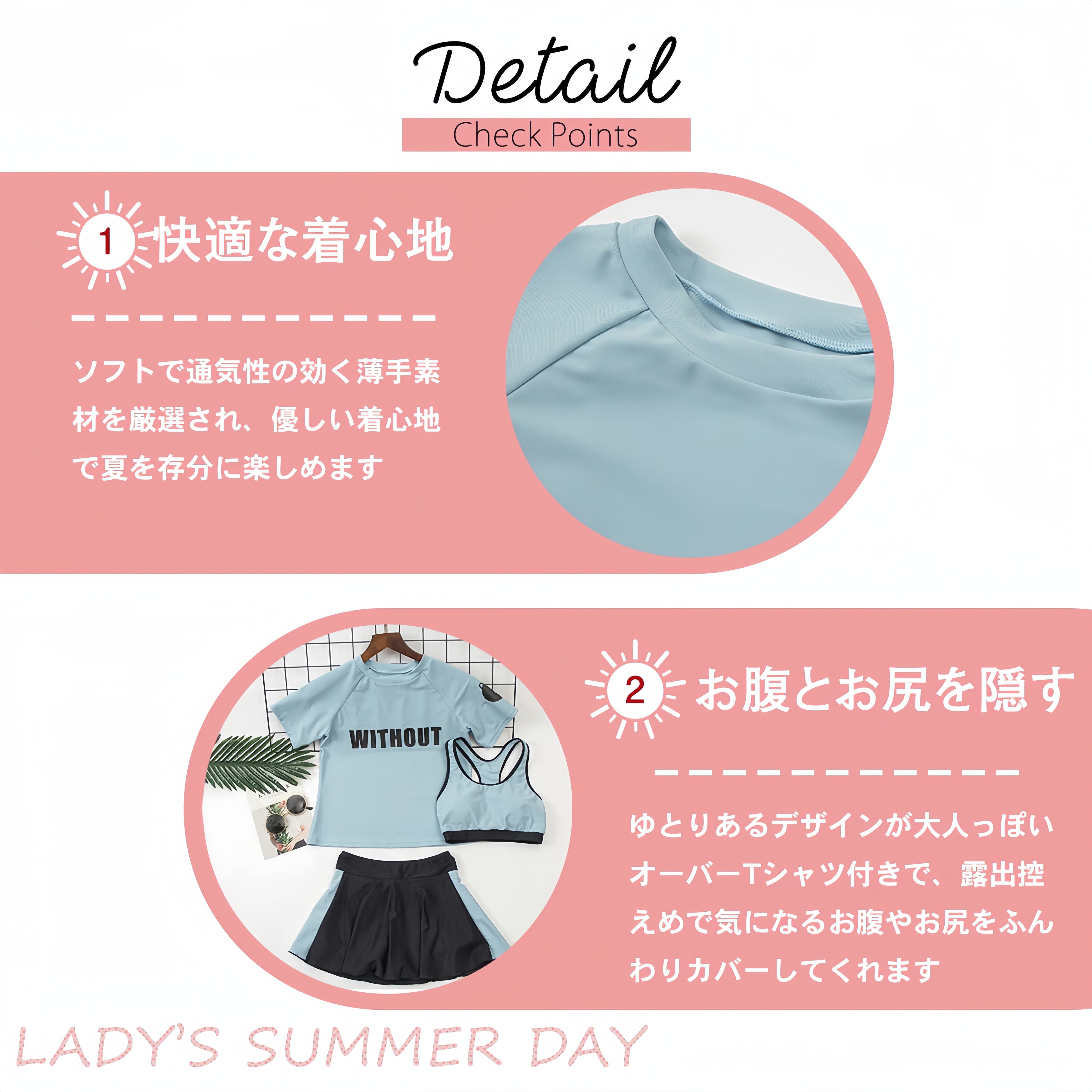 【可愛いスポーツ風水着!女子力UP!】普段部活などスポーツをされていて半袖の日焼けが気になる方でも、普通の水着はセクシーすぎて抵抗がある方でも!ゆとりあるデザインが大人っぽいオーバーTシャツ付きで、水辺でもいつものスタイルで楽しめます。よく女学生にも人気です♪シンプルな配色デザインがカジュアル感満載します。