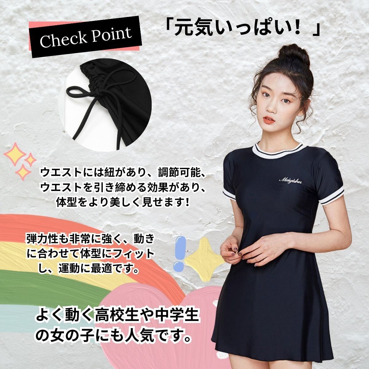 【美少女にオススメ!】柄が多すぎないとても爽やかな水着ですが、躍動感と活力を感じさせ、女の子の元気さと可愛さを表現できます!A字型のワンピースデザインが体型をカバーしてお尻とお腹周りを隠しつつ、パンツ付きも安心感がある。着た瞬間魔法のように腰細く見えるし、着痩せ効果が期待できる。