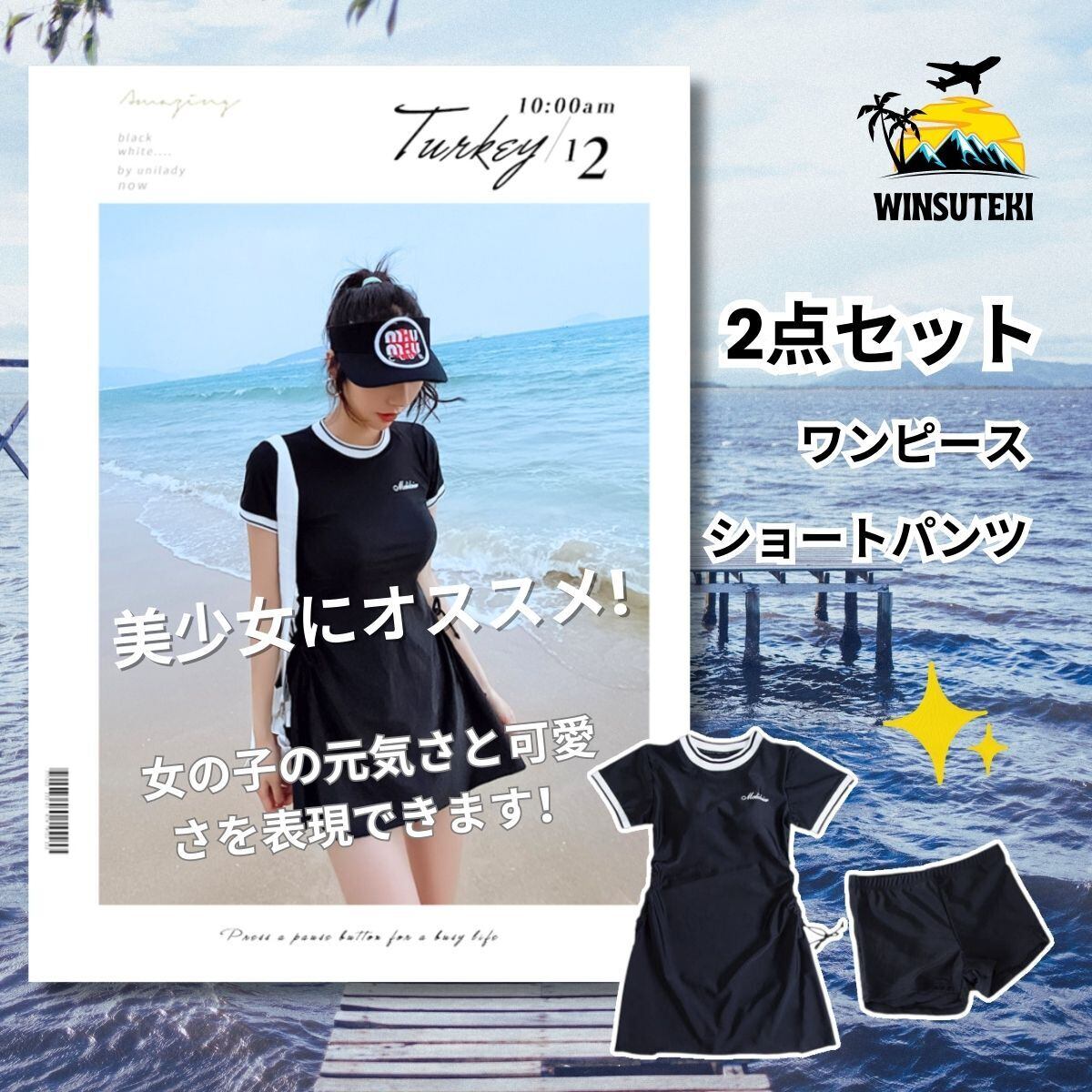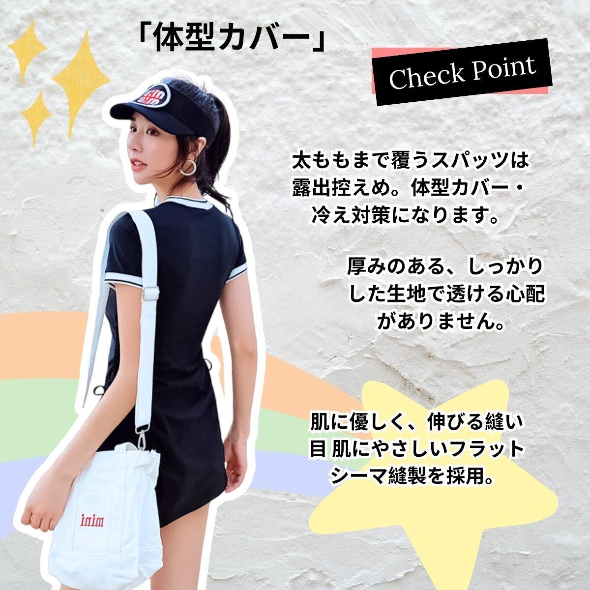 【女性に嬉しい4つの特徴】①厚みのある、しっかりした生地で透ける心配がありません。 ②太ももまで覆うスパッツは露出控えめ。体型カバー ③ ノンワイヤーでストレスフリー!パッドがしっかりはいっているので、安心してアクティビティも楽しめます。④ウエストには紐があり、調節可能、ウエストを引き締める効果があり、体型をより美しく見せます!
