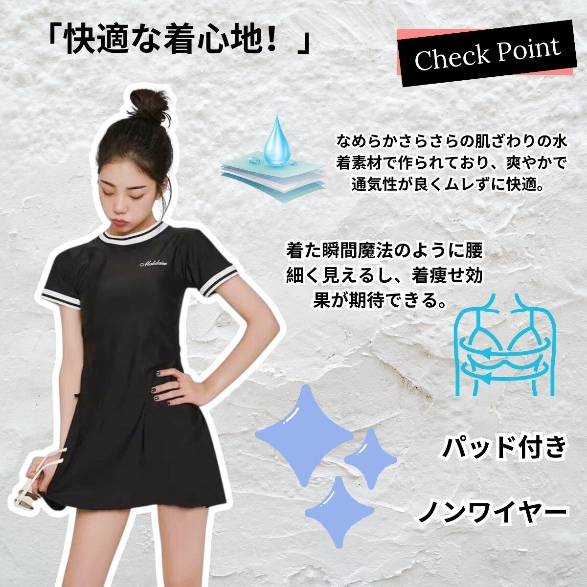 【通気・速乾】なめらかさらさらの肌ざわりの水着素材で作られており、爽やかで通気性が良くムレずに快適。速乾性、伸縮性のある素材なので海やプールや温泉など もOK、水陸両用で全アイテム着たまま水に入れます。肌に優しく、伸びる縫い目 肌にやさしいフラットシーマ縫製を採用。