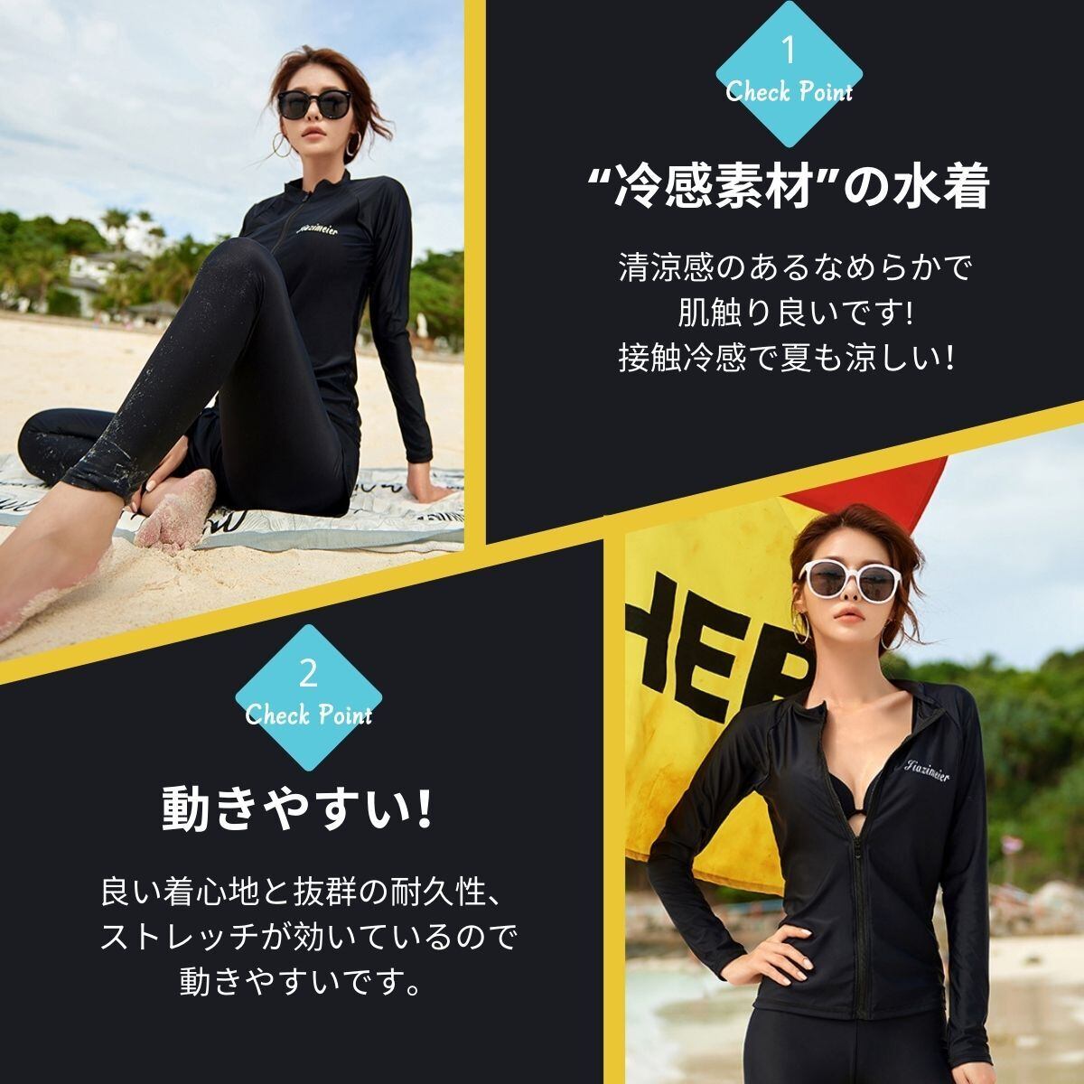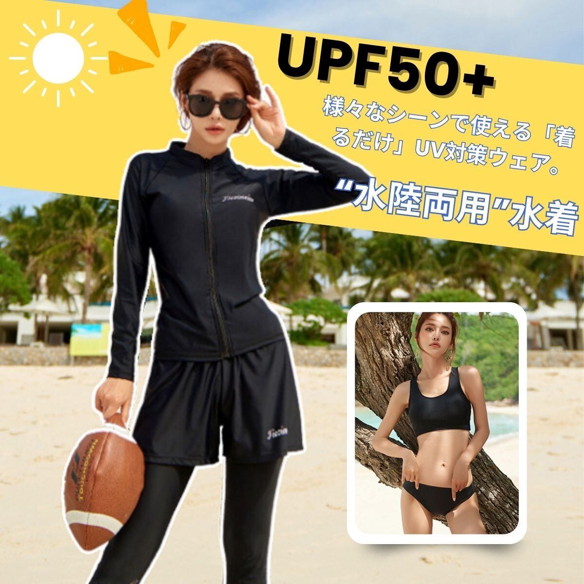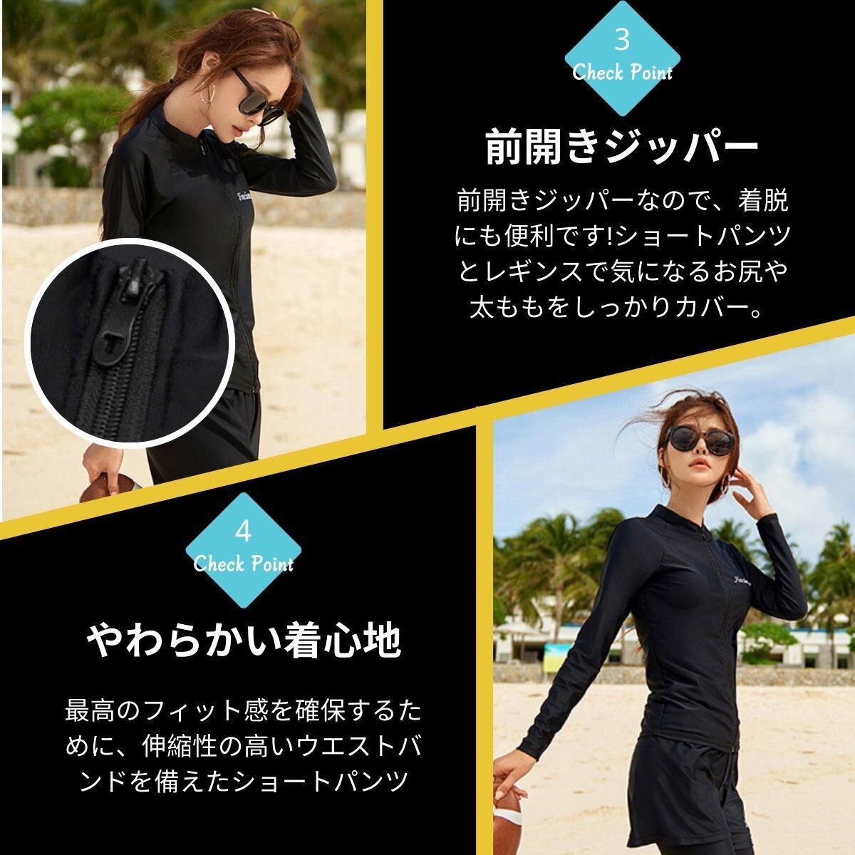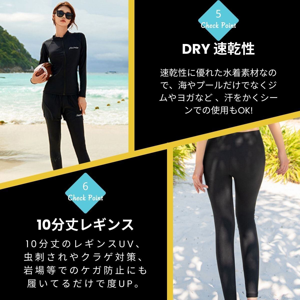 【DRY 速乾性】速乾性に優れた水着素材なので、海やプールだけでなくジムやヨガなど 、汗をかくシーンでの使用もOK、水陸両用で全アイテム着たまま水に入れます。水に濡れてもよく伸びる 縦横に伸縮するストレッチ素材で快適。軽やかな着心地でより自由自在な動きをサポートします。
