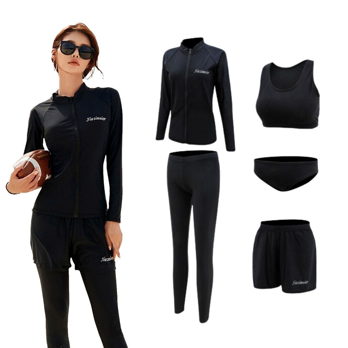 【贅沢5点セット】長袖ラッシュガード+スポーツブラ+ショーツ+レギンス+パンツ。ソフトな肌触りの冷感素材を使用、良い着心地と抜群の耐久性、ストレッチが効いているので動きやすいです。夏の全ての環境に対応できる機能性はもちろんボディラインをしっかりとサポートする着心地!