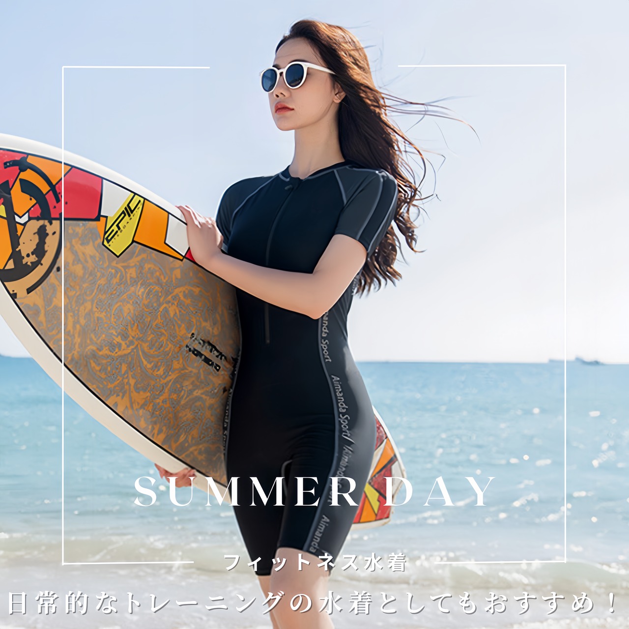 フィットネス レディース 水着 半袖 体型カバー 大きいサイズ スポーツ ワンピース 練習水着 オールインワン 競泳水着 前開き 女性 おしゃれ UVカット 露出控えめ 接触冷感 水陸両用 ポーティー 水着 スイムウエア | swimstar