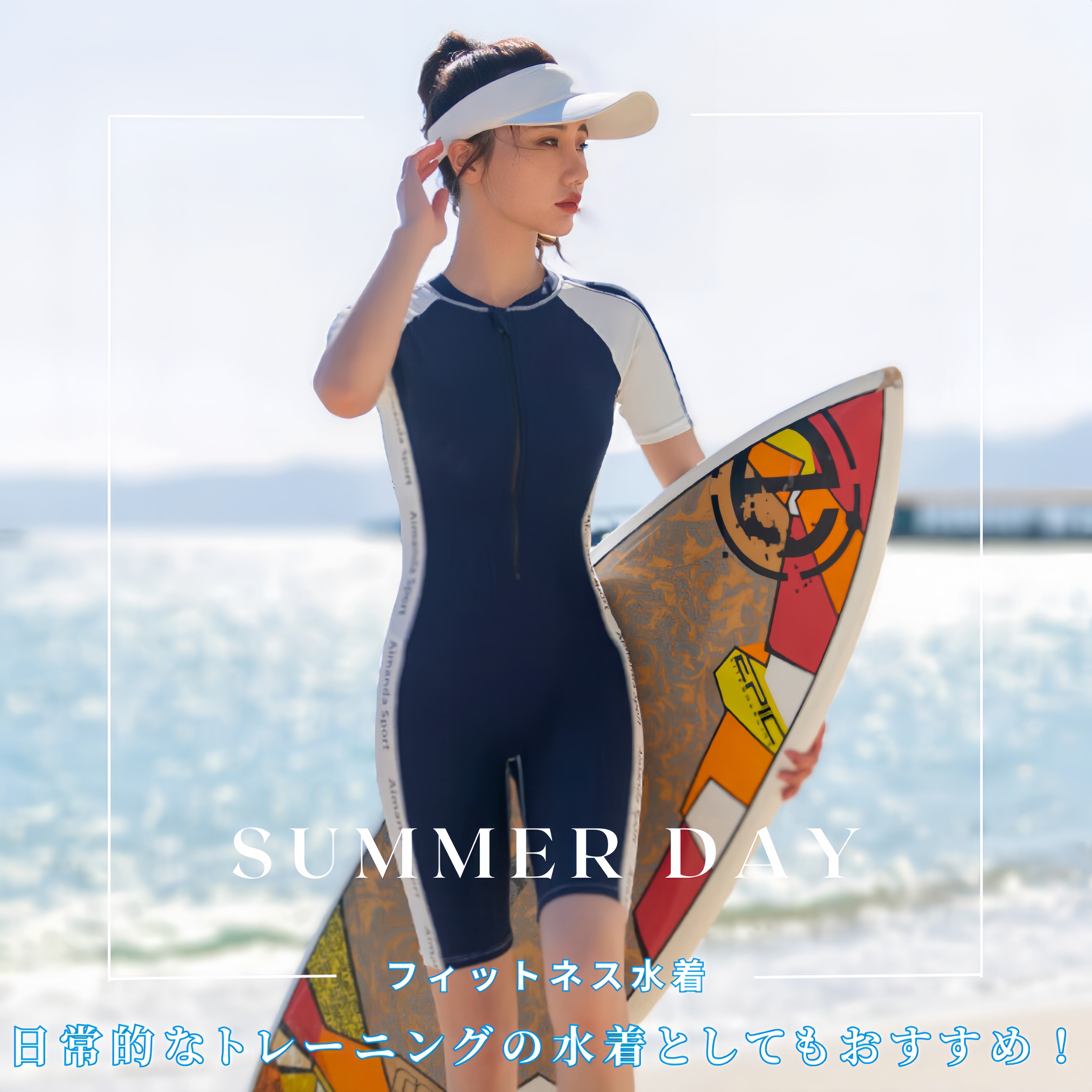 フィットネス、練習用に最適なワンピースタイプの女性用競泳水着です。ネイビーと黒の2種類が用意されているので、2つの色の印象はかなり違います。ネイビーはとても夏らしい色、黒はスマートな印象に。まえあきラッシュガードなので着脱やすい。高品質なジッパーを採用し、スムーズに使用できます。