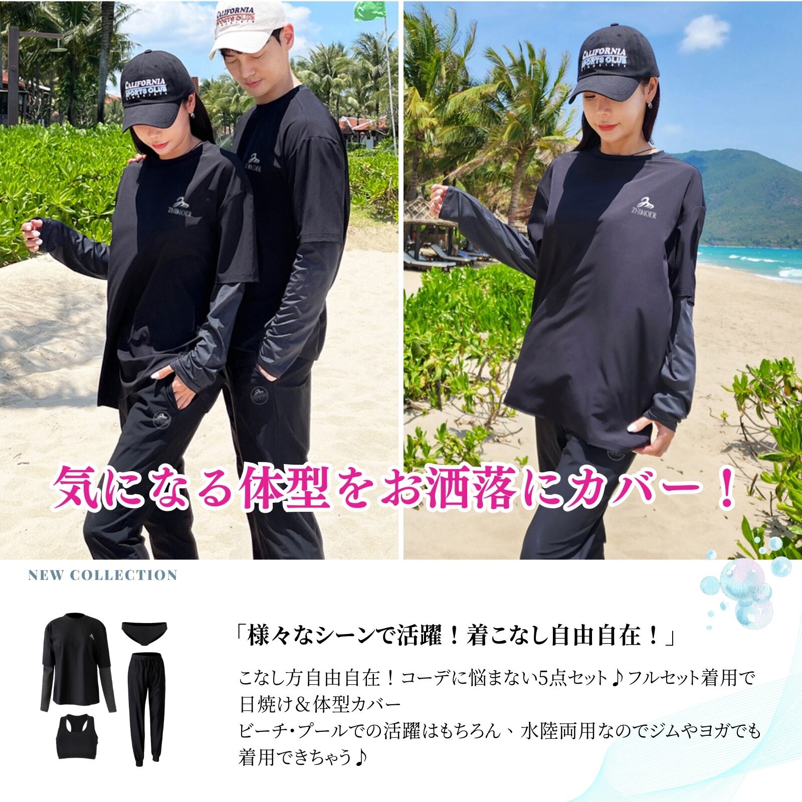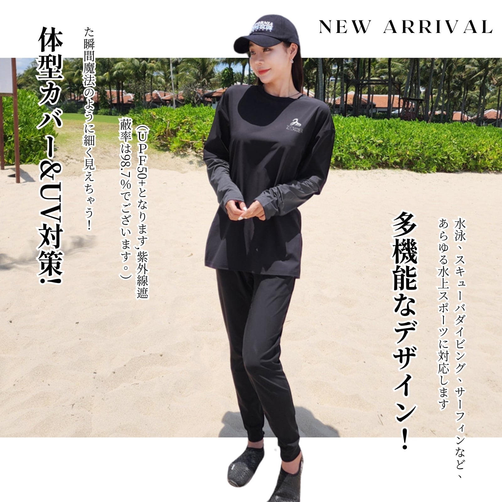 【体型カバー】ラッシュガードはこだわりにこだわった無地と柄の切り替えラインで、着た瞬間魔法のように細く見えちゃう、着痩せ効果が期待できる。速乾性のある素材なのでトレーニングウェアとしてもOK!ハイウエストパンツは、腰回りを引き締め、スタイルアップ効果も期待できます!