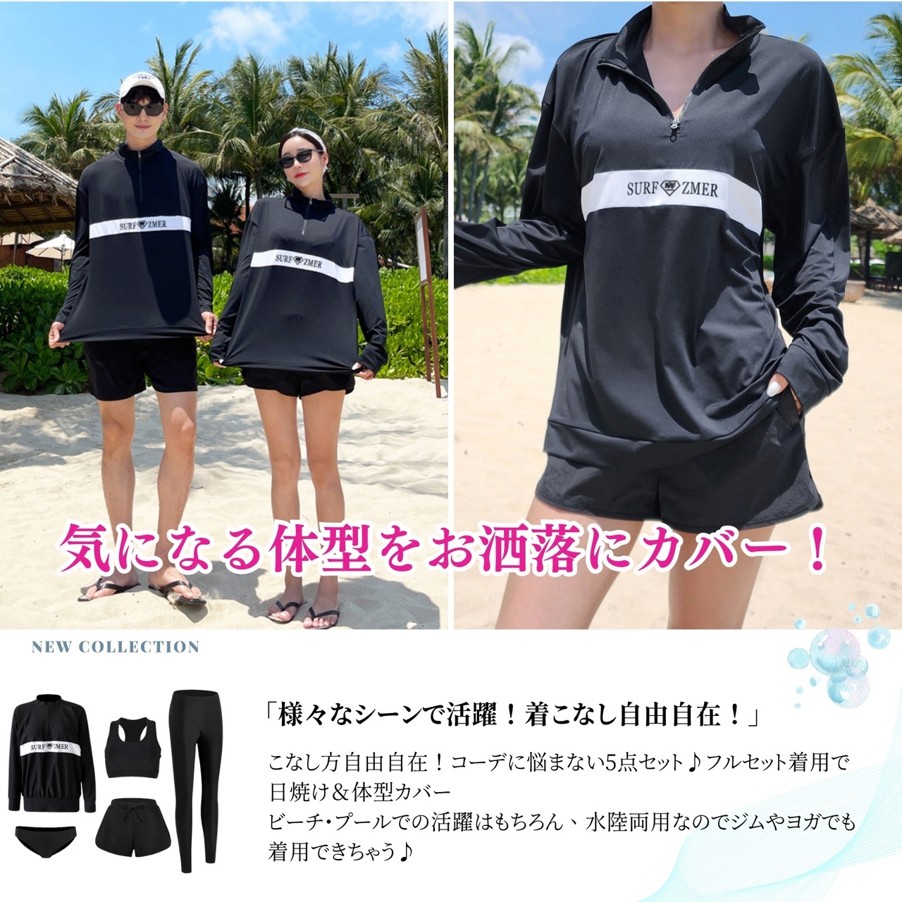 【体型カバー】ラッシュガードはこだわりにこだわった無地と柄の切り替えラインで、着た瞬間魔法のように細く見えちゃう、着痩せ効果が期待できる。速乾性のある素材なのでトレーニングウェアとしてもOK!ハイウエストパンツは、腰回りを引き締め、スタイルアップ効果も期待できます!