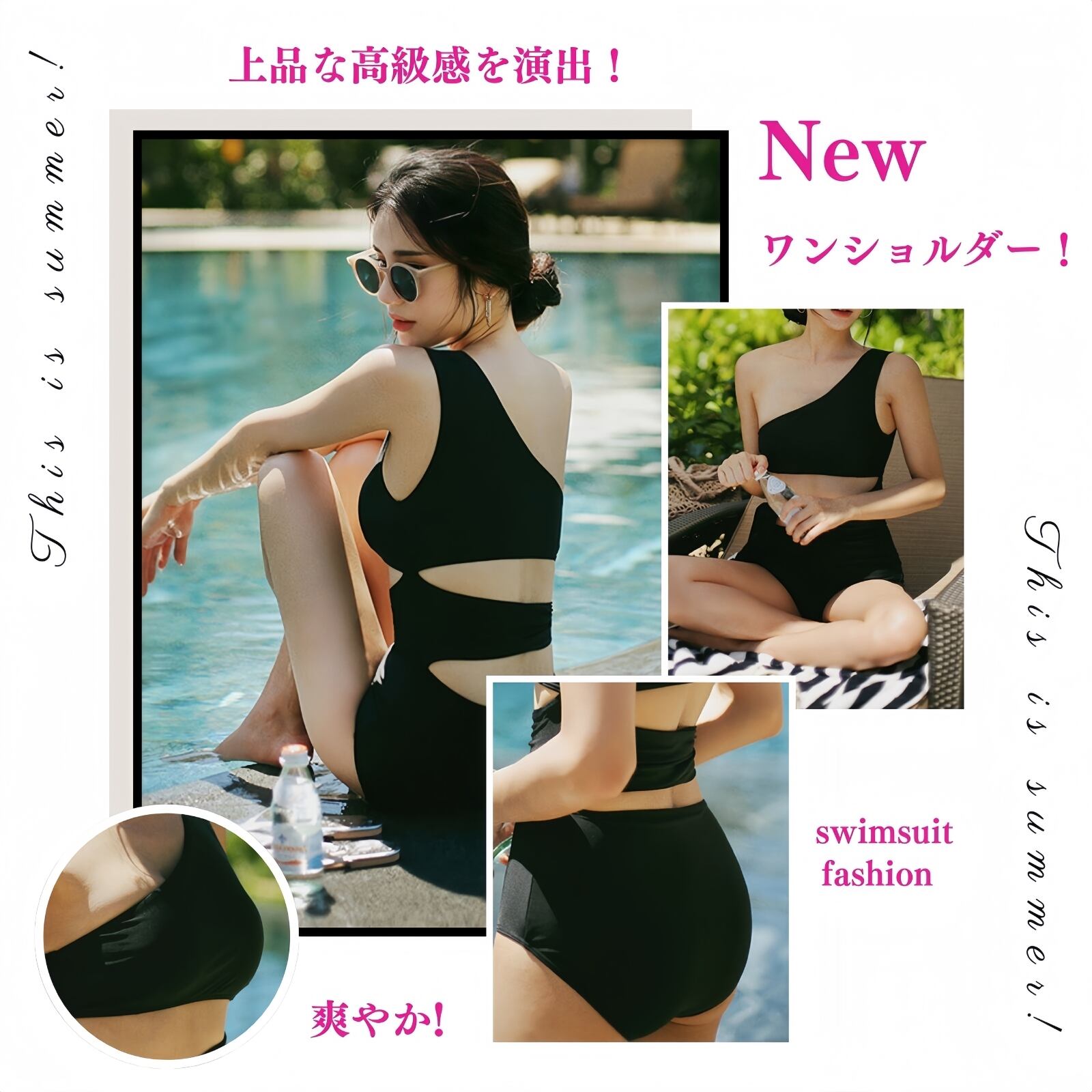 【 オシャレ感抜群! 】アシンメトリーなサイドのカッティングがスタイリッシュ。海外セレブ風のカッコいいワンピースタイプの水着です。ワンショルダーで大胆にデコルテと肩を綺麗にみせます。トップスとボトムスを繋ぐラインがセクシーさを演出します。