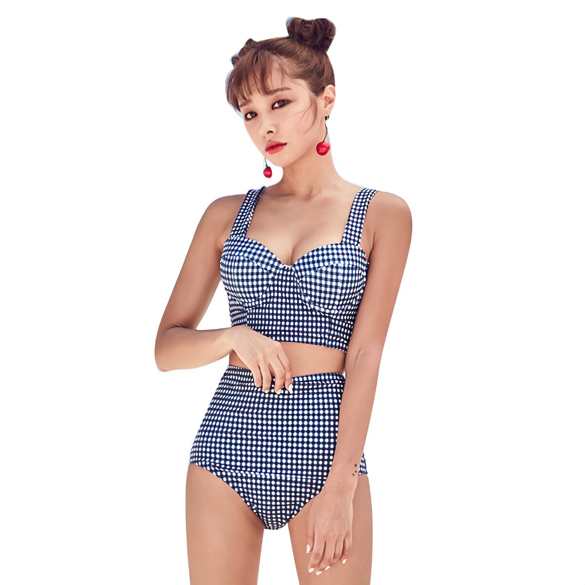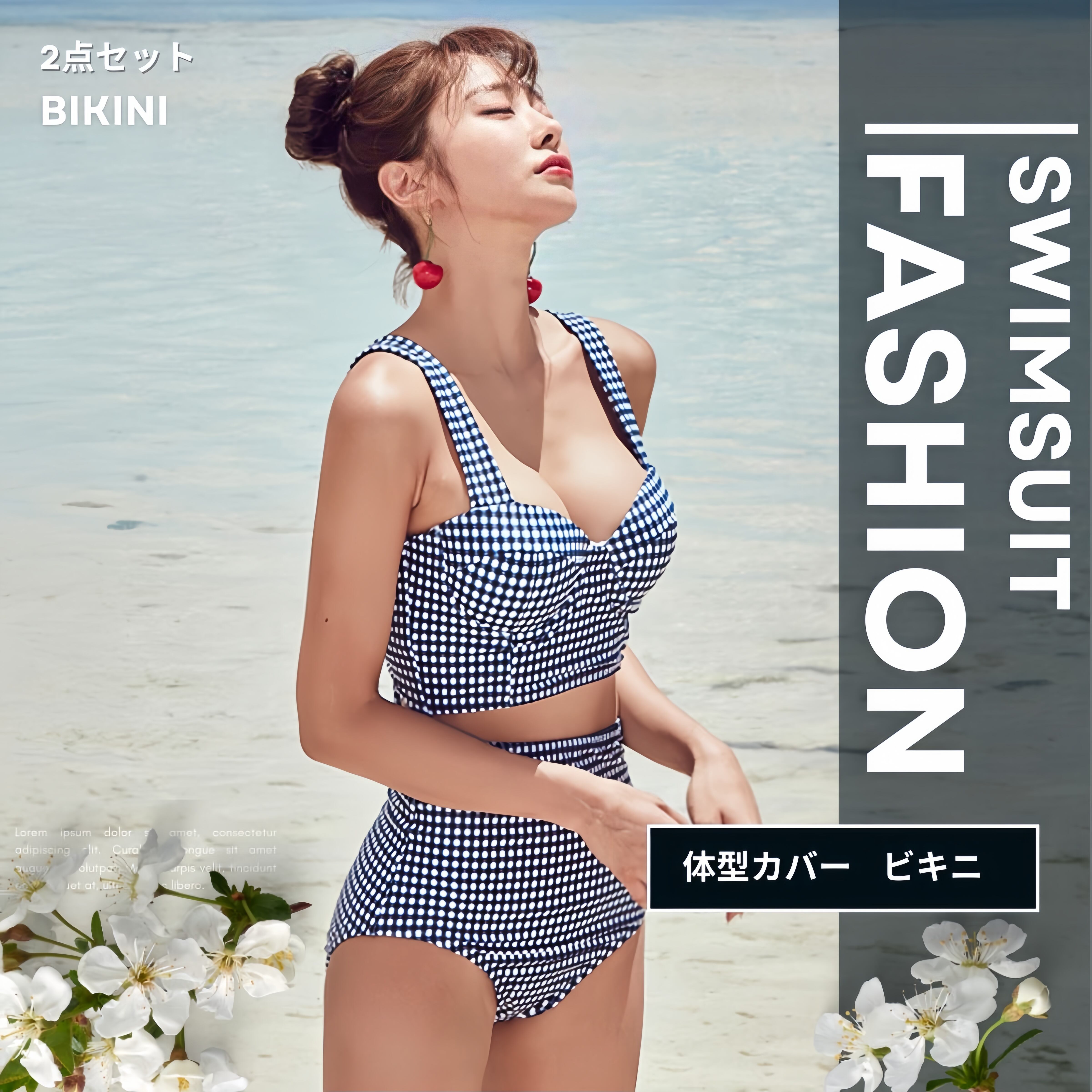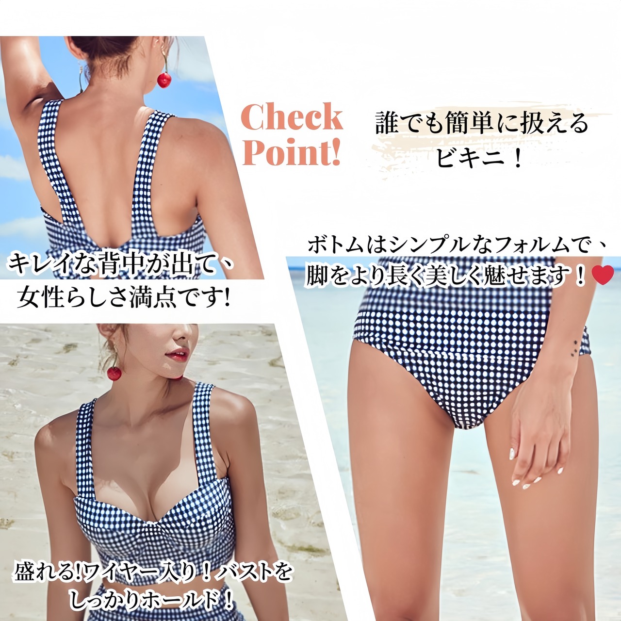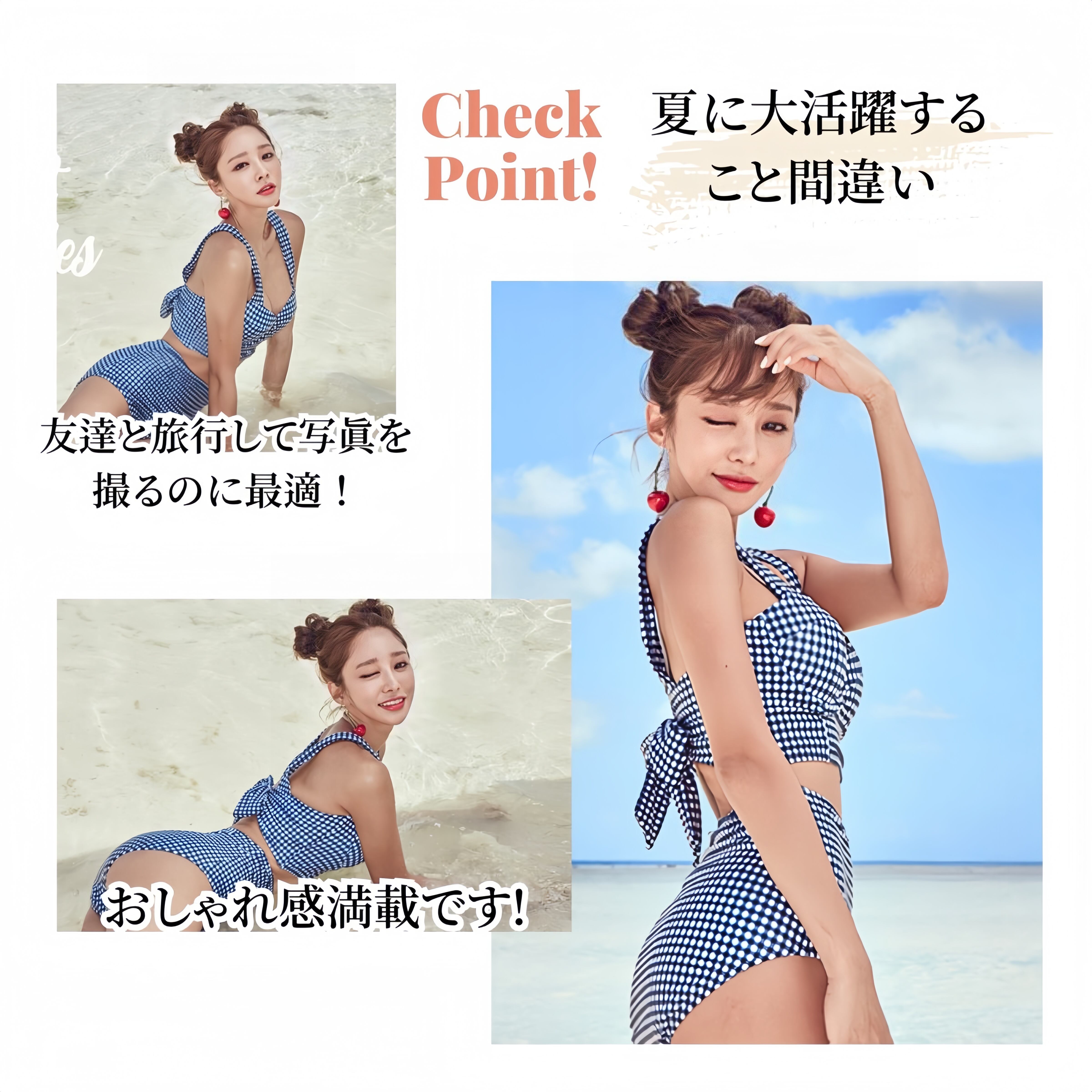 【 韓国ファッション チェック柄2点セット水着 】余分な脇肉をホールドする脇高設計で、バストを包み込むように中心に寄せ、優しく谷間メイクするブラジャー!お尻をしっかり包み込んで露出を防ぐ安心パンツでありながら、ハイウエストのデザインでお腹の贅肉もしっかりカバーしてくれます。着用すると少しきつめですが、着痩せ効果は十分期待できます!