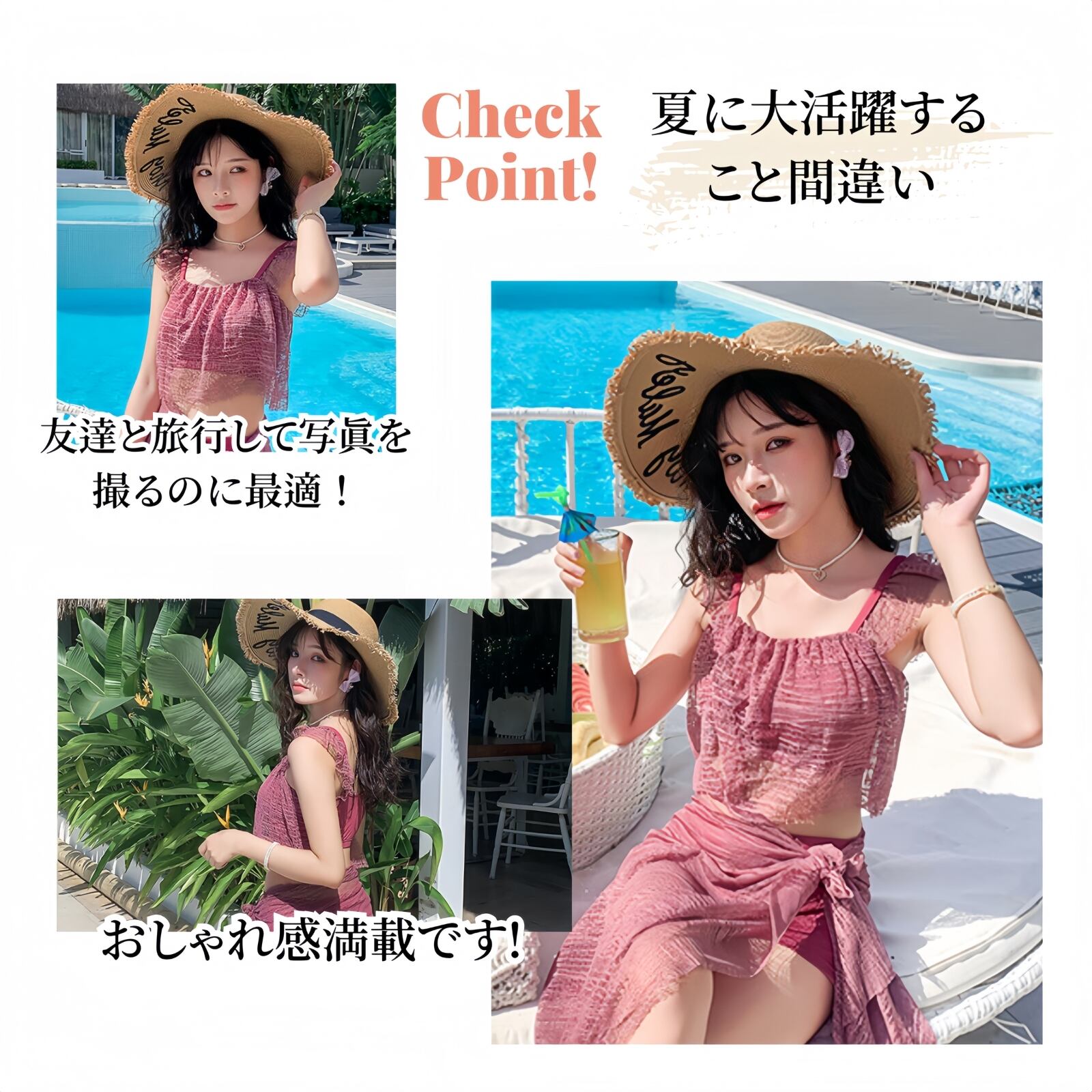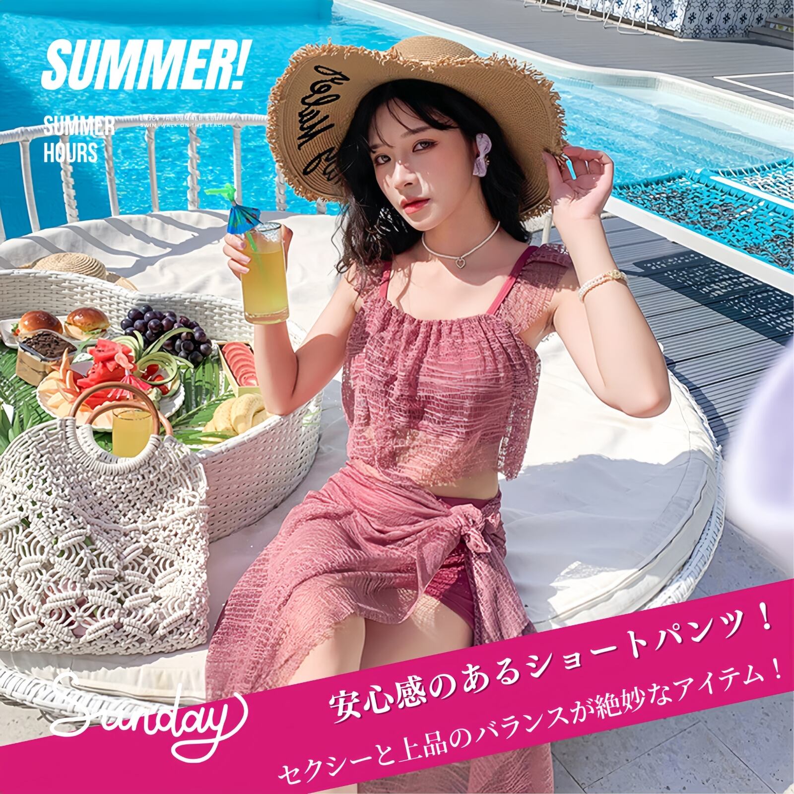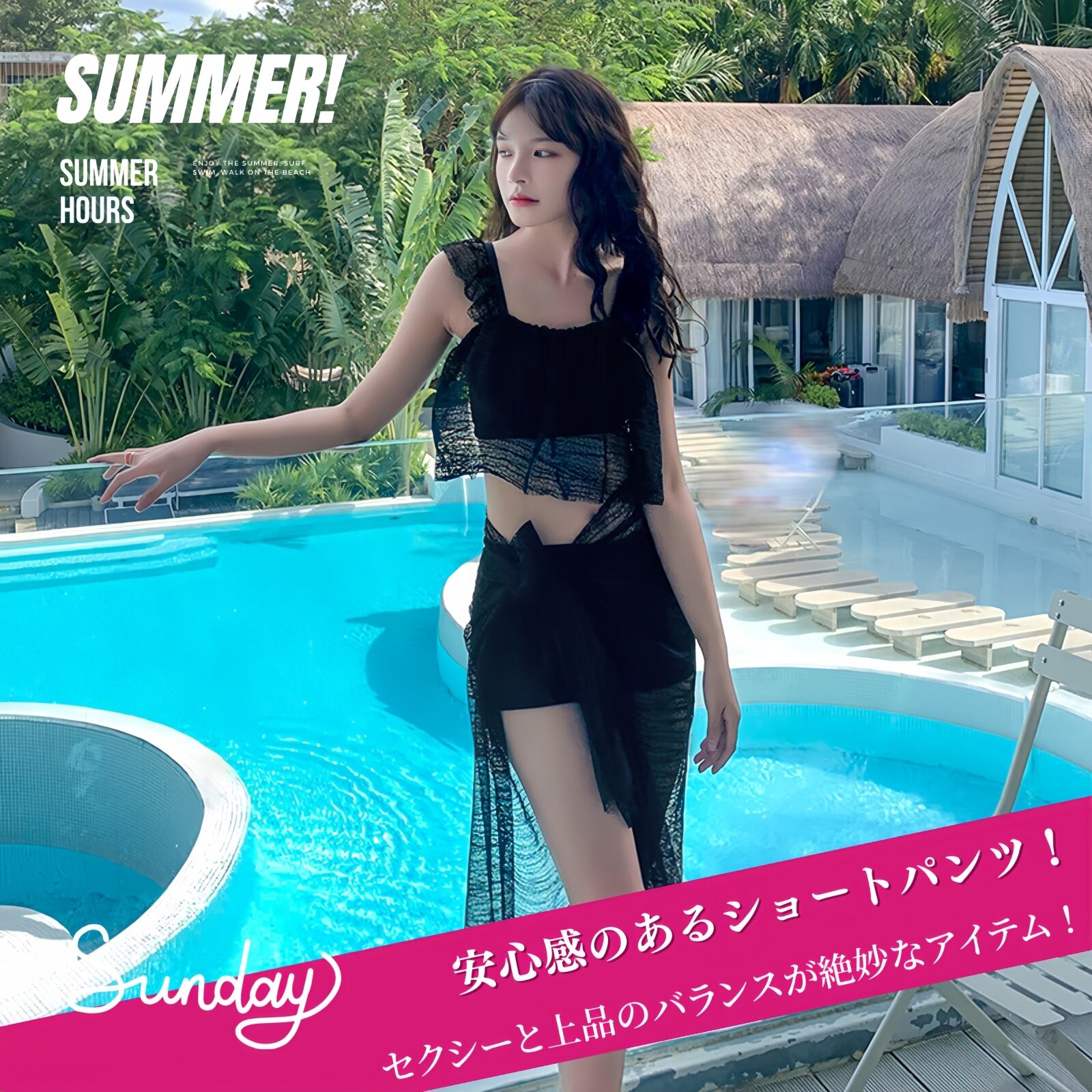 【 安心感のあるショートパンツ! 】ショートパンツのデザインなので、露出しすぎず安心感いっぱいです!よりアクティブに動くことが出来るので、マリンスポーツも思い切り楽しめます。そして、レースパレオを腰に巻けばさらに体型カバー効果も上昇。セクシーと上品のバランスが絶妙なアイテム!