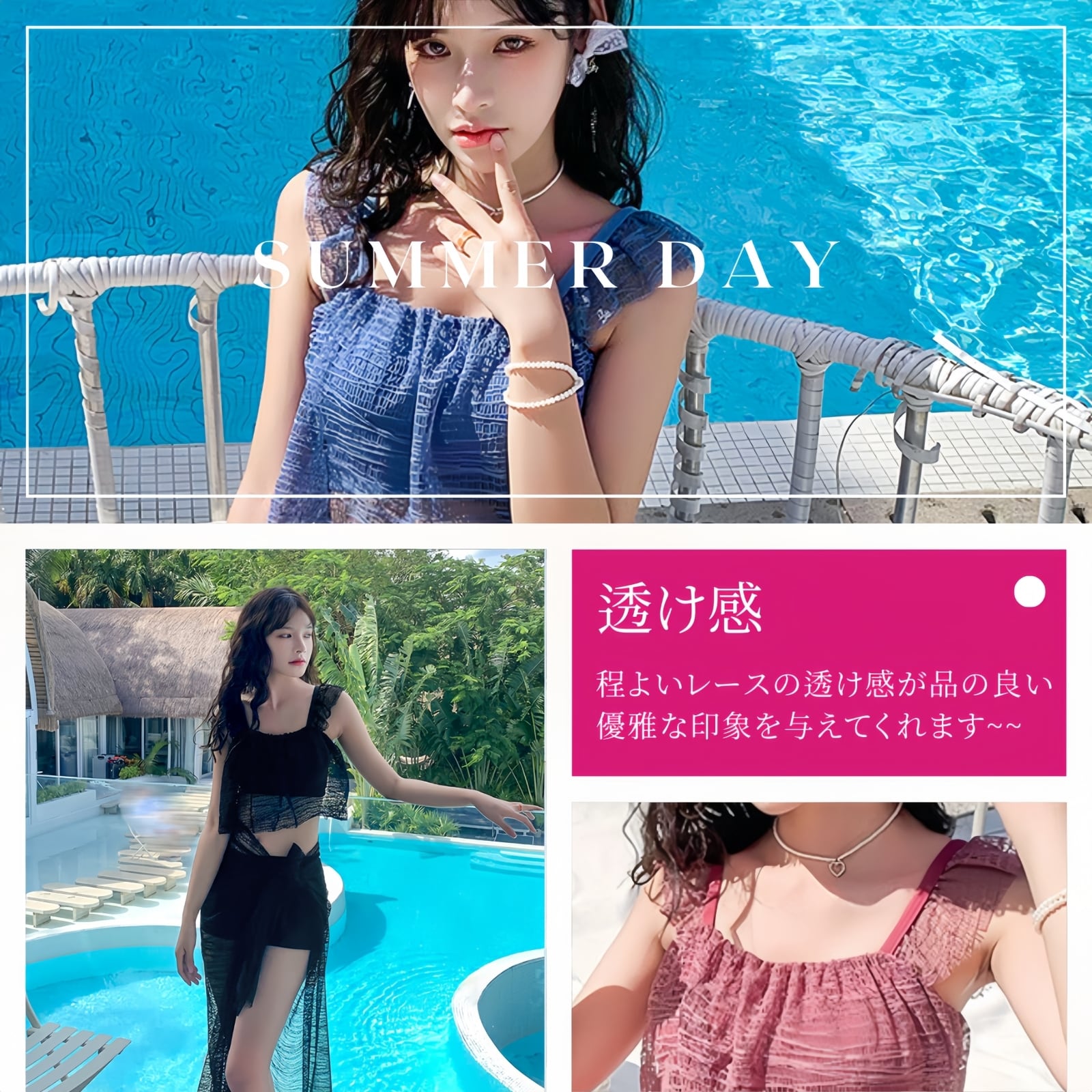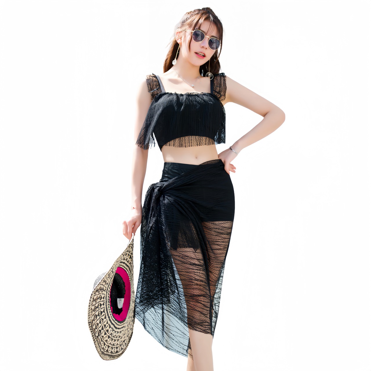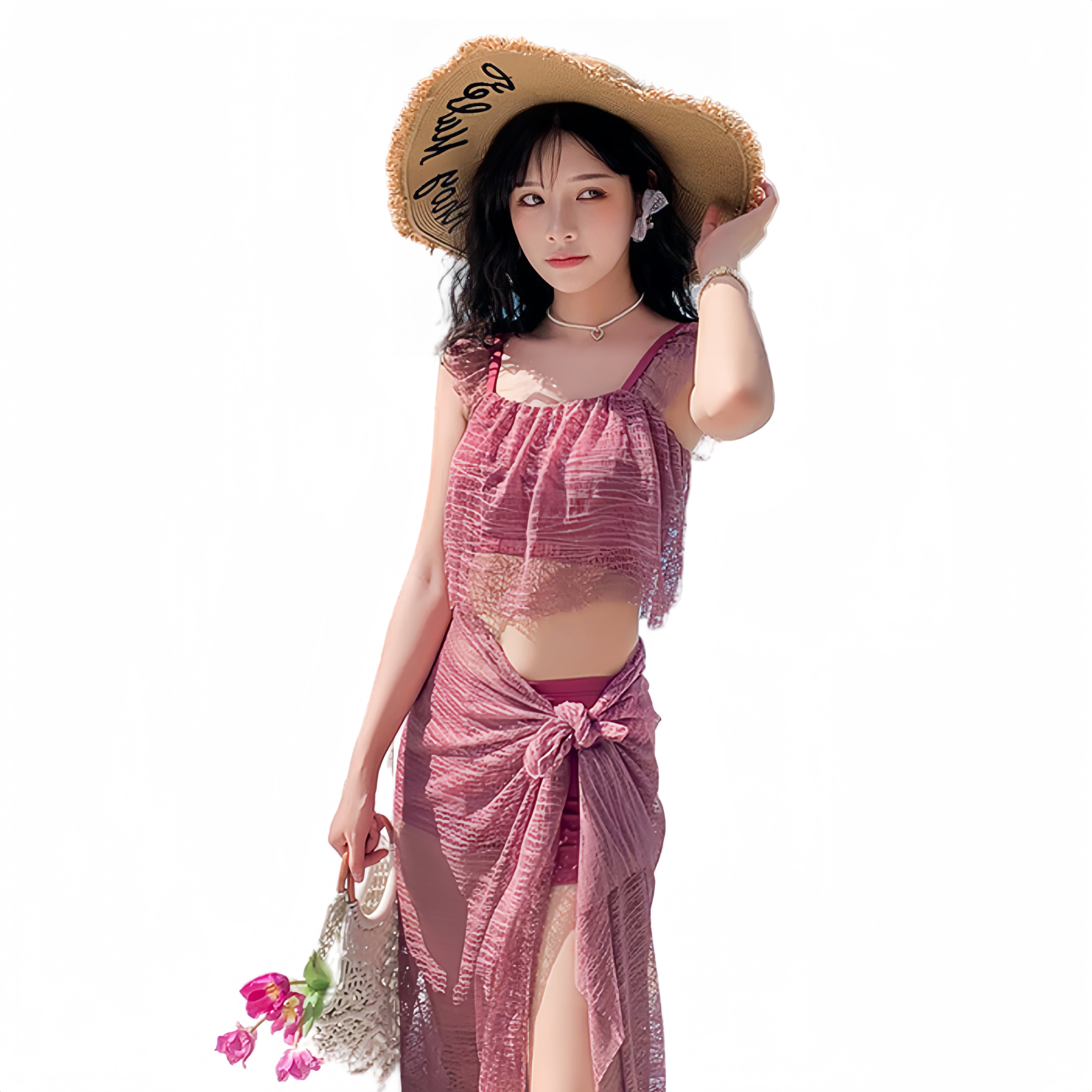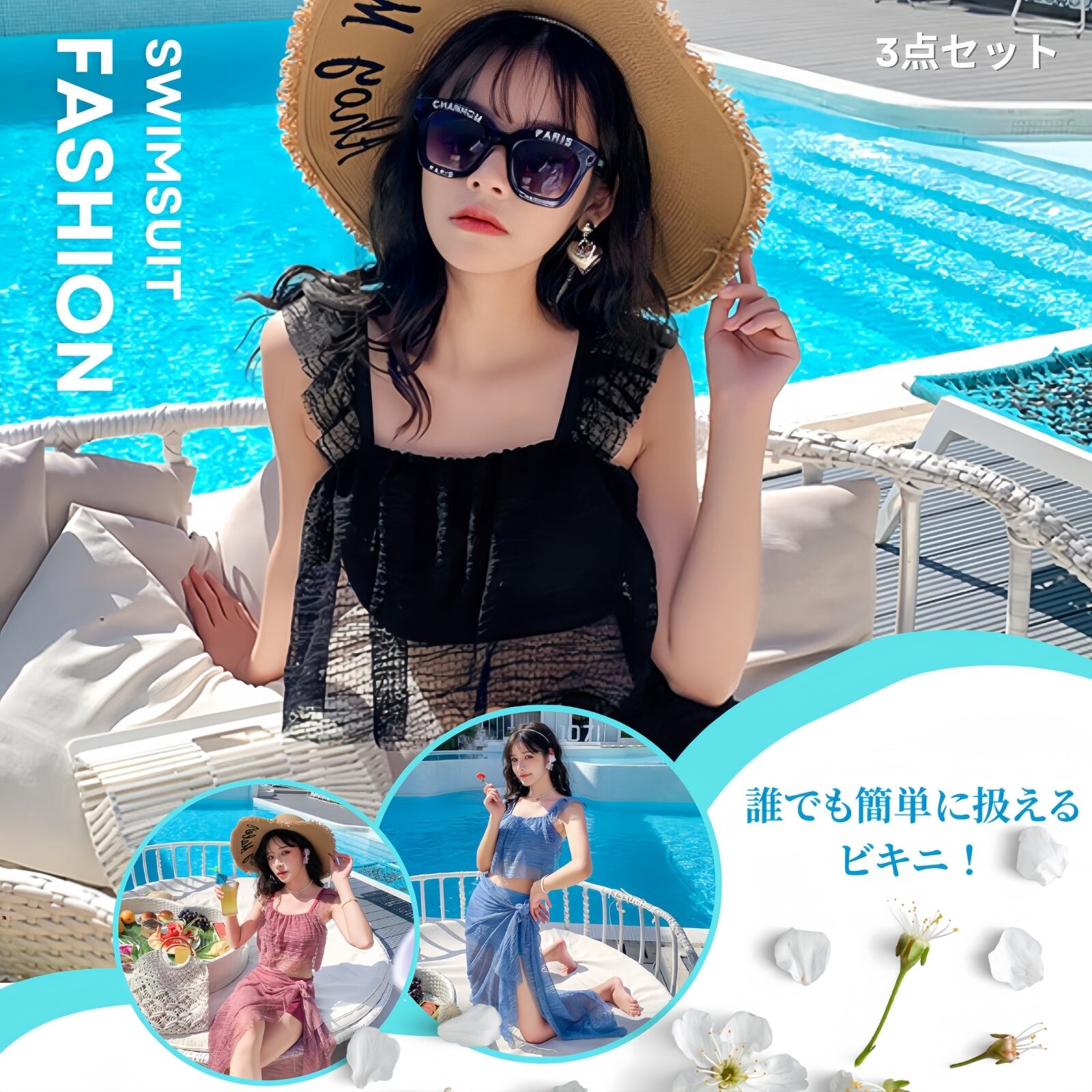 【 可愛い3点セット水着 】レース パレオ+ショートパンツ+ブラ=可愛い3点セット水着。レース要素をふんだんに使用しており、とてもかわいらしく、とても爽やかで夏らしい気分にさせてくれます。見えつ隠れつしている透明感がとてもセクシーで目を惹くので、この夏に活躍間違いなし!