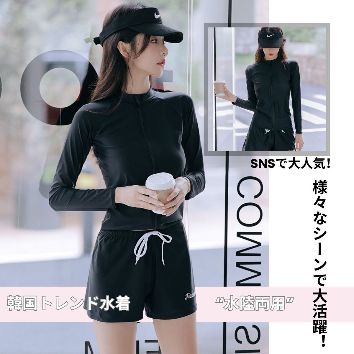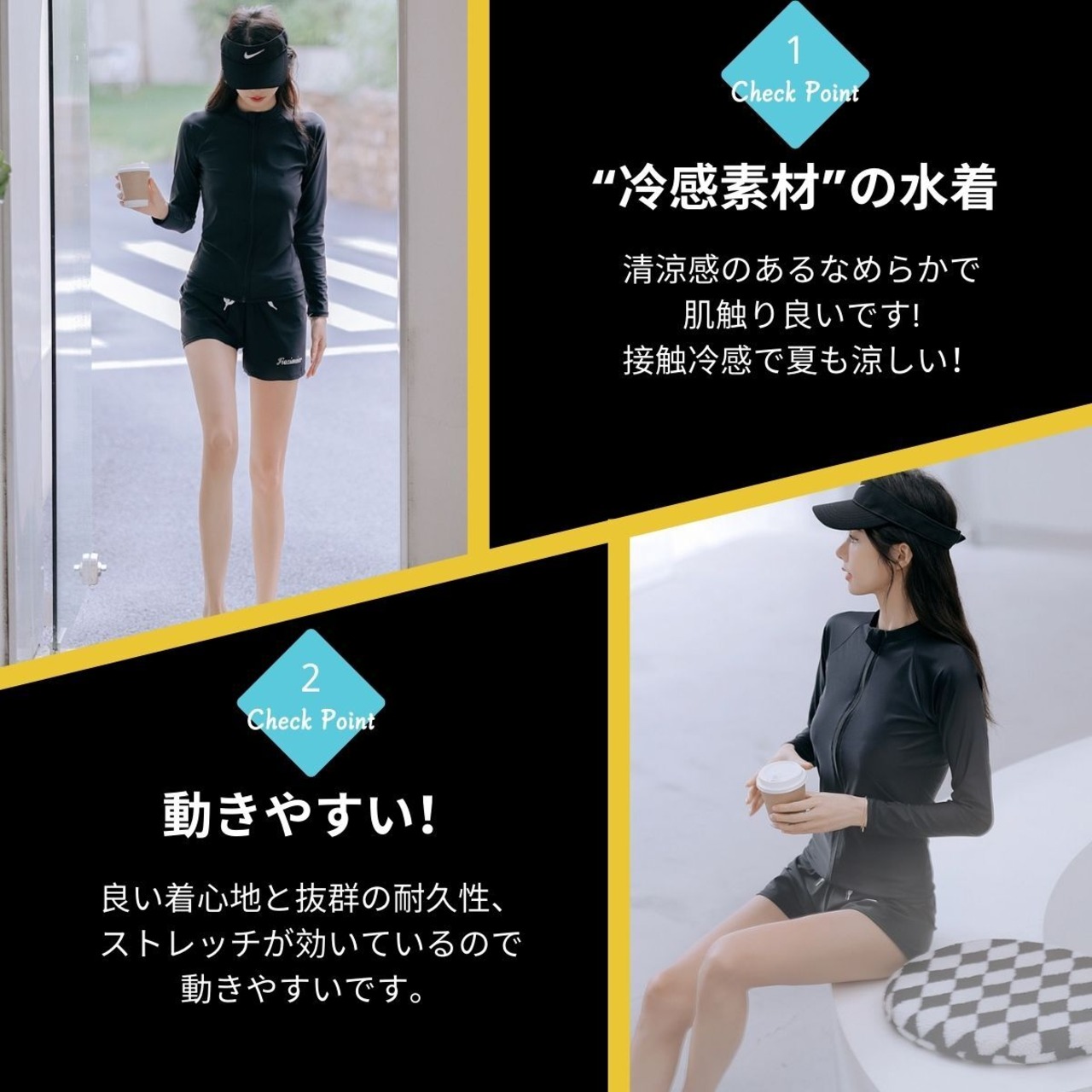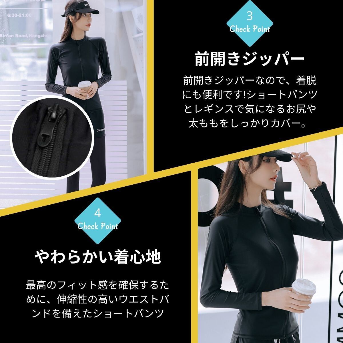 【体型カバー】ラッシュガードはこだわりにこだわった無地ラインで、着た瞬間魔法のように細く見えちゃう、着痩せ効果が期待できる。速乾性のある素材なのでトレーニングウェアとしてもOK!セパレートタイプで着やすいです!ショートパンツとレギンスで気になるお尻や太ももをしっかりカバー。