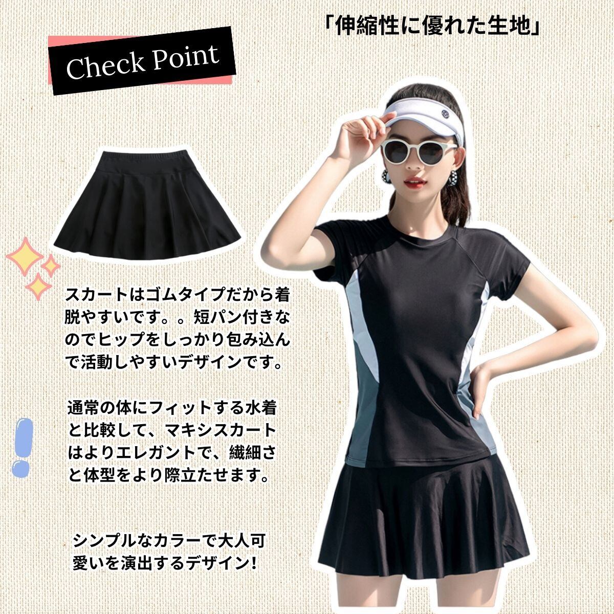 【2点セット】半袖ラッシュガード+スカートお得な2点セットなタンキニです。伸縮性に優れており丈夫で破れにくい素材を採用、柔らかく、快適で弾力性があり、余分な肉を覆うことができる。。夏の眩しい太陽の下でも安心、日焼け防止効果も期待できるスポーツ風セパレート水着2点セット。良い着心地と抜群の耐久性、買ってすぐ使用できるのが嬉しい!