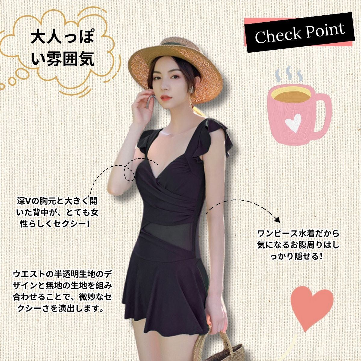 深Vの胸元と大きく開いた背中が、とても女性らしくセクシー!ウエストの半透明生地のデザインと無地の生地を組み合わせることで、微妙なセクシーさを演出します。体型カバーもばっちりできて、可愛くてセクシーなワンピースタイプ。このシンプルなデザインの水着は、すべての年齢の女性に適しています。