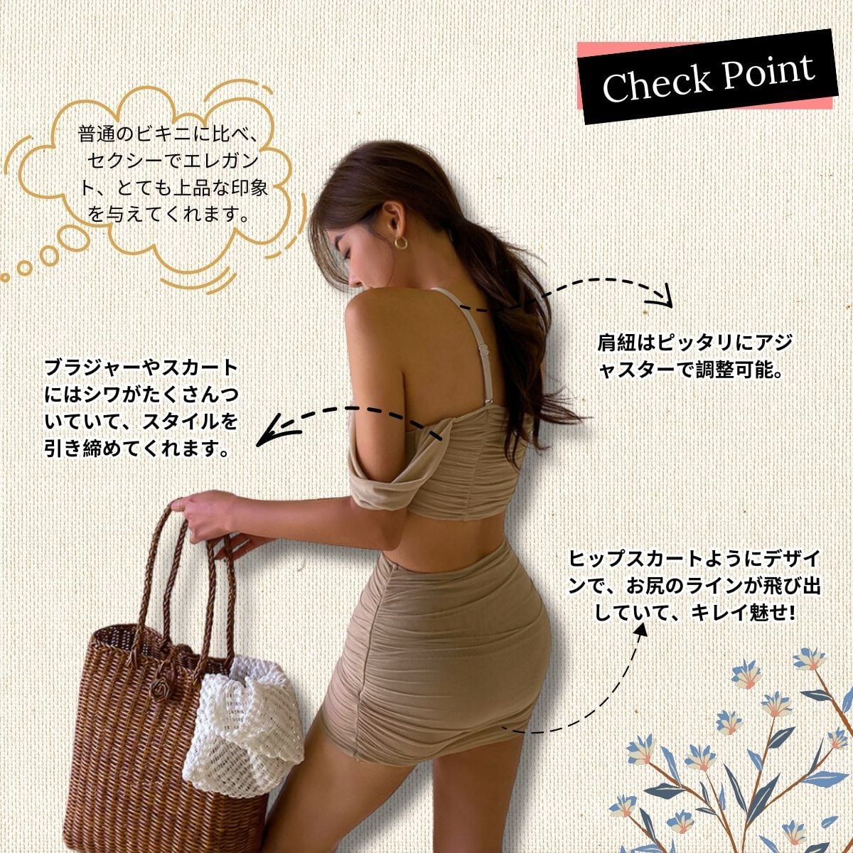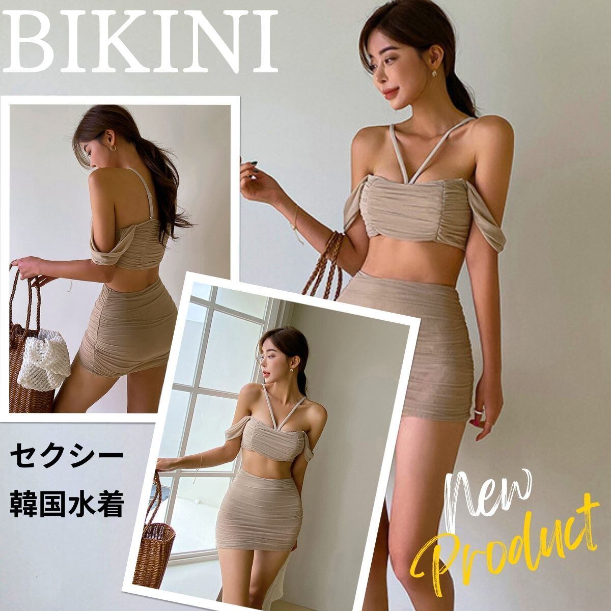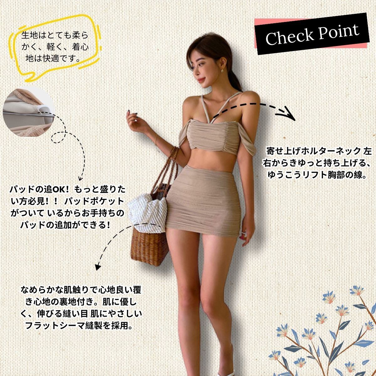 お洒落なハイウエストでさり気にお腹カバー。オシャレにすらっと脚見せ。普通のビキニに比べ、セクシーでエレガント、とても上品な印象を与えてくれます。ヒップスカートようにデザインで、お尻のラインが飛び出していて、キレイ魅せ!寄せ上げホルターネック 左右からきゆっと持ち上げる、ゆうこうリフト胸部の線。