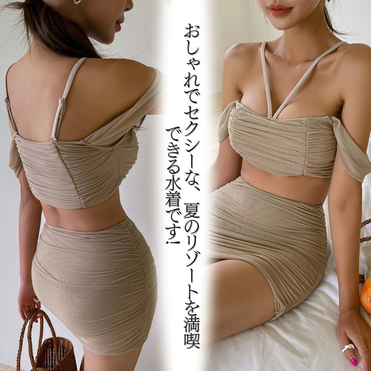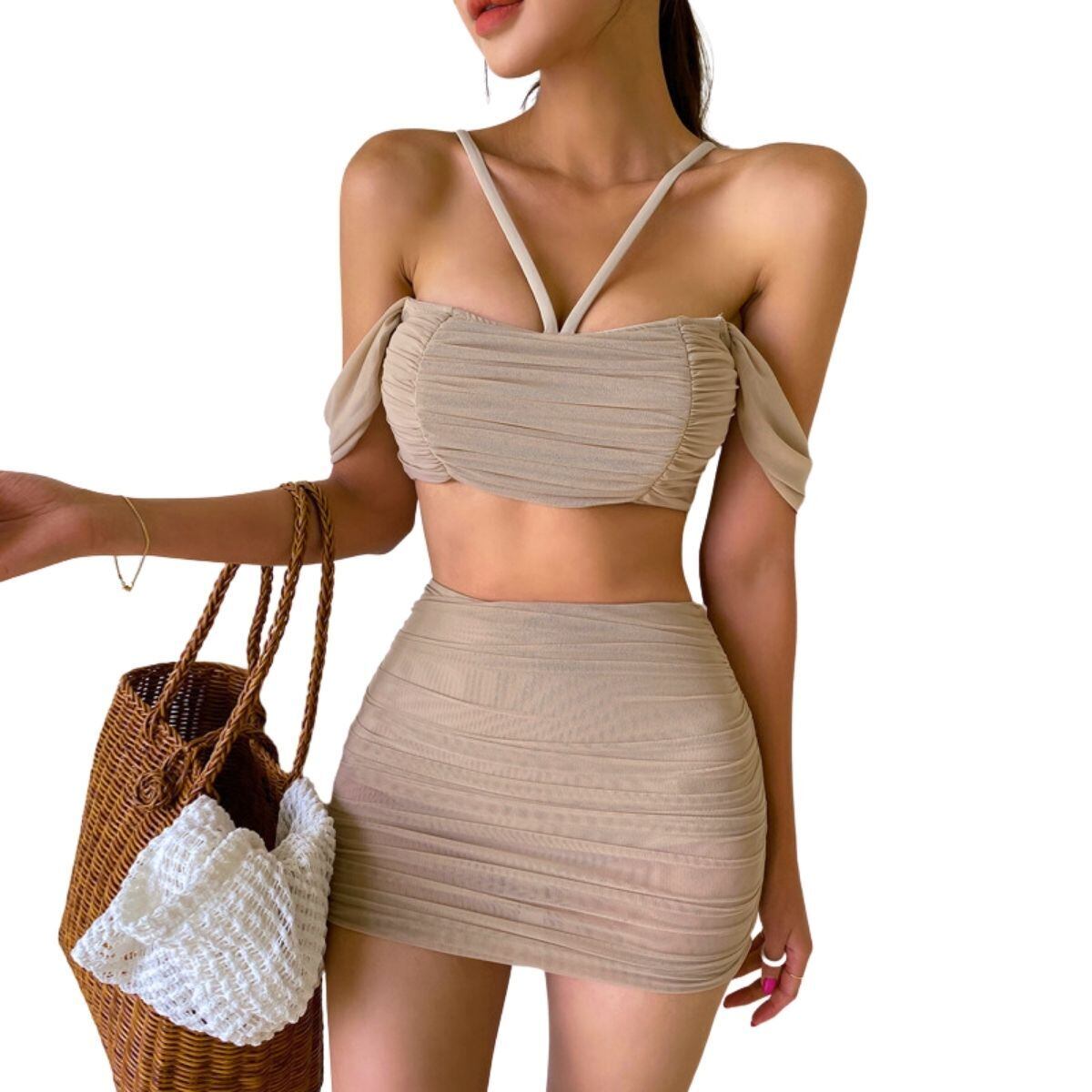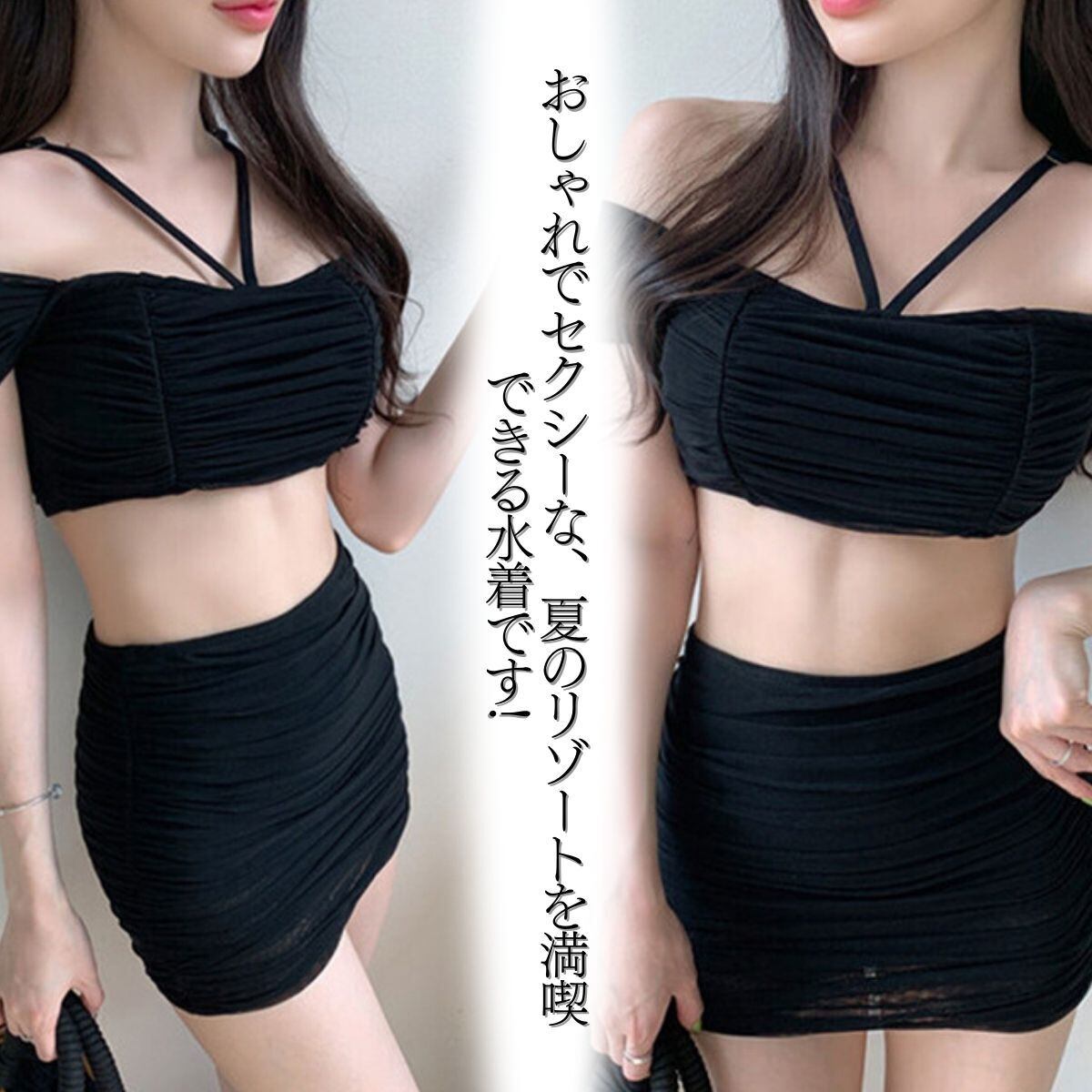 おしゃれでセクシーな、夏のリゾートを満喫できる水着です!ユニークなデザインで、ホテルのプールでもビーチでも目を引き、大人の女性らしさが漂います!ブラジャーやスカートにはシワがたくさんついていて、スタイルを引き締めてくれます。気になる体型部分をカバー。女性の気になる部分のお悩み解決。