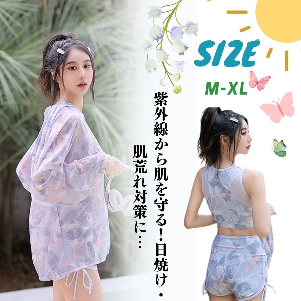 【3点セット】ラッシュガード+ショートパンツ+スポーツブラお得な3点セットなタンキニです。ラッシュガードはフード付きなので、頭が手首もしっかり覆えるので、室内の冷房対策もとして使えます!絶対焼けたくない!日常生活からレジャー・スポーツ まで幅広いシーンで使用可能。
