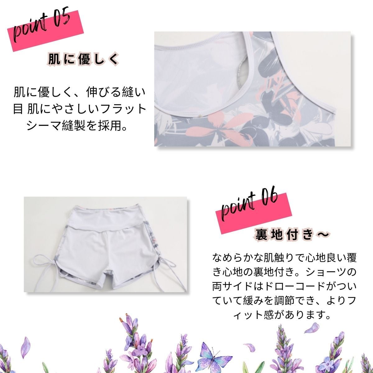 ブラカップはノンワイヤーでストレスフリー!カップがしっかりはいっているので、安心してアクティビティも楽しめます。脇高設計でサイドも安心の綺麗ライン。ブラのアンダーが長めで、ショーツもハイウエストのため 肌の露出が苦手な方でも挑戦しやすいデザインです。