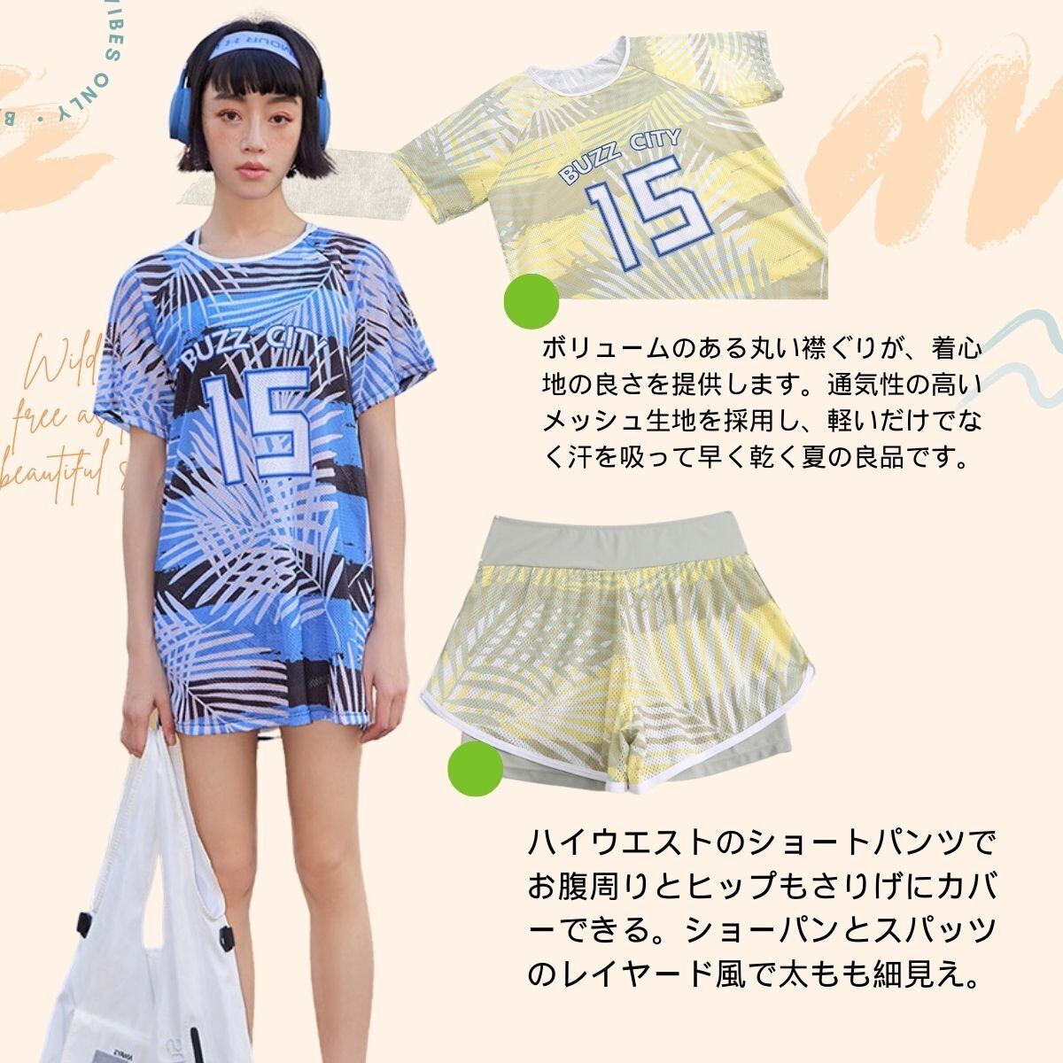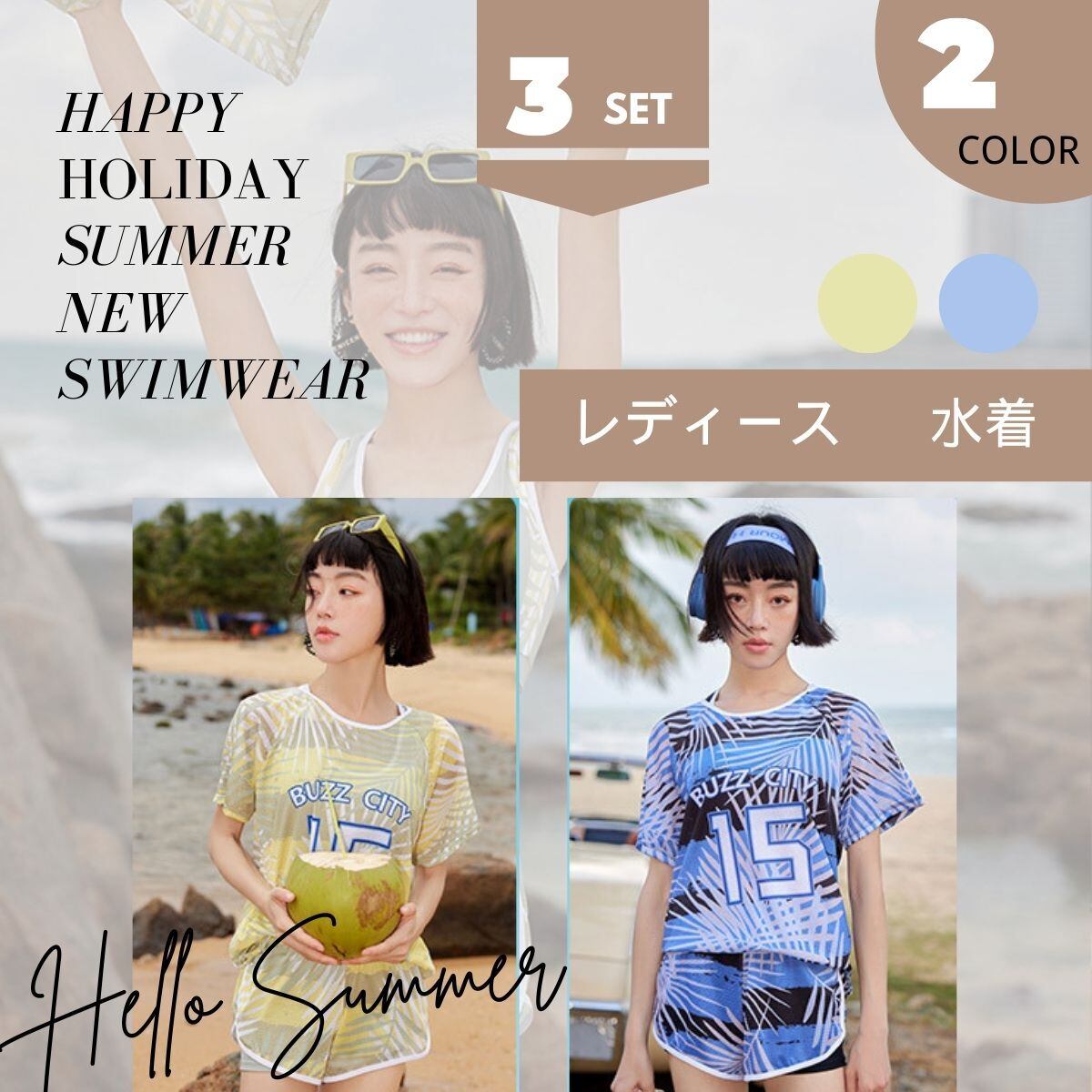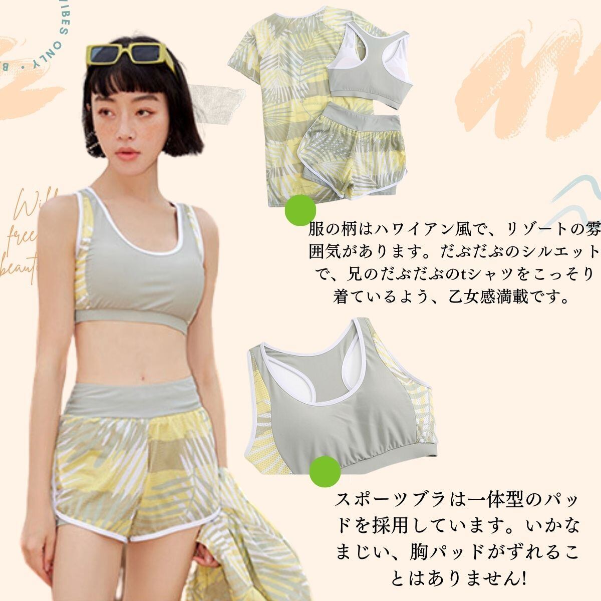【3点セット】Tシャツ+ショートパンツ+スポーツブラお得な3点セットなタンキニです。気分やシーンに合わせて組み合わせを楽しんで♪イエローとブルーを選ぶことができて、イエローはもっと優しくてかわいくて、ブルーはもっとクールでかっこいいです。どれも夏らしい雰囲気があり。