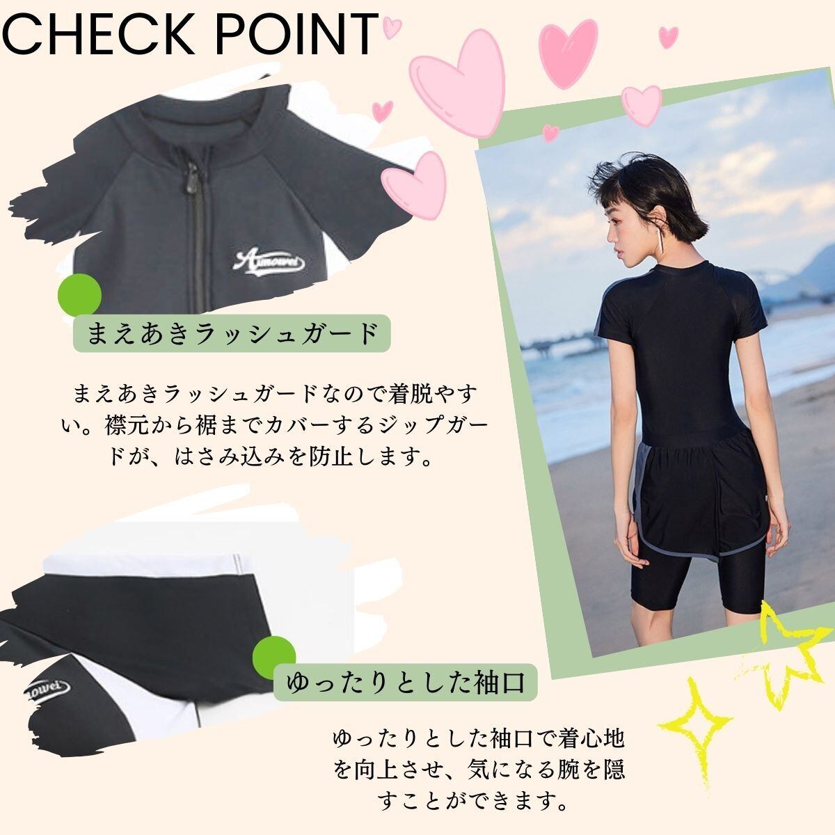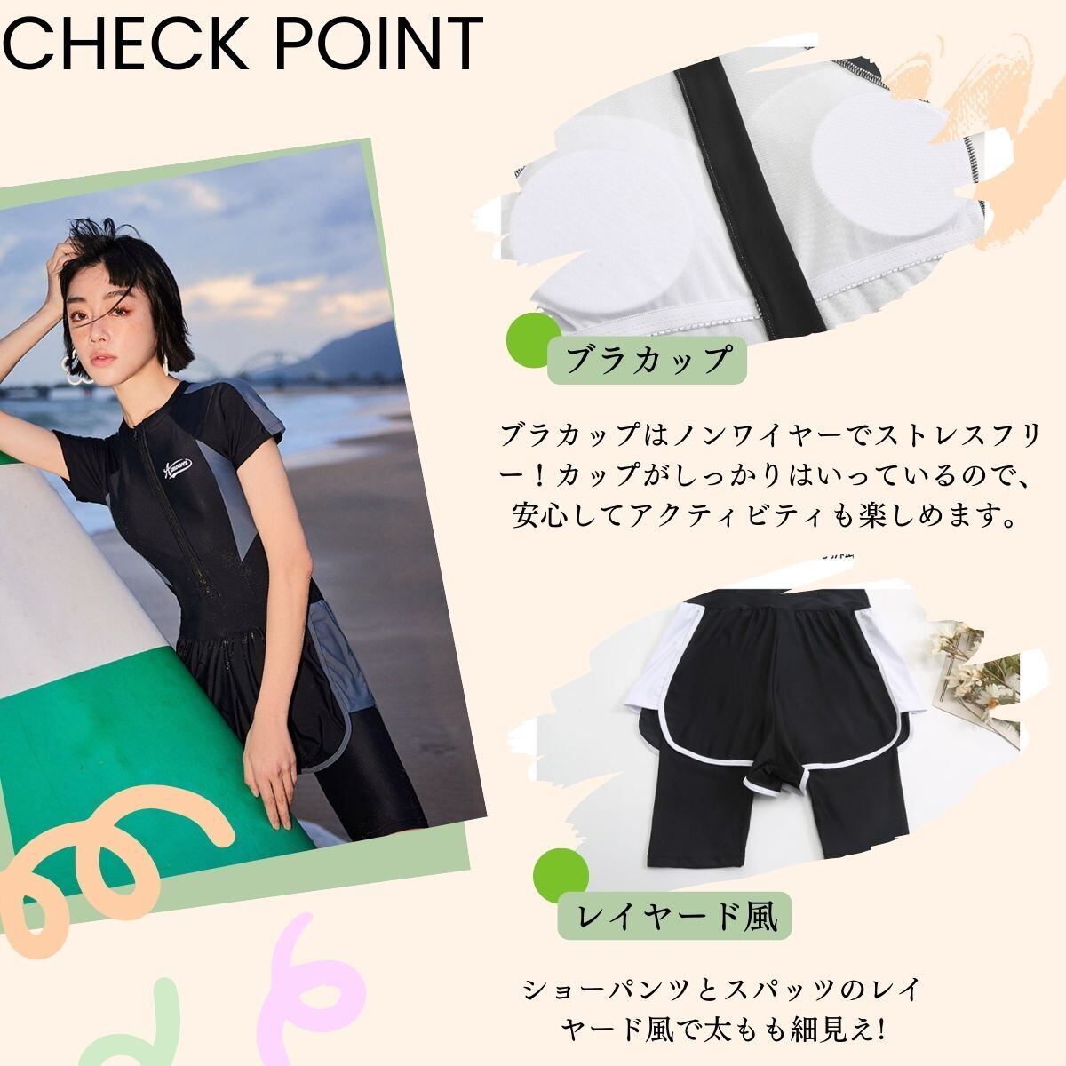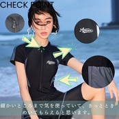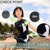 配色は、モノトーンではなく、ミックスカラーのデザインで、よりスポーティさを演出しています。まえあきラッシュガードなので着脱やすい。高品質なジッパーを採用し、スムーズに使用できます。フロントジッパーは着脱しやすい上に、ジッパーを調整して胸元から女性らしさをアピールすることもできます。