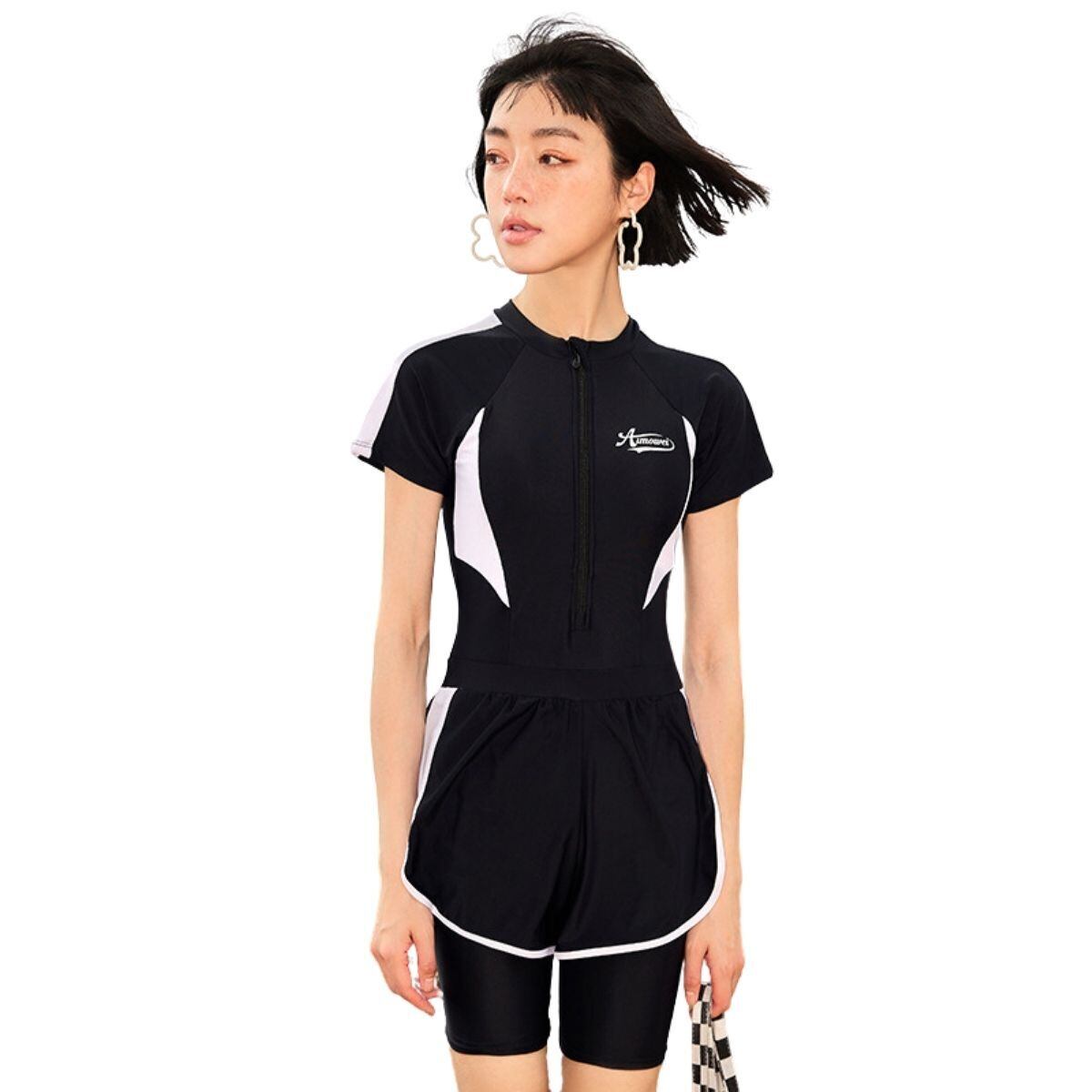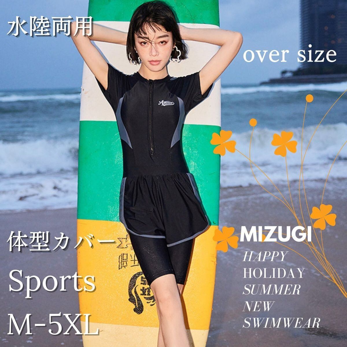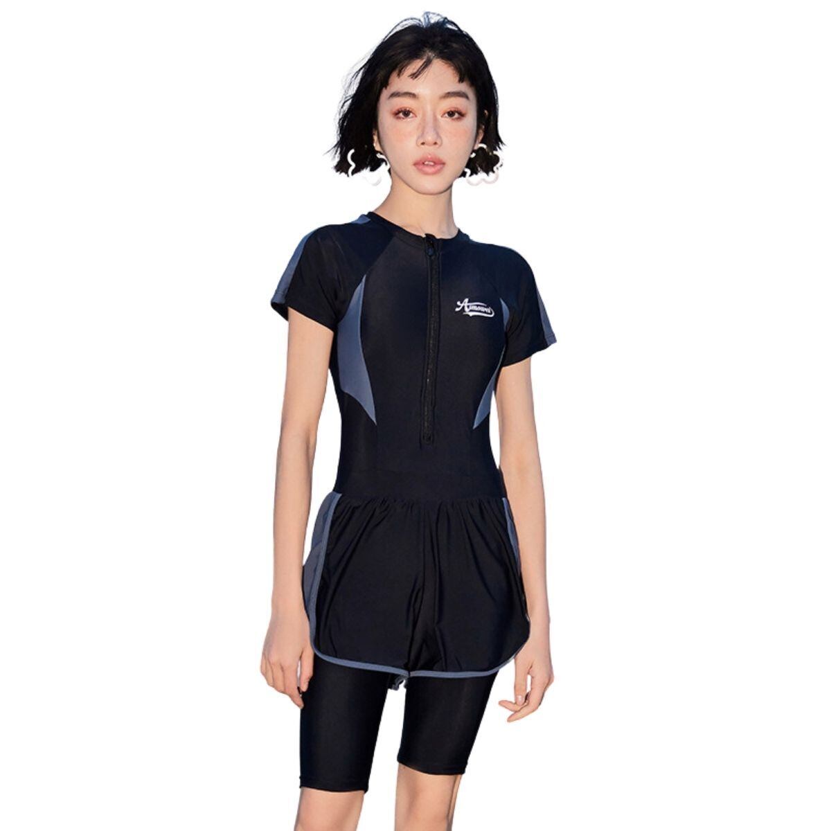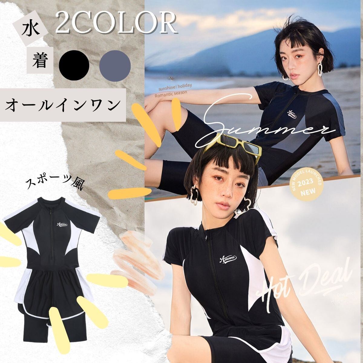 とてもユニークなオールインワンのスポーツ水着です。普通のオールインワン水着と違ってデザイン性が高く、単調になりません。タンキニ水着のゆったり感と、オールインワン水着の安心感があります。黒とグレーがあります。どちらもシックな印象を与えてくれます。