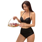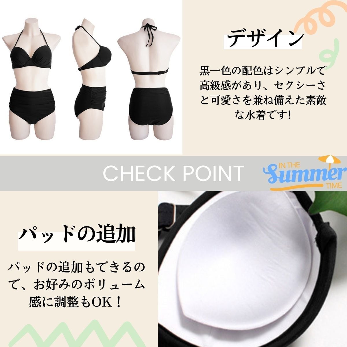黒一色の配色はシンプルで高級感があり、セクシーさと可愛さを兼ね備えた素敵な水着です!胸もとのカシュクールがリッチでスタイリッシュな印象に。年齢やファッションスタイルを問わず着用いただける、シンプルなデザインが人気のスイムウェア。