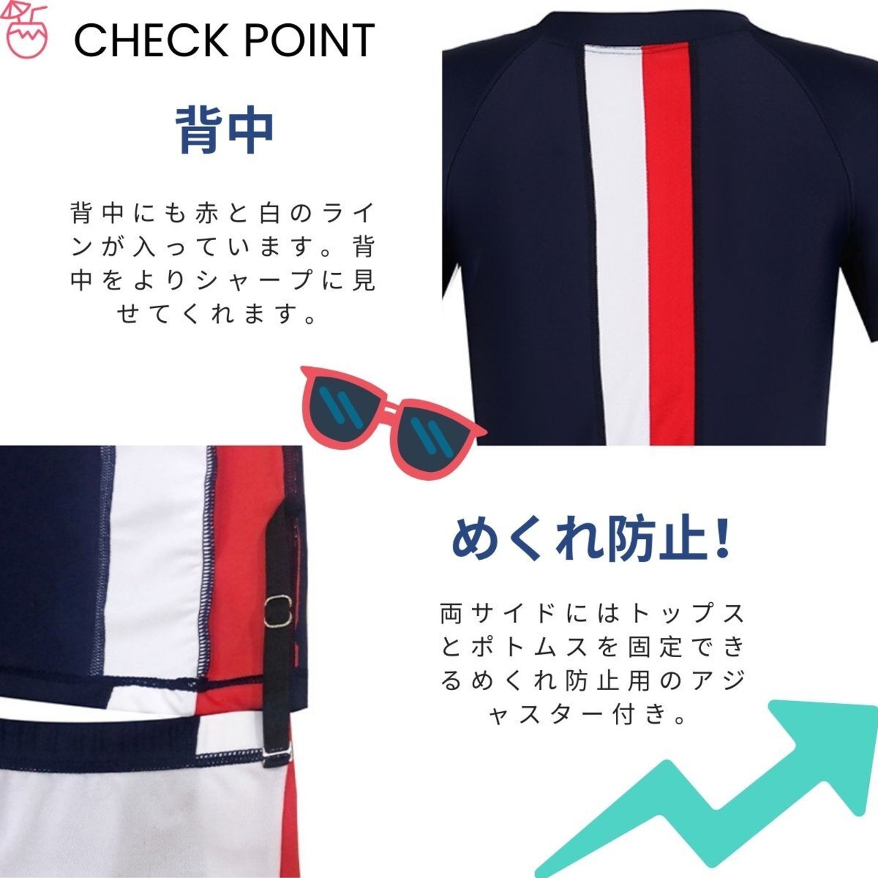 【2点セット】半袖ラッシュガード+ショートパンツお得な2点セットなタンキニです。水着の色はダークグルーで、夏にぴったりです。サイドには、半袖ラッシュガードとショートパンツに白と赤のラインが入っていて目を引き、よりスタイルを引き締めてくれます。