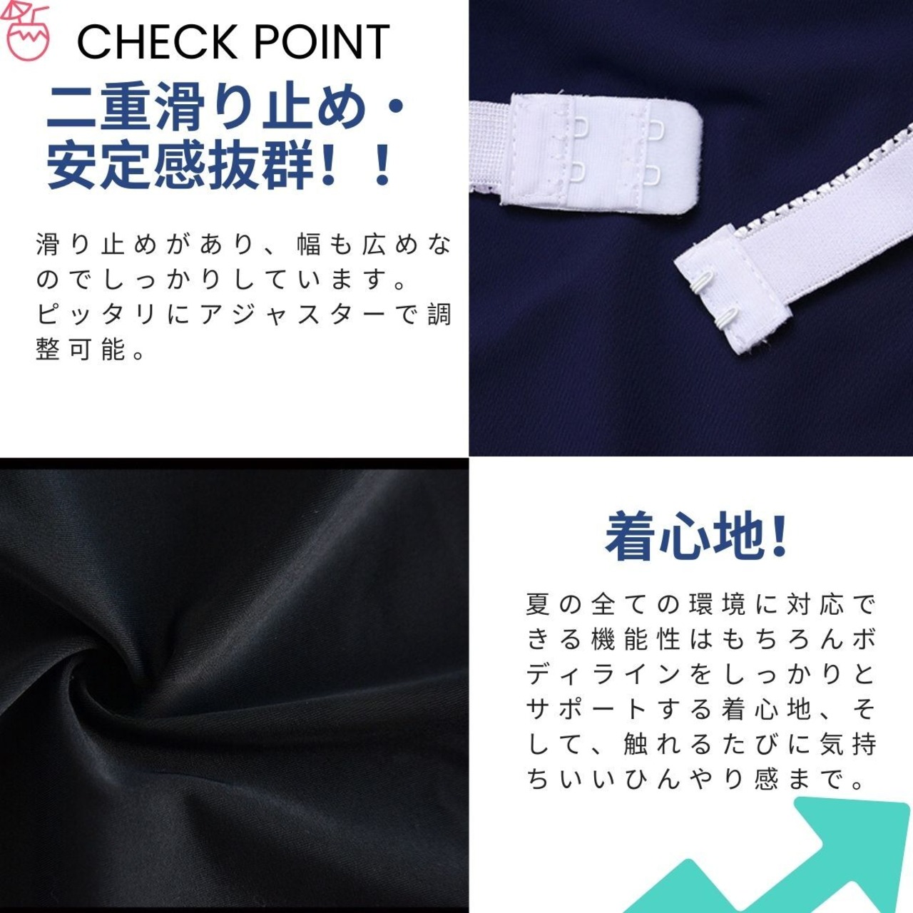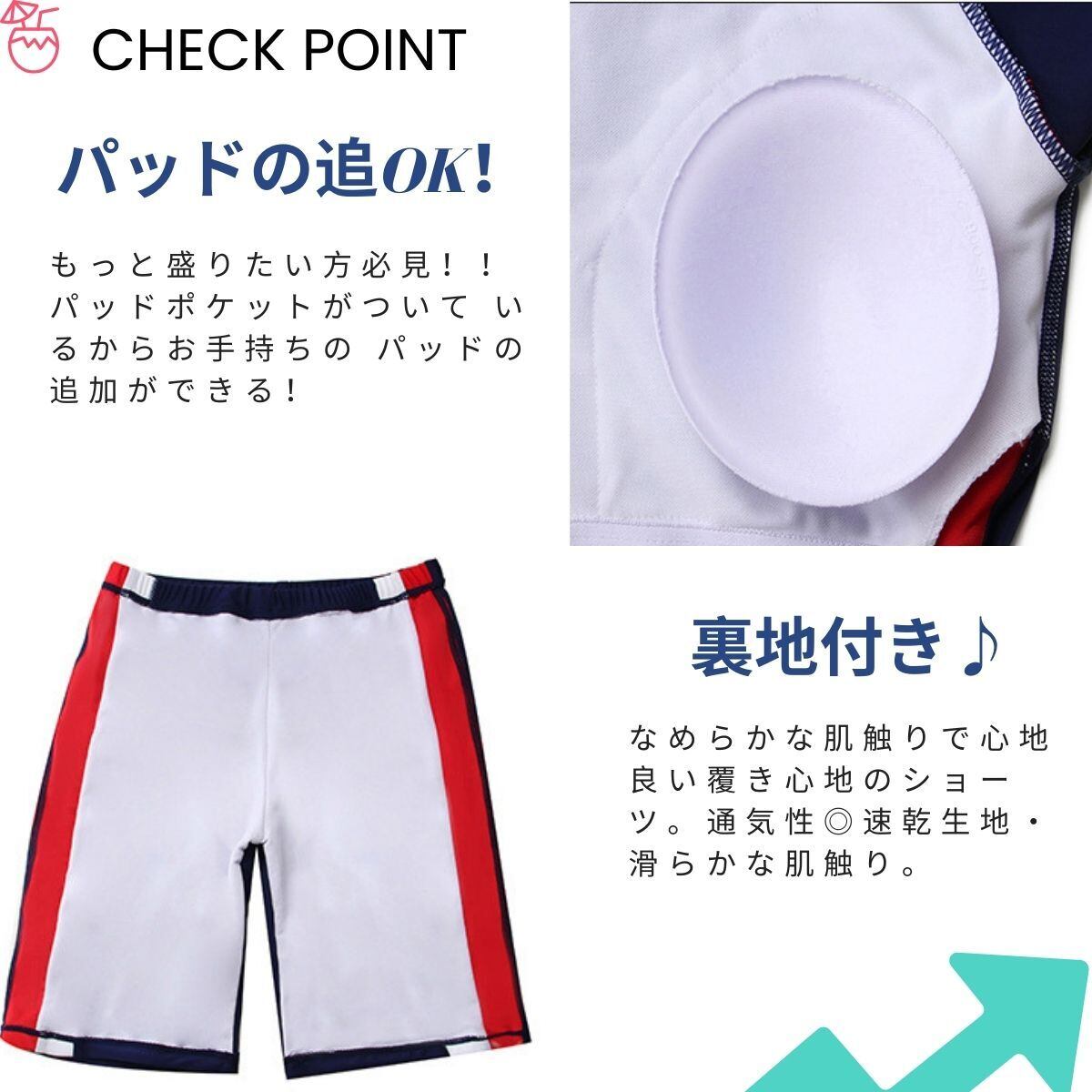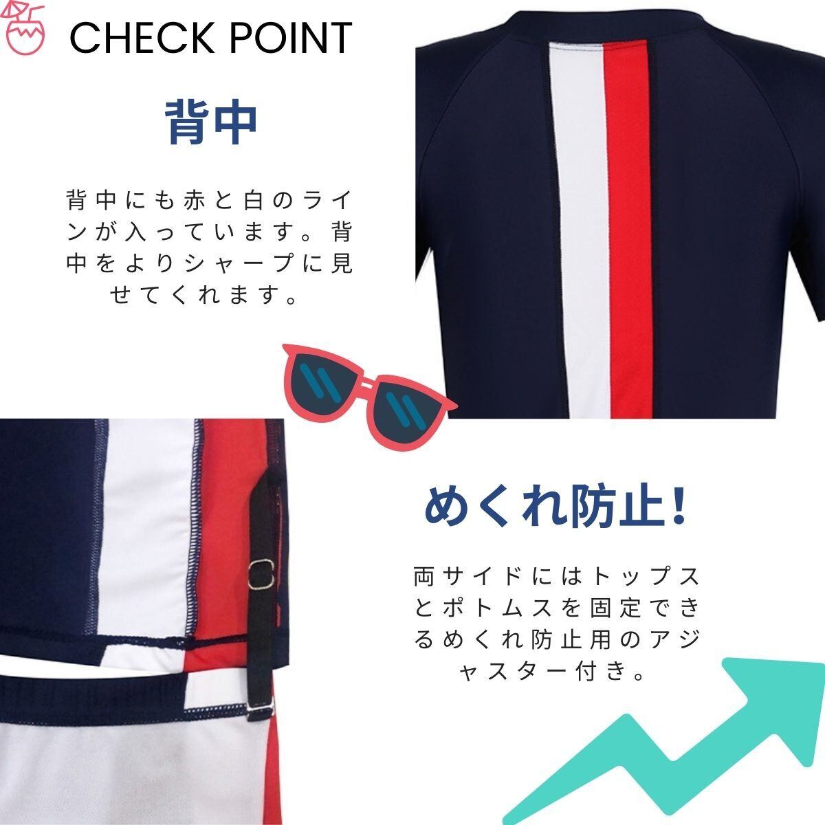 背中にも赤と白のラインが入っています。背中をよりシャープに見せてくれます。夏の眩しい太陽の下でも安心、日焼け防止効果も期待できる水着です。お腹周りとヒップもさりげに カバーできる。期待させてくれる水着です。ブラカップはノンワイヤーでストレスフリー!