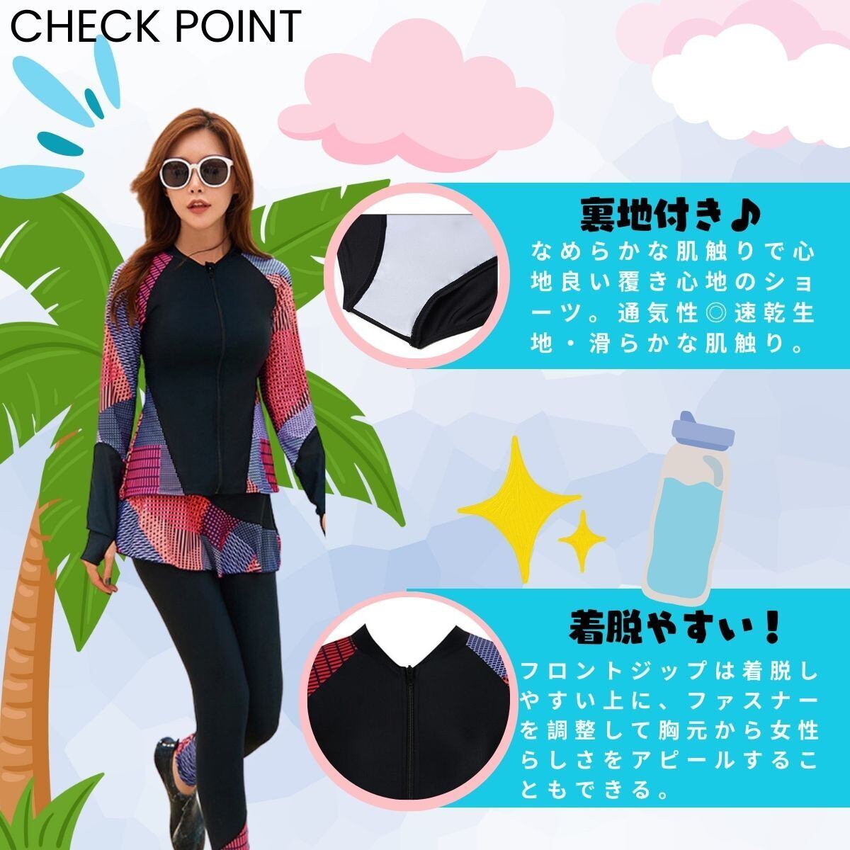 【贅沢5点セット】長袖ラッシュガード+スポーツブラ+スカート+ショートパンツ+レギンス。ソフトな肌触りの冷感素材を使用、良い着心地と抜群の耐久性、ストレッチが効いているので動きやすいです。全身セットで徹底カバー!オシャレとカバーどちらも叶う!