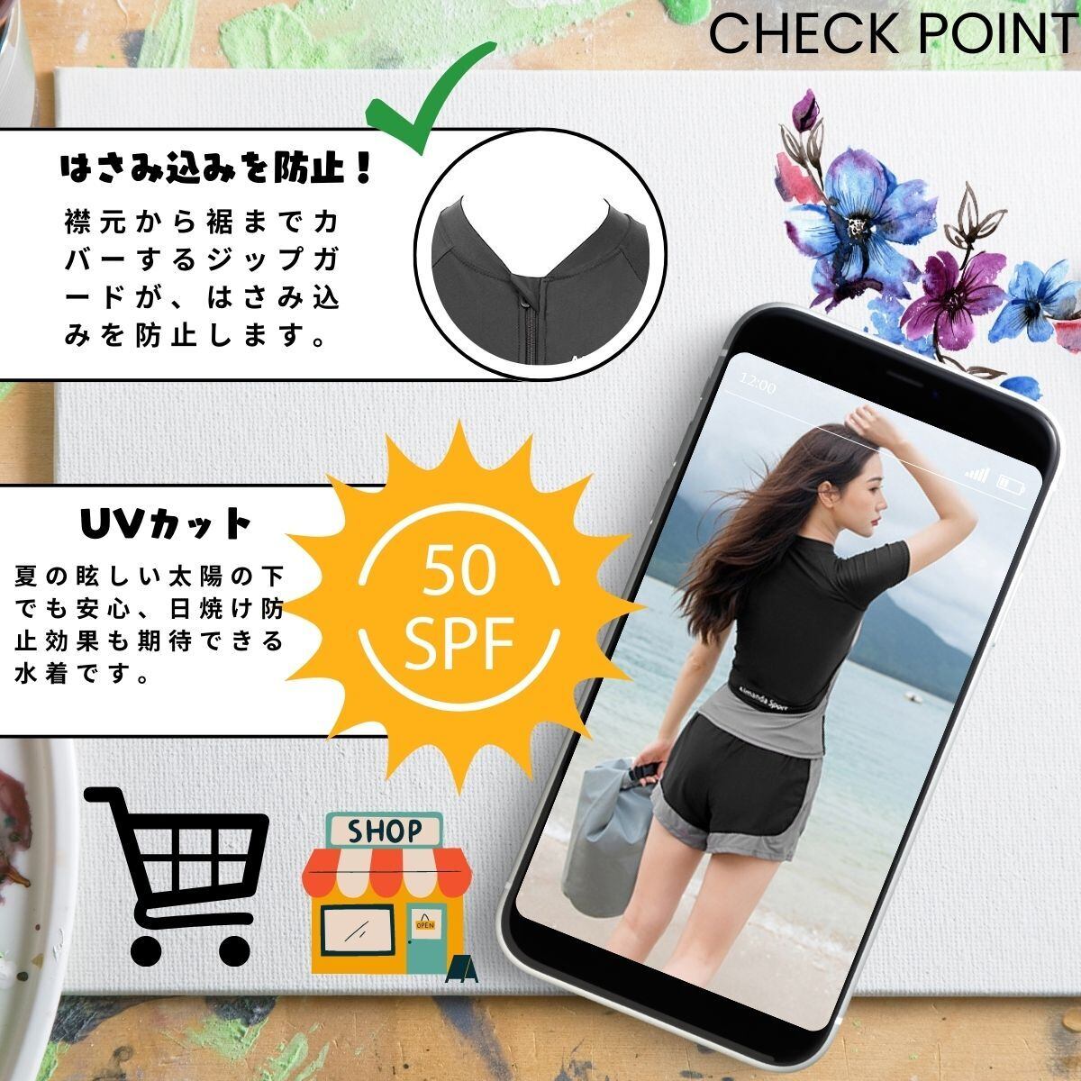 フロントジッパーは着脱しやすい上に、ジッパーを調整して胸元から女性らしさをアピールすることもできます。夏の眩しい太陽の下でも安心、日焼け防止効果も期待できる水着です。両サイドにはトップスとポトムスを固定できるめくれ防止用のアジャスター付き。