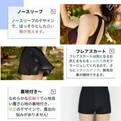 露出抑えめが嬉しい◎スカートの下、体型ショートパンツ付きます。フレアスカートは気になるお尻と太ももをふんわりカモフラージュしてくれるので、さらにスタイルアップ、脚長効果が期待できます。透け感のある軽やかな水着で、夏の暑さを感じさせない爽やかガールに。