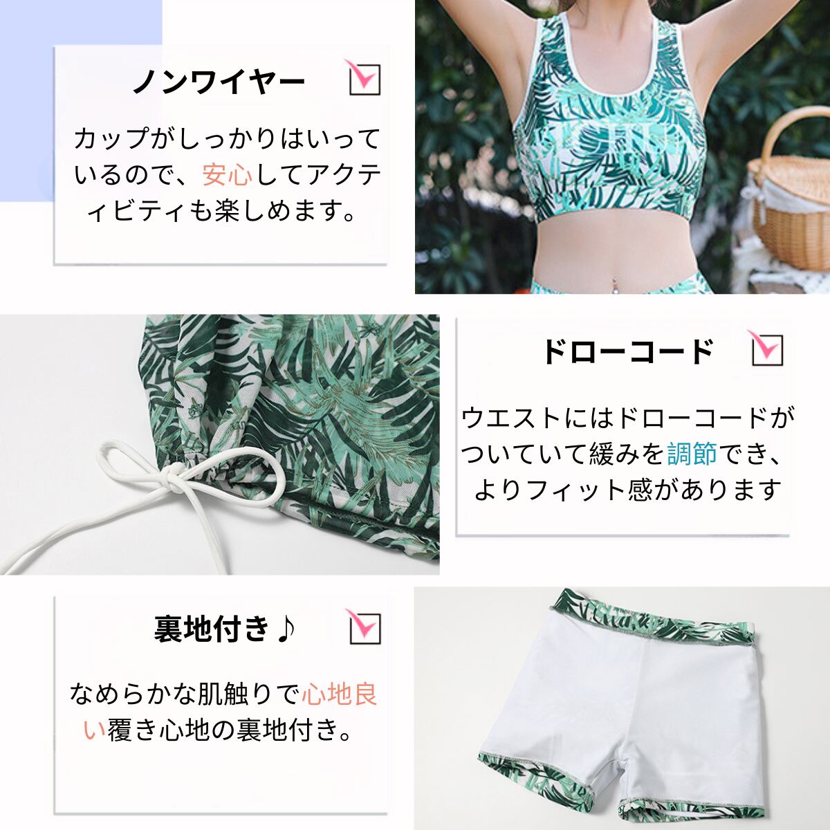 ボタニカル柄の水着はハワイの雰囲気で、リゾート旅行にぴったりです。脇高設計でサイドも安心の綺麗ライン。ブラカップはノンワイヤーでストレスフリー!カップがしっかりはいっているので、安心してアクティビティも楽しめます。ウエストにはドローコードがついていて緩みを調節でき、よりフィット感があります