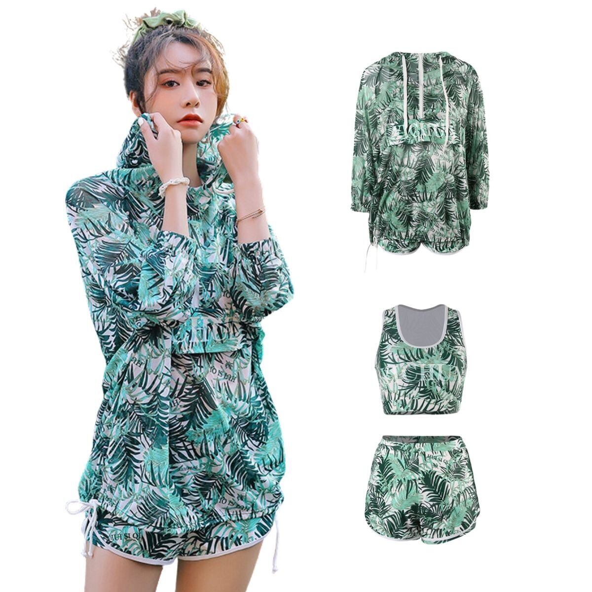 【3点セット】ラッシュガード+ショートパンツ+スポーツブラお得な3点セットなタンキニです。ラッシュガードはフード付きなので、頭が手首もしっかり覆えるので、室内の冷房対策もとして使えます!絶対焼けたくない!日常生活からレジャー・スポーツ まで幅広いシーンで使用可能。