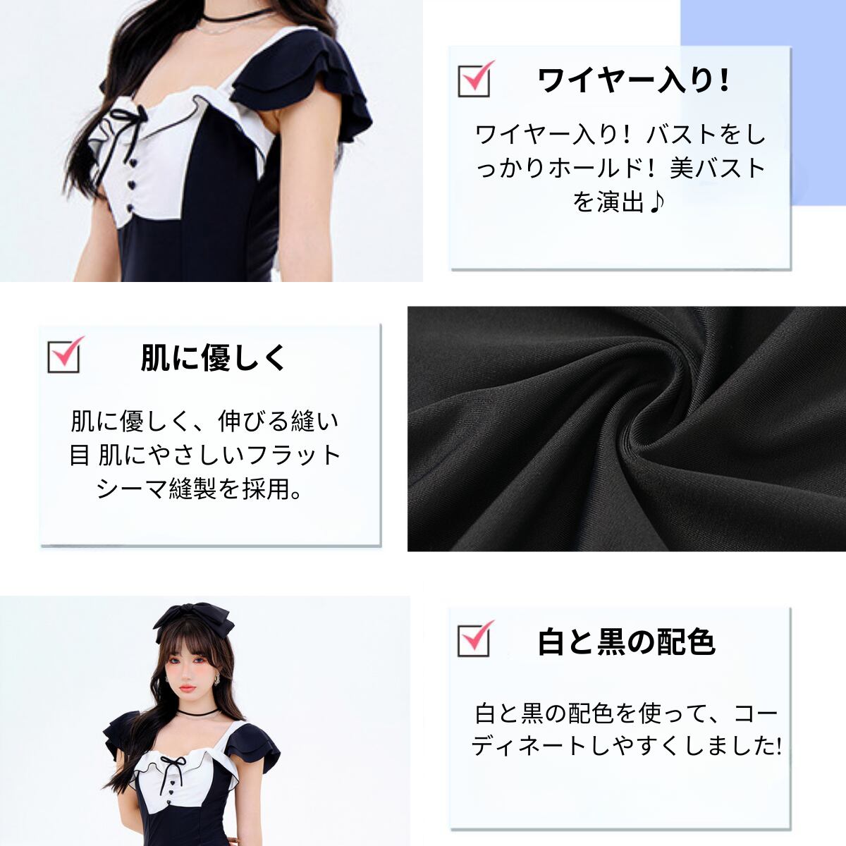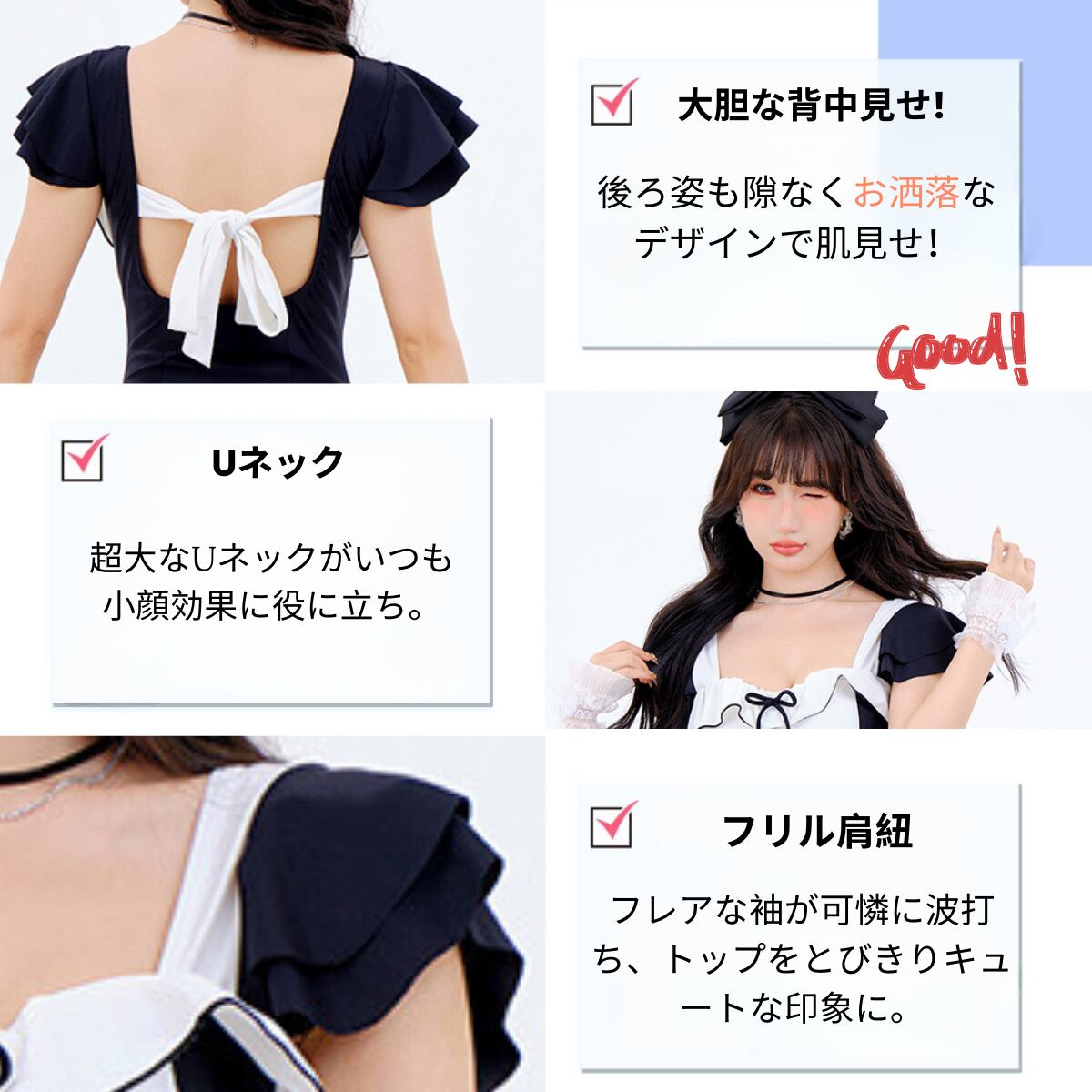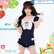 可愛い甘めのワンピース水着です!かわいい要素がたくさん入っています!ウエスト、背中、胸元にリボンの飾りがついていてとても可愛いです。フレアな袖が可憐に波打ち、トップをとびきりキュートな印象に。胸元にもフリルがついているので、水着にもふんわり感が出て、胸のボリューム感とデザイン性が増しています。