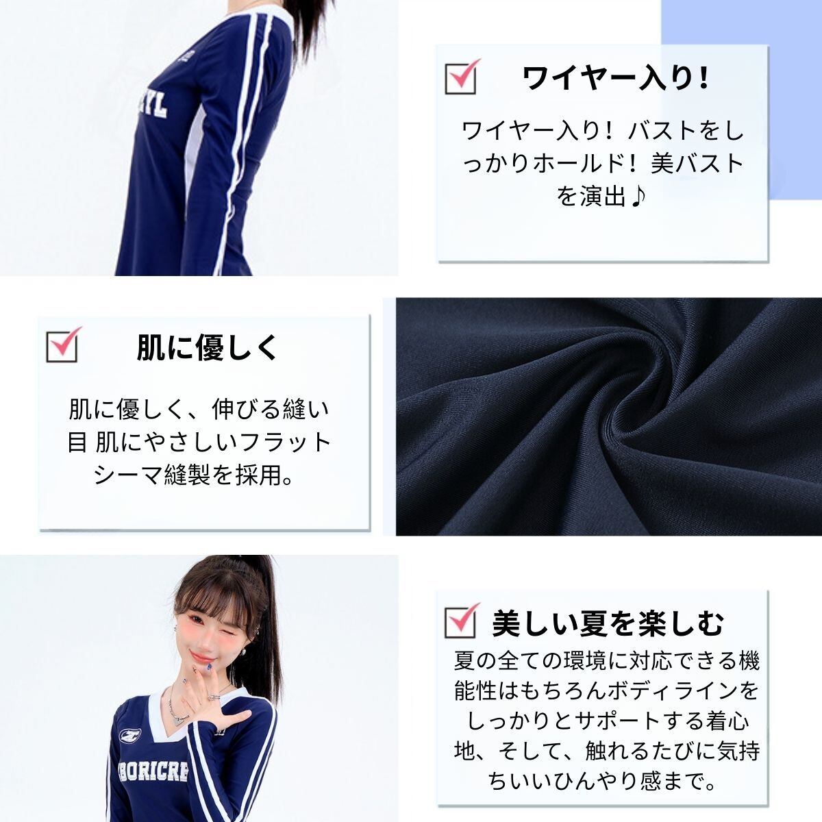 UVカットで強い日差しからお肌を優しくガード!ボトムはシンプルなフォルムで、脚をより長く美しく魅せます。肌に優しく、伸びる縫い目 肌にやさしいフラットシーマ縫製を採用。水に濡れてもよく伸びる 縦横に伸縮するストレッチ素材で快適。ハリのある生地で、ますますフィット!