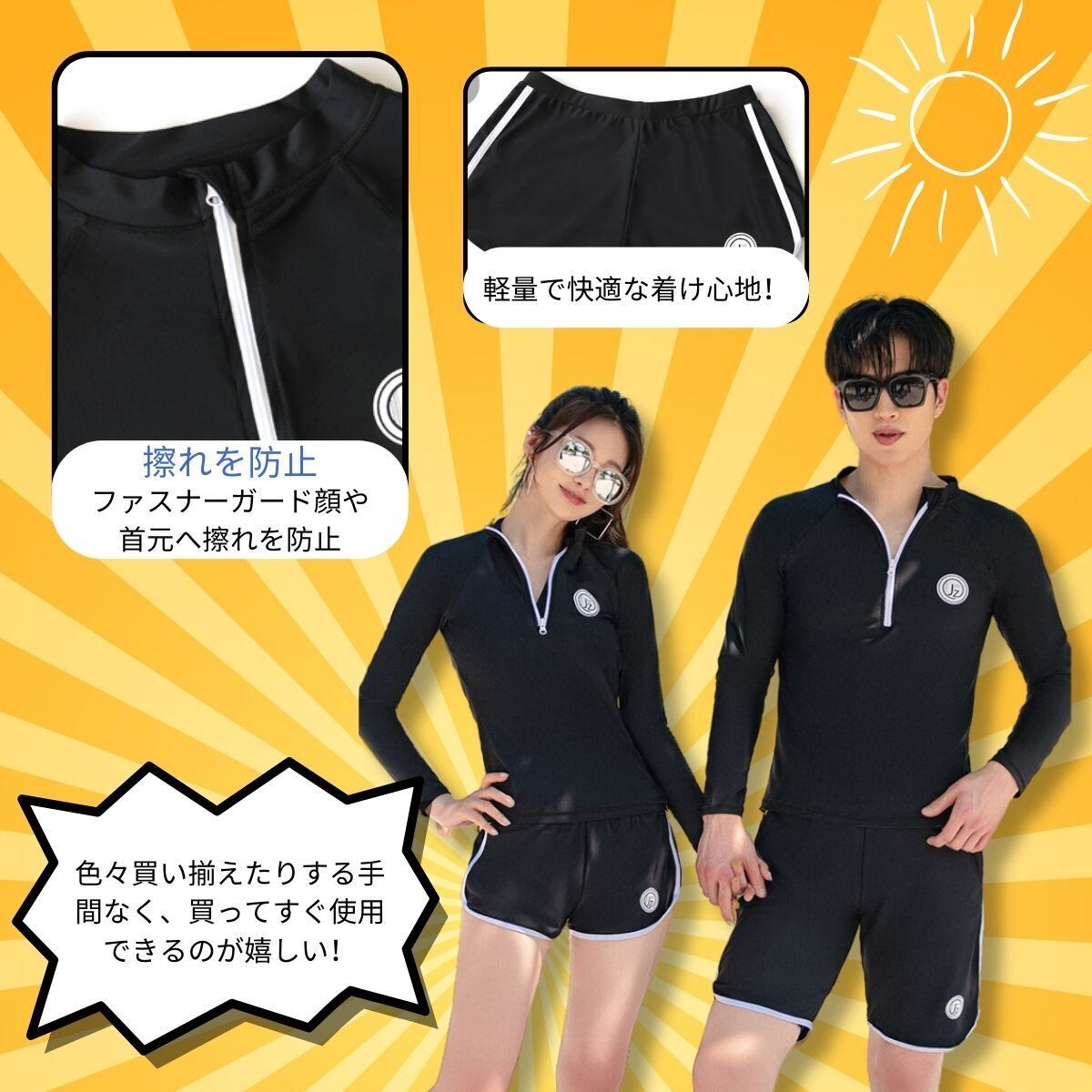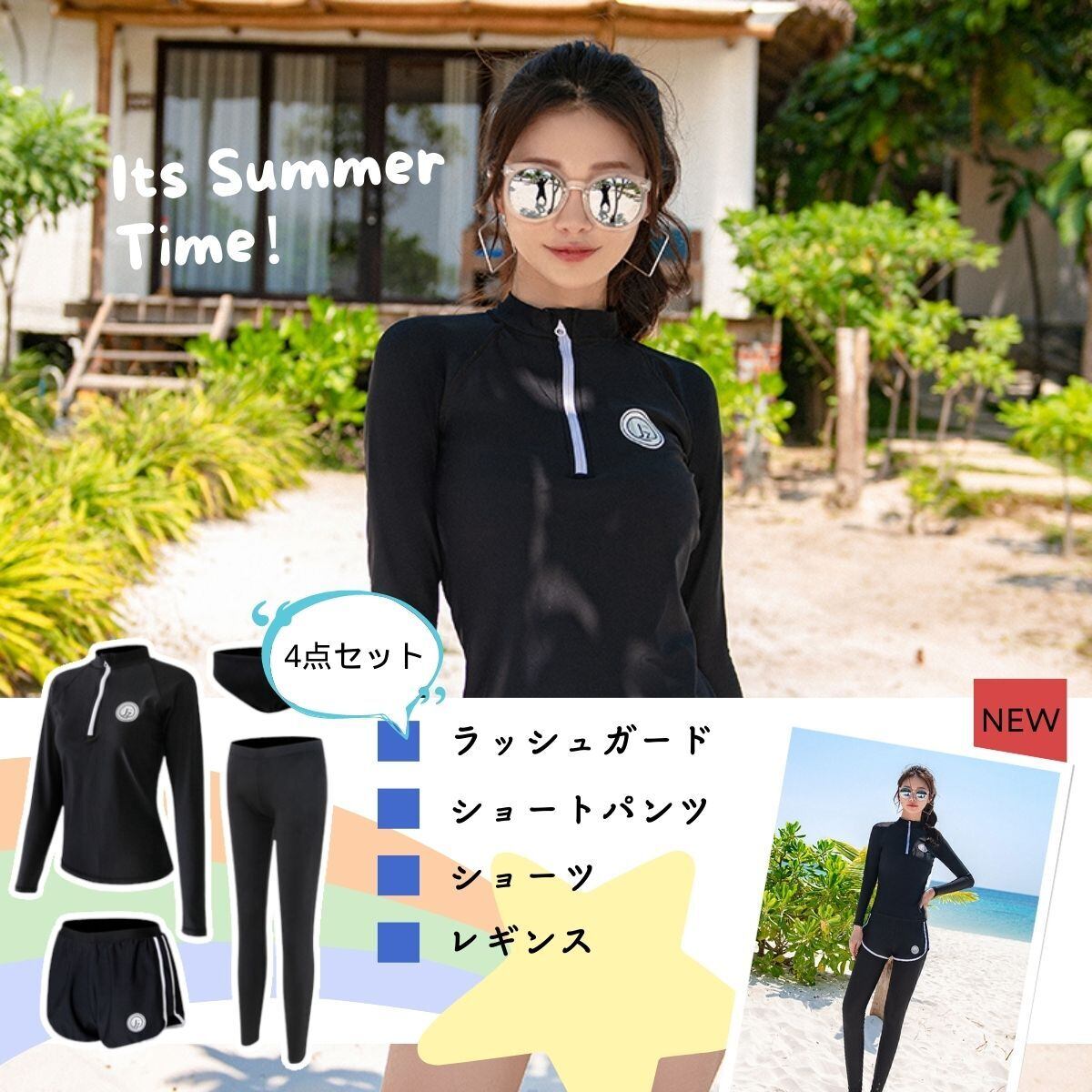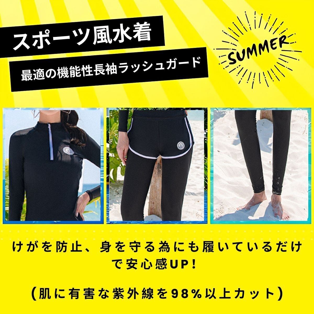 【4点セット】長袖ラッシュガード、ショートパンツ、レギンス、パンツの4点セット。色々買い揃えたりする手間なく、買ってすぐ使用できるのが嬉しい!夏の全ての環境に対応できる機能性はもちろんボディラインをしっかりとサポートする着心地!
