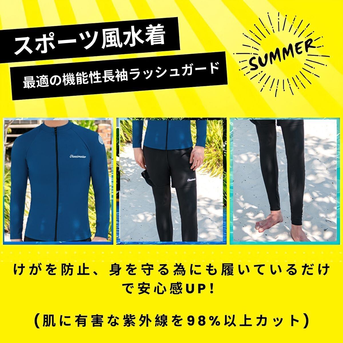 【UVカット】UPF50+生地(肌に有害な紫外線を98%以上カット)使用しているため、「着るだけ」で日焼け予防を完全に実現。ラッシュガード、サーフパンツとレギンスセットで、頭から足首までお肌を守ります。海やプール、アウトドアでの日焼け対策にも大活躍。