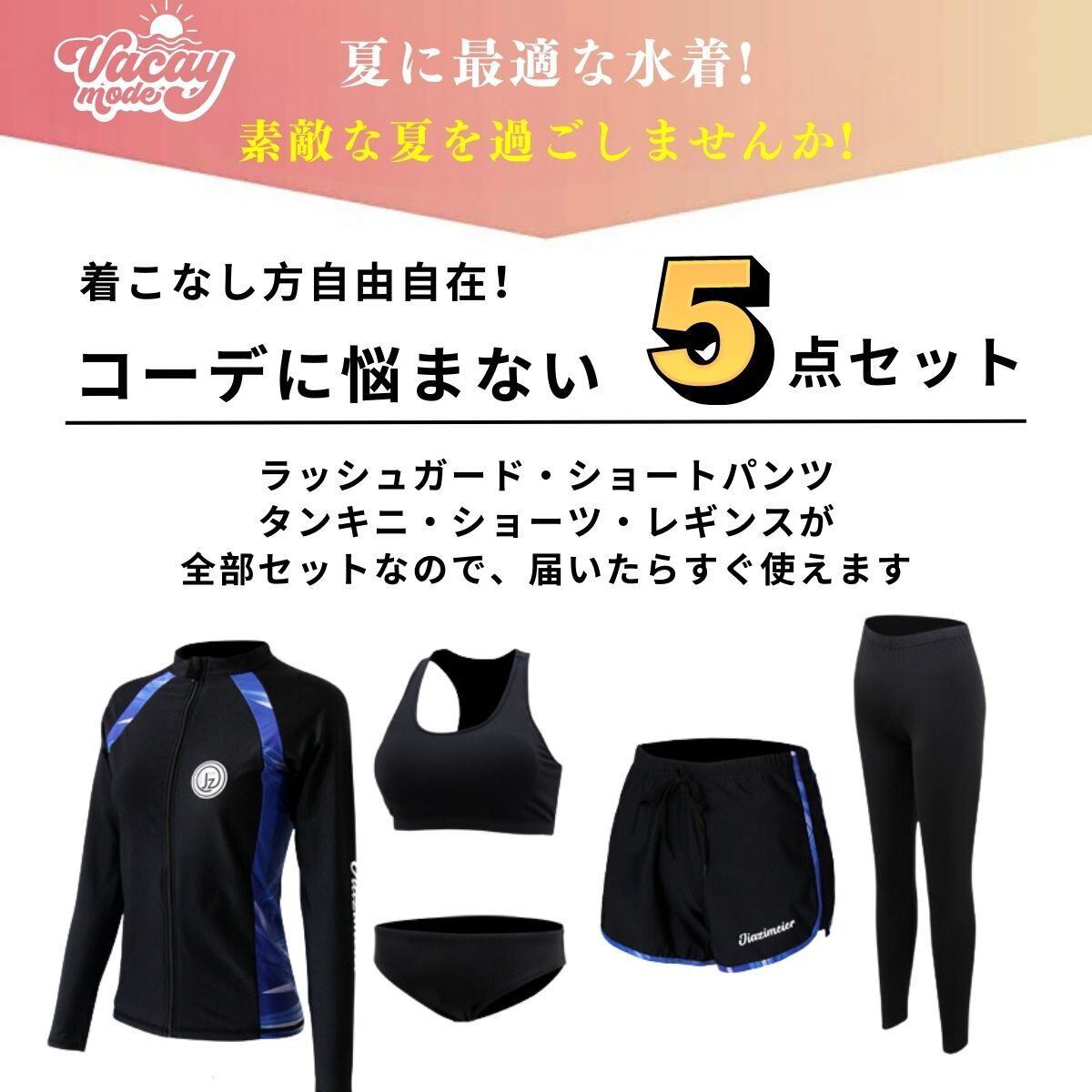 【水着豪華5点セット】ラッシュガード+ショートパンツ+レギンス+ブラ+ショーツ、使いやすく着回しがしやすい女性用水着5セットで、届いたらすぐに使えます。シンプルなカラーデザインなので着回しは自由自在、シーンに合わせて違った着回しをたのしむことができます!