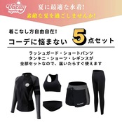 【5点セット】 長袖ラッシュガード、ショートパンツ、レギンス、ビキニ上下の5点セット。大人っぽく爽やかに長袖ラッシュガードで隙なく、日焼け対策もばっちり体型カバー水着。クールで知的な印象大人な雰囲気を醸し出しながらも、可愛さを忘れずにフィットネス水着。
